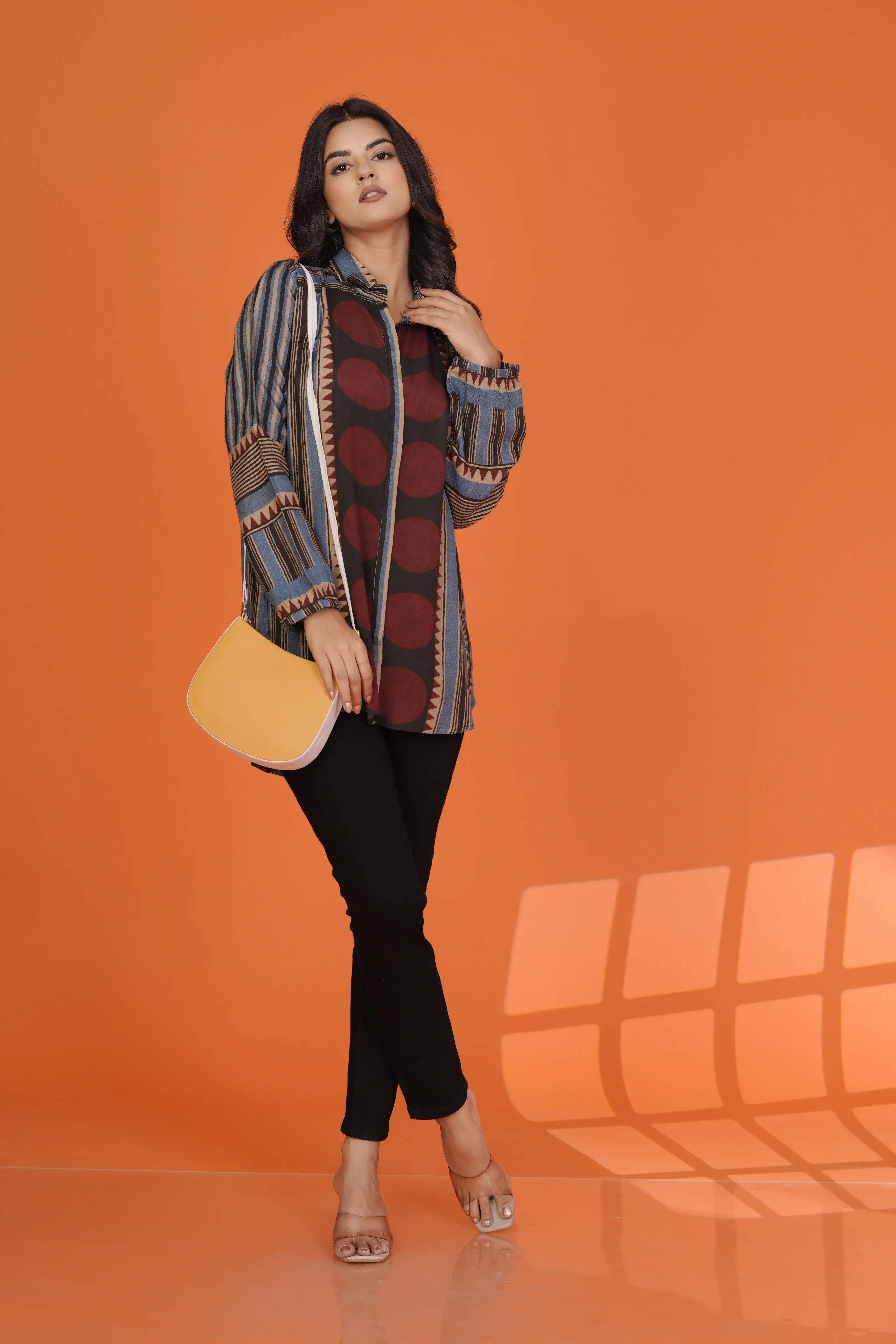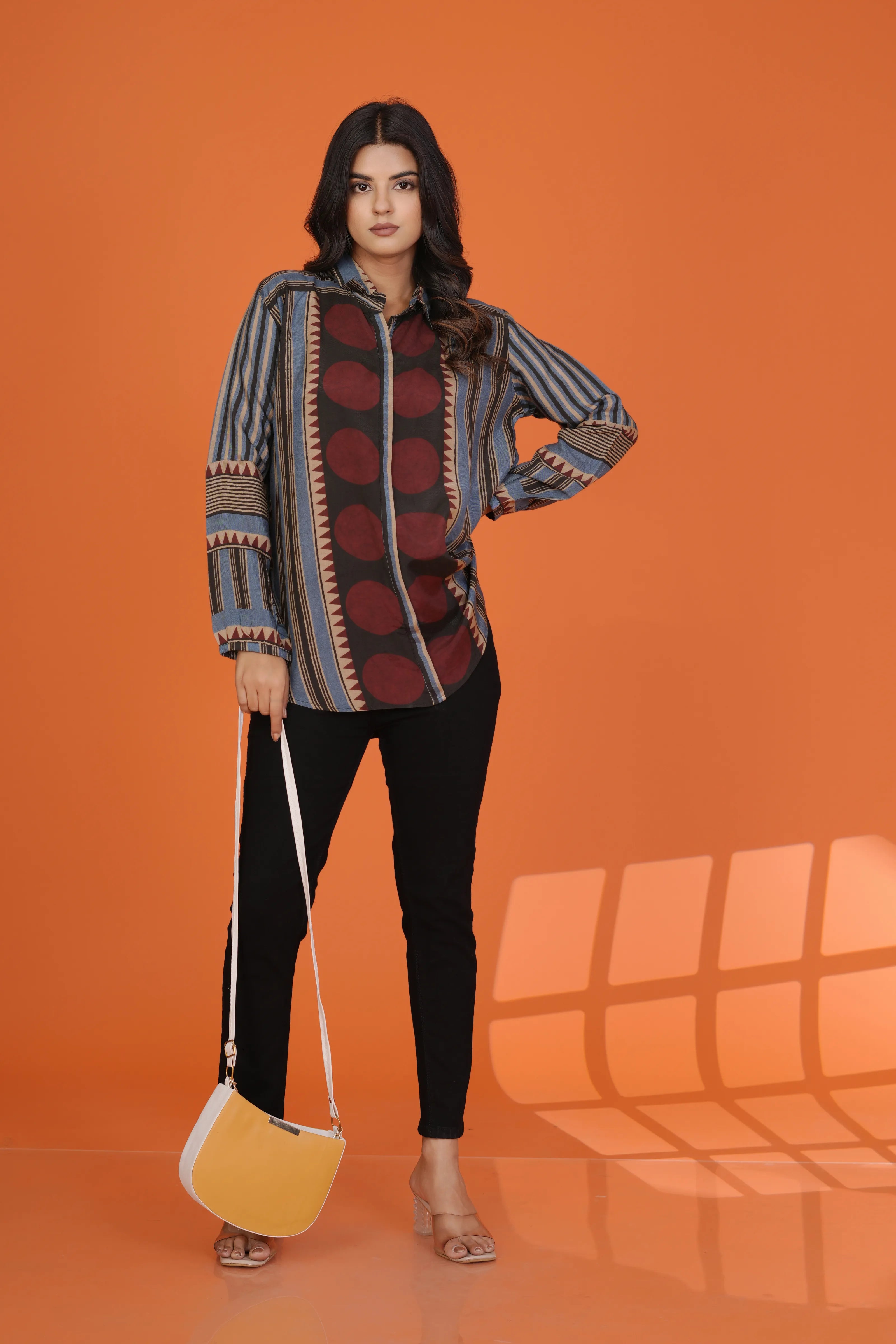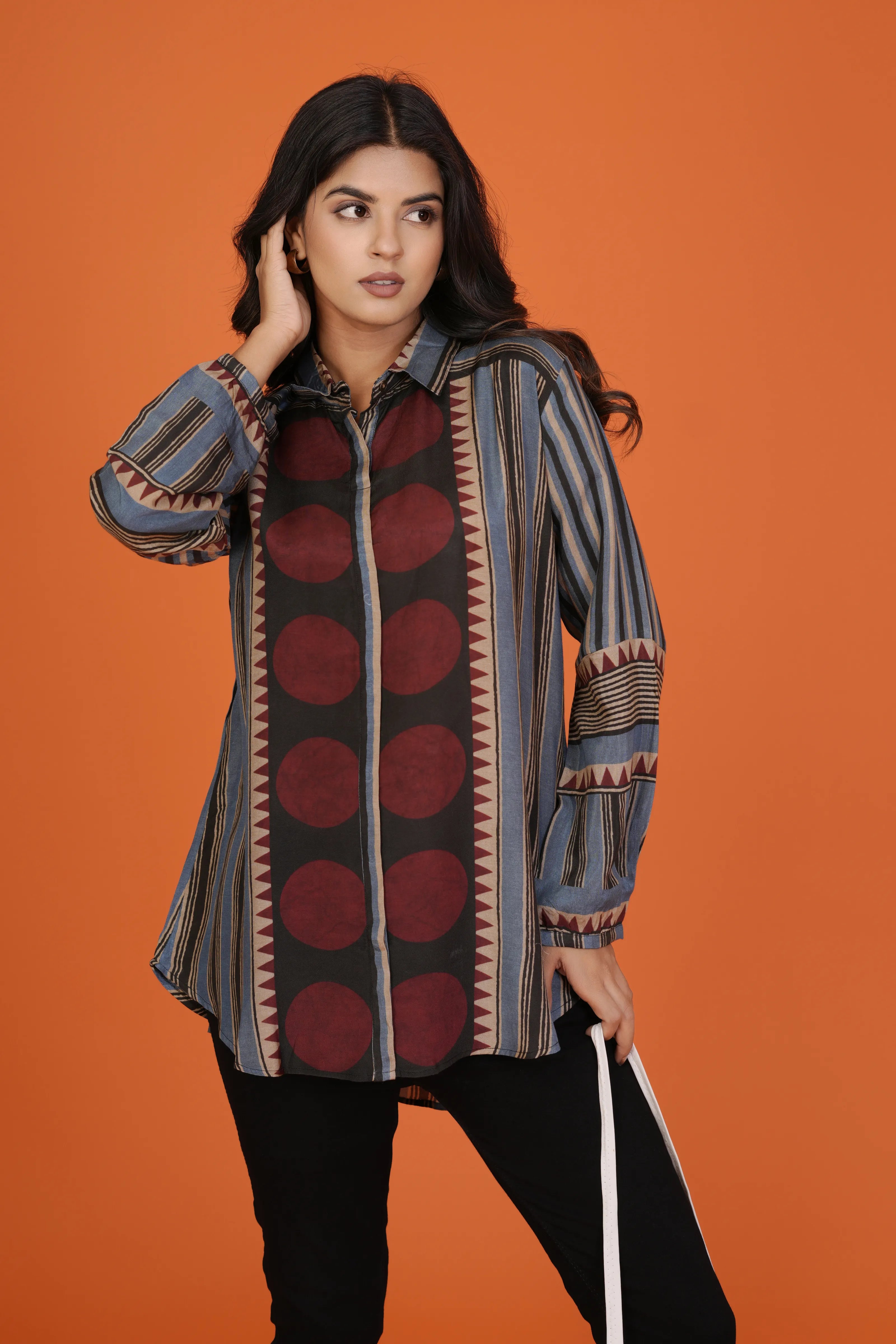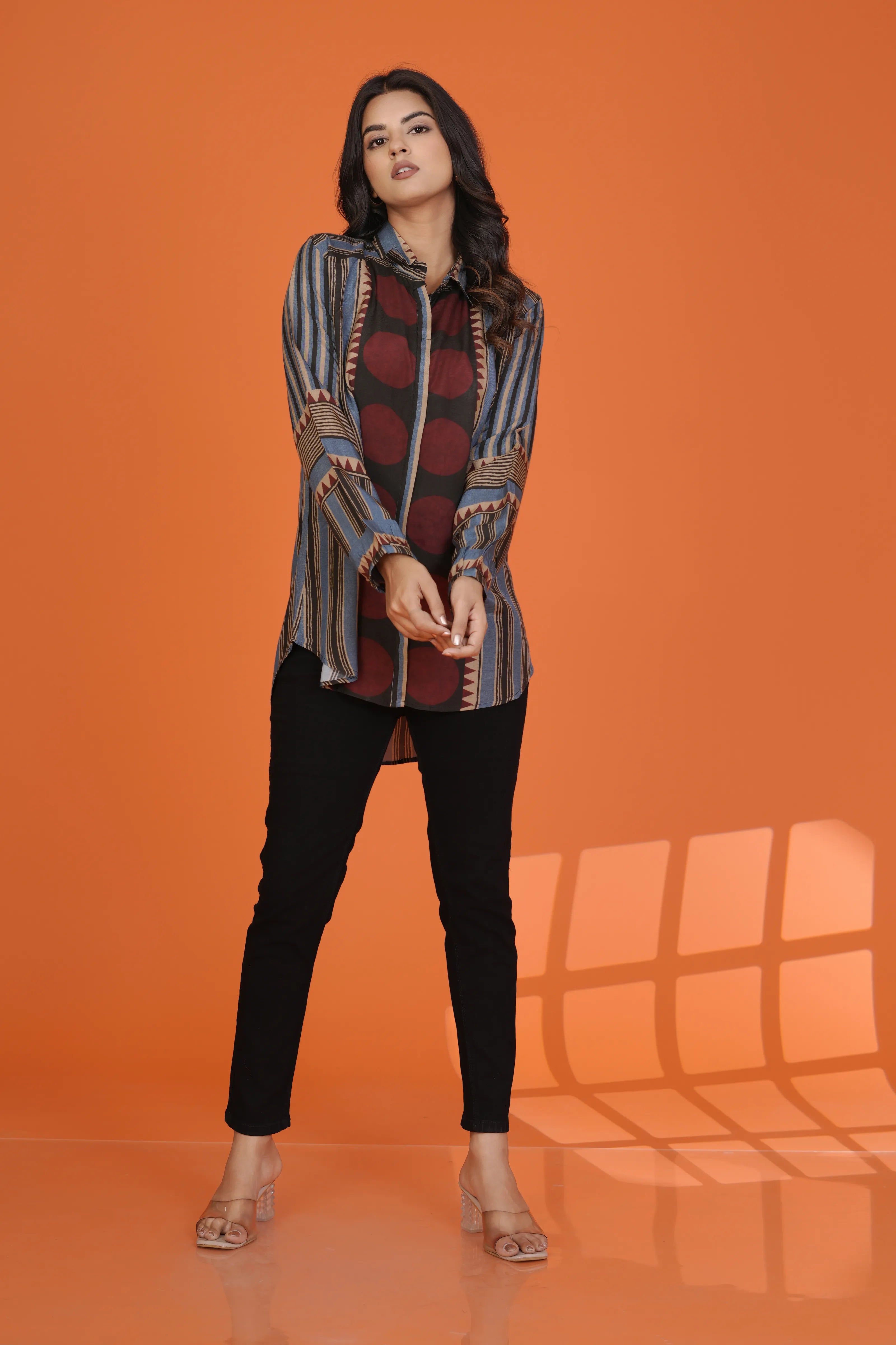 The shirt features a concealed button placket with antique-finish metal buttons, adding a sleek, seamless front. Striking vertical and geometric prints in deep maroon, sky blue, muted beige, and black create visual movement—balanced by striped sleeves and contrasting motifs. The asymmetric hem adds modern dimension, making it ideal for styling tucked, untucked, or layered.