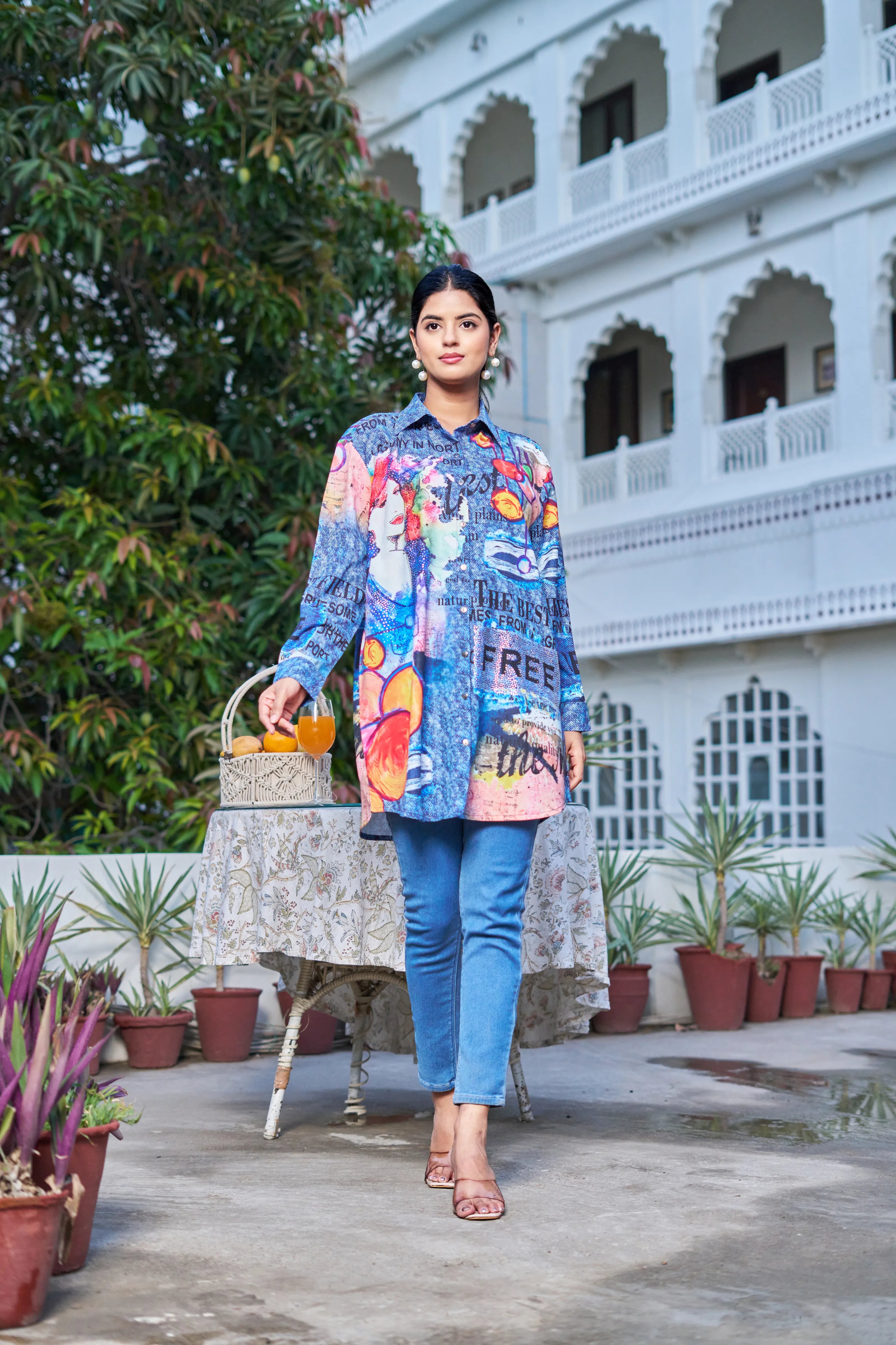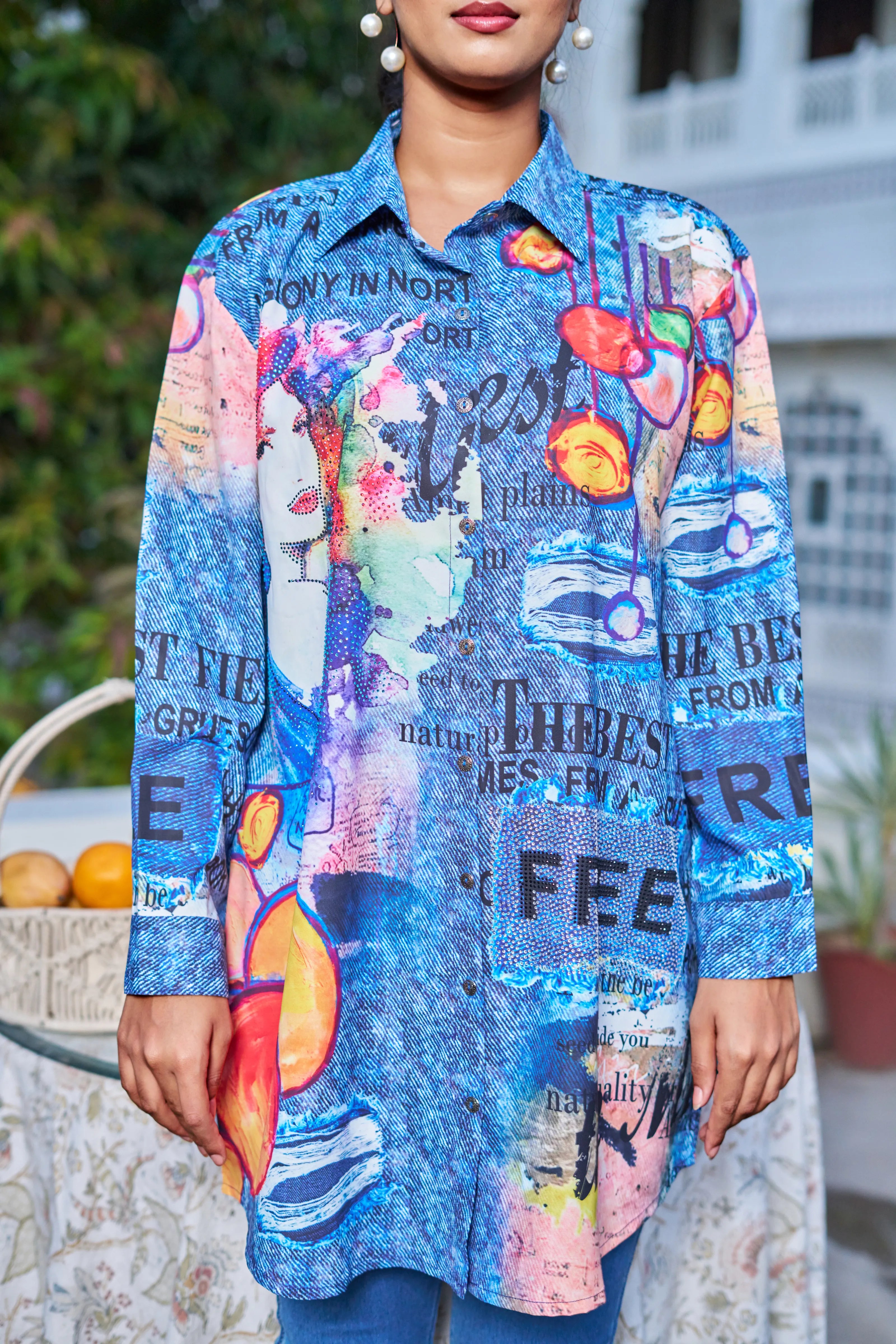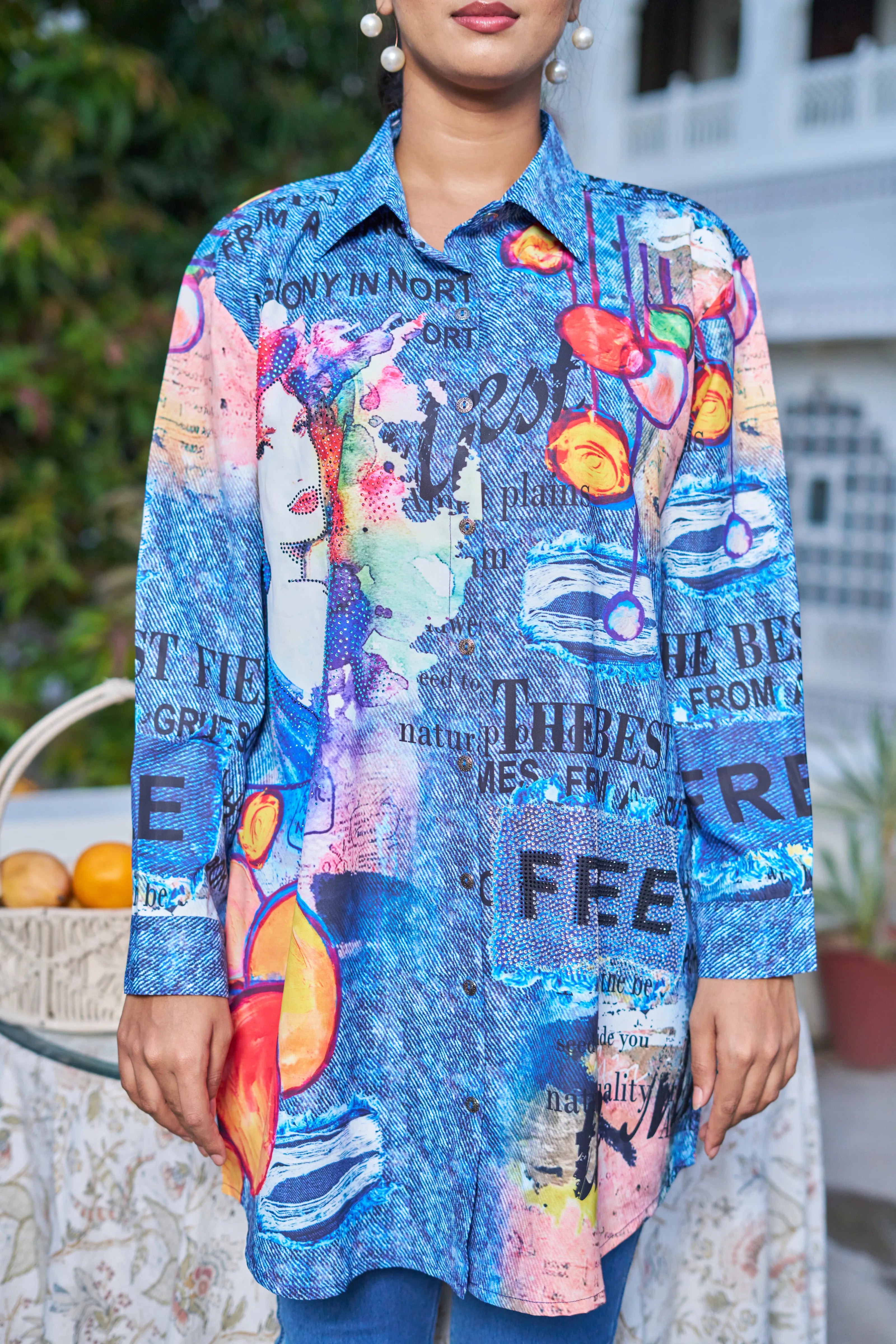 Key Features: • Fabric: Lightweight poly muslin with breathable comfort • Print: Multicolor pop-art with text, portrait elements & abstract visuals • Surface Work: Embedded rhinestones for all-over sparkle • Silhouette: Longline with high-low hem • Neckline: Classic collared shirt neck • Sleeves: Full-length relaxed sleeves with cuff finish • Closure: Front button-down