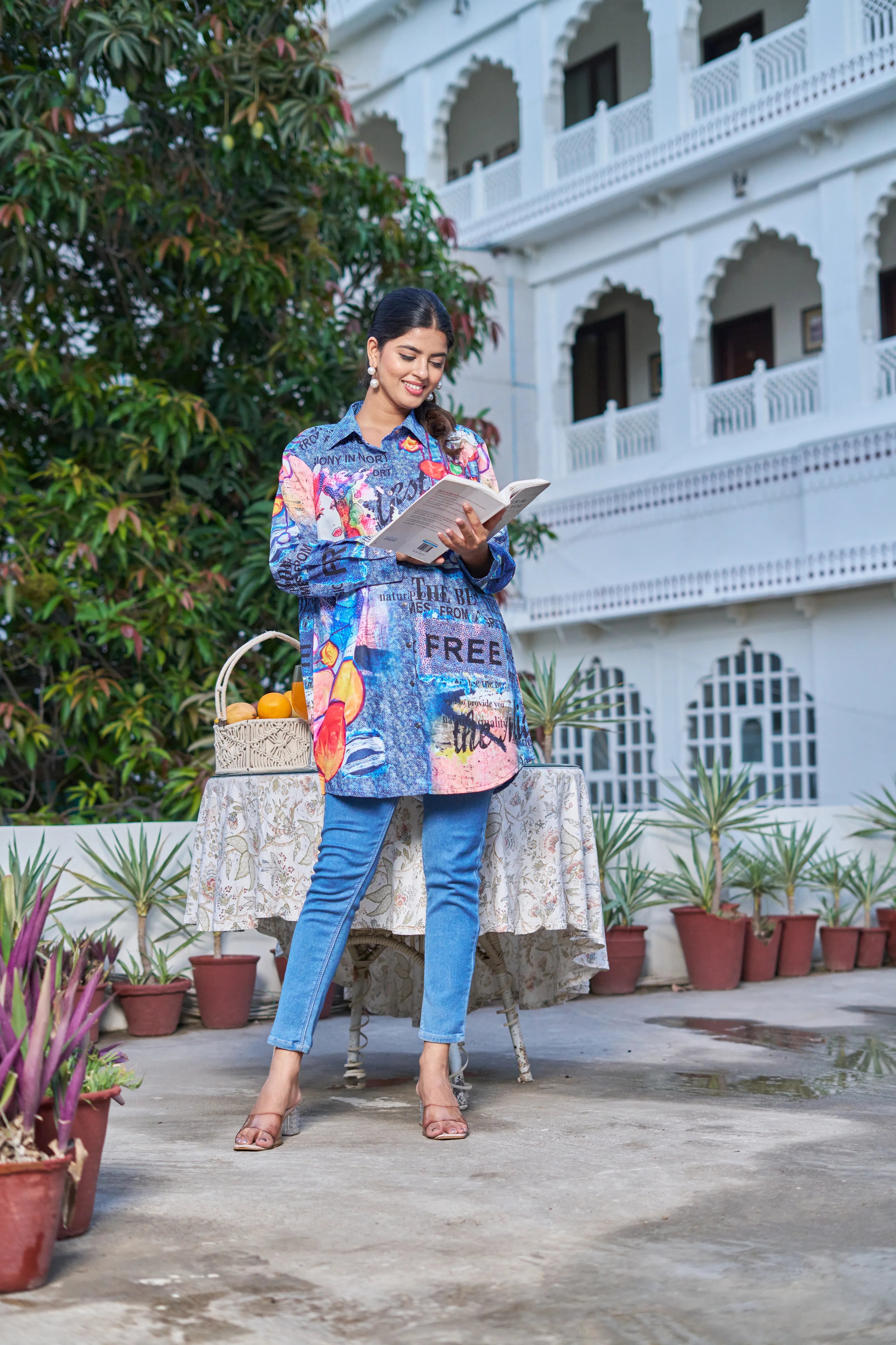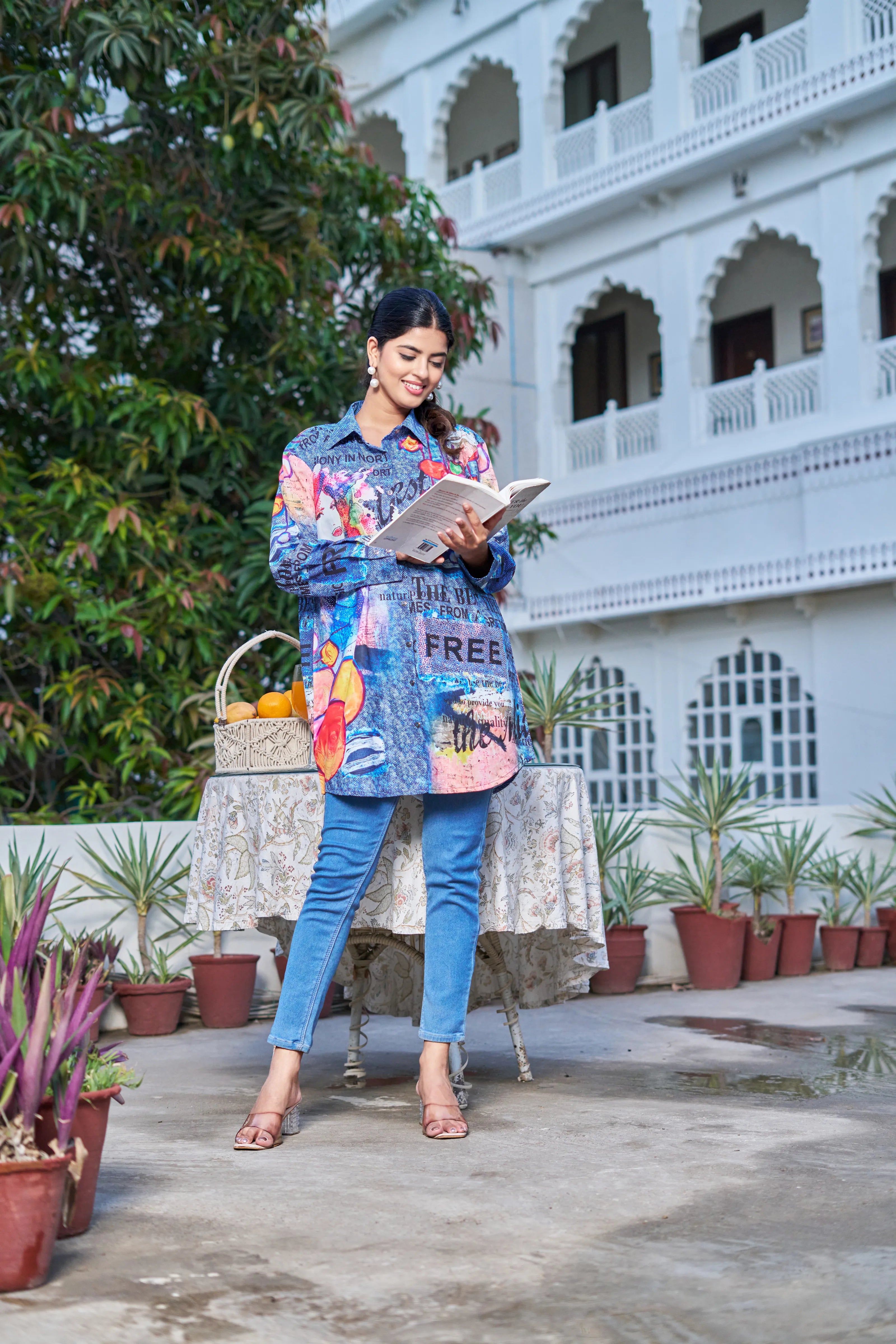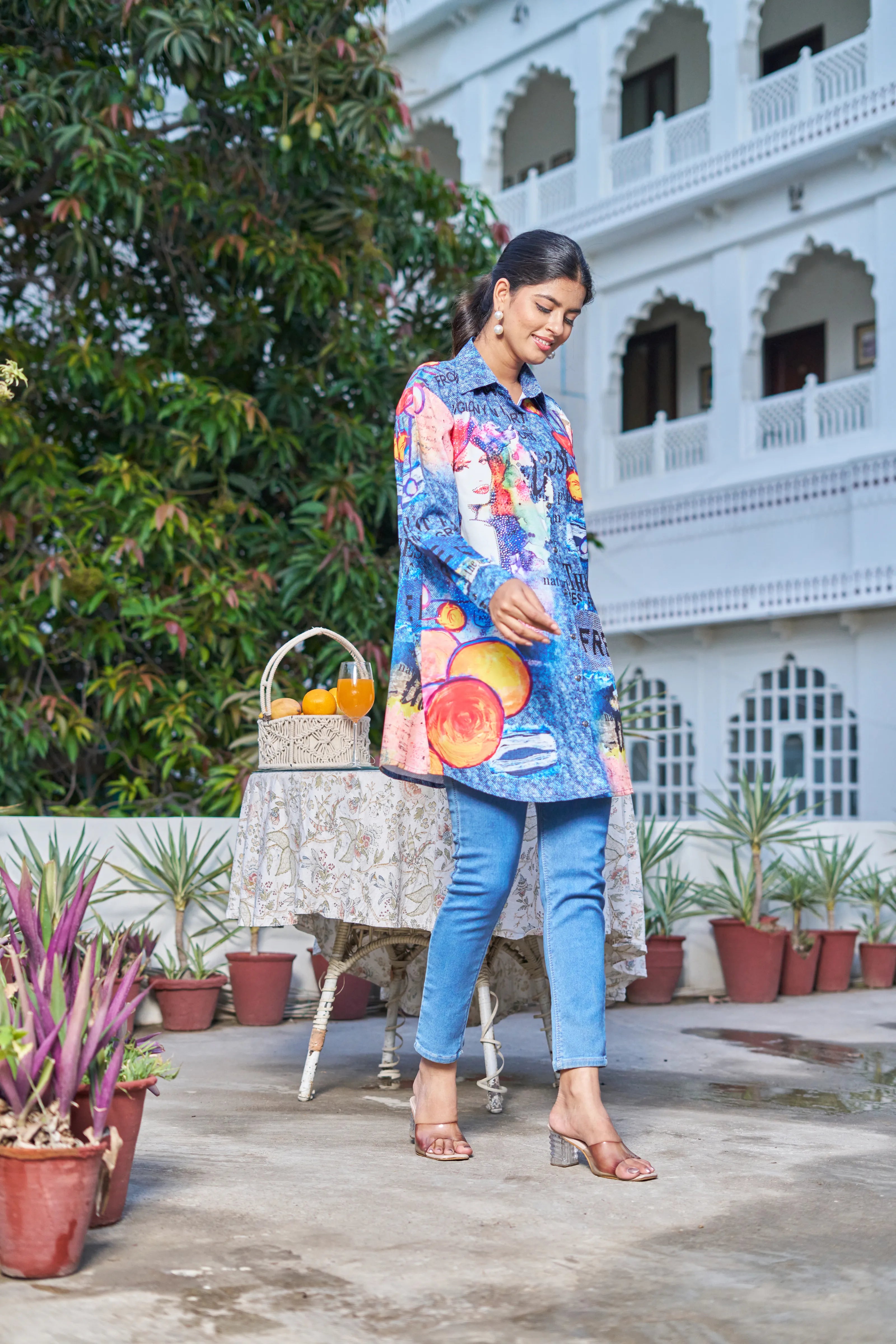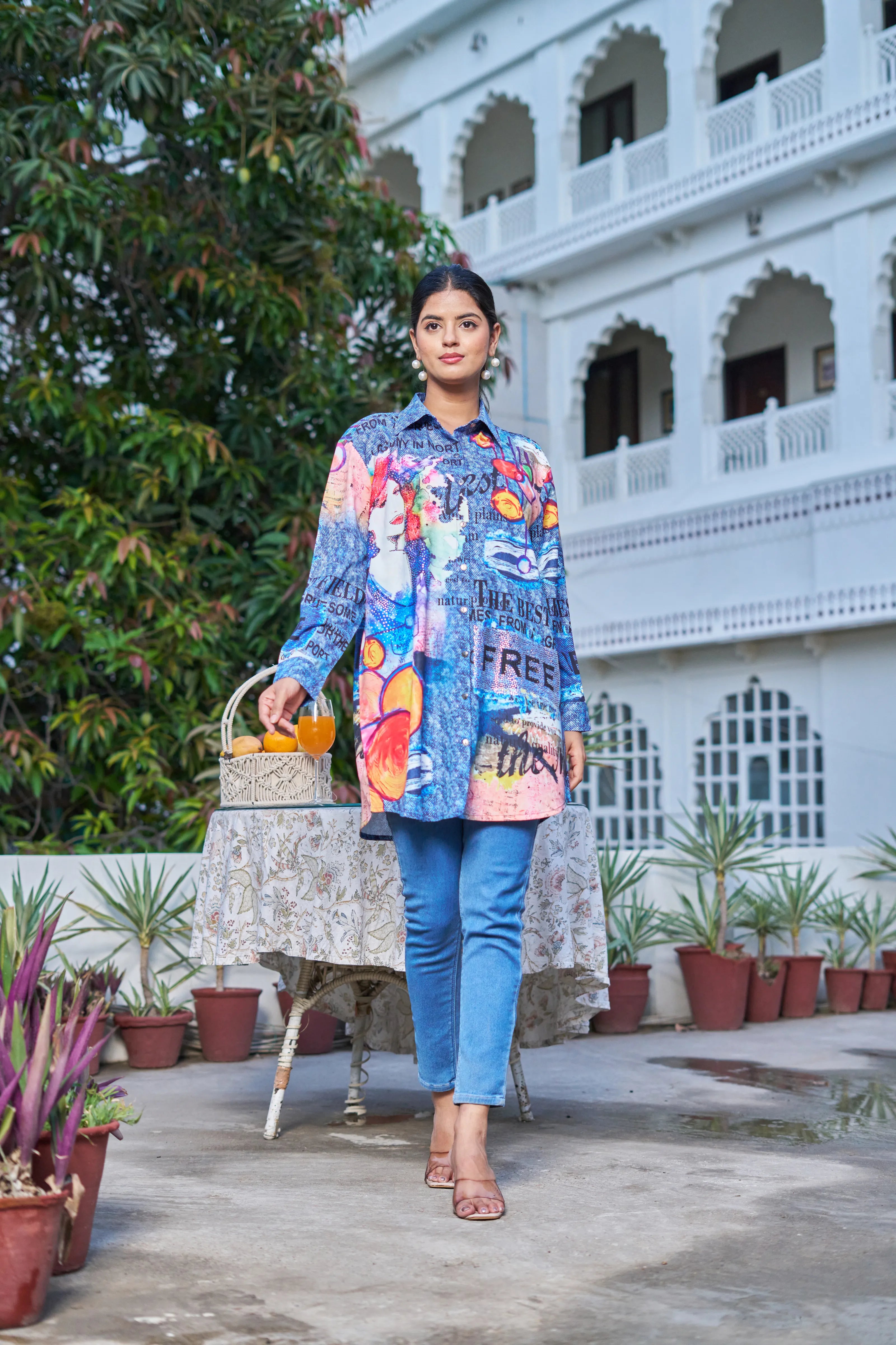 Key Features: • Fabric: Lightweight poly muslin with breathable comfort • Print: Multicolor pop-art with text, portrait elements & abstract visuals • Surface Work: Embedded rhinestones for all-over sparkle • Silhouette: Longline with high-low hem • Neckline: Classic collared shirt neck • Sleeves: Full-length relaxed sleeves with cuff finish • Closure: Front button-down