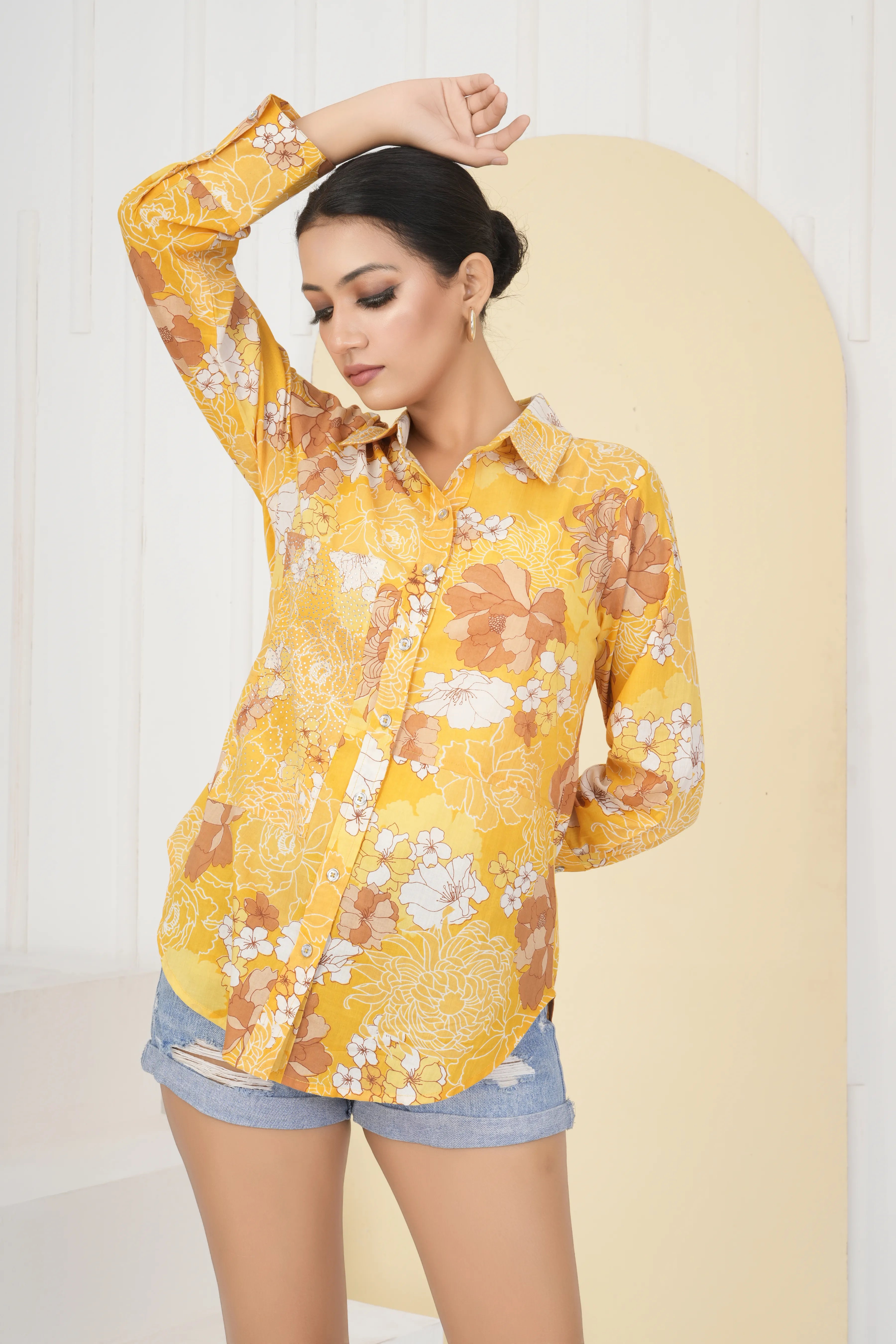 Bring warmth and style to your casual wardrobe with this stunning mustard-colored shirt. Featuring a graceful floral print, this shirt is elevated with sparkling rhinestone embellishments for a hint of glamour. Crafted from soft and breathable cotton cambric, it ensures all-day comfort while exuding a chic, vibrant vibe.