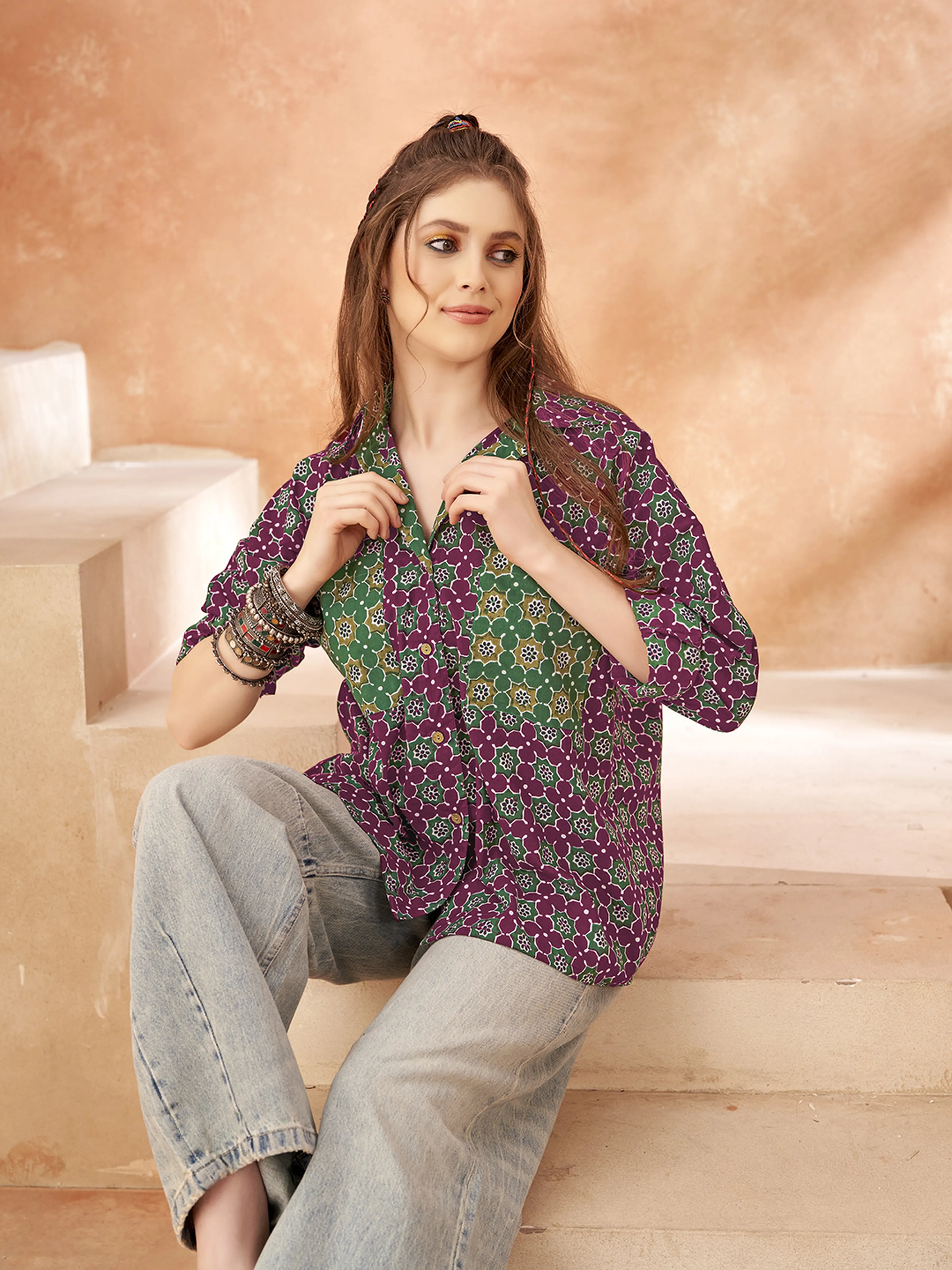 Indigo Star: Purple Base & Green Geometric Cotton Oversized Shirt