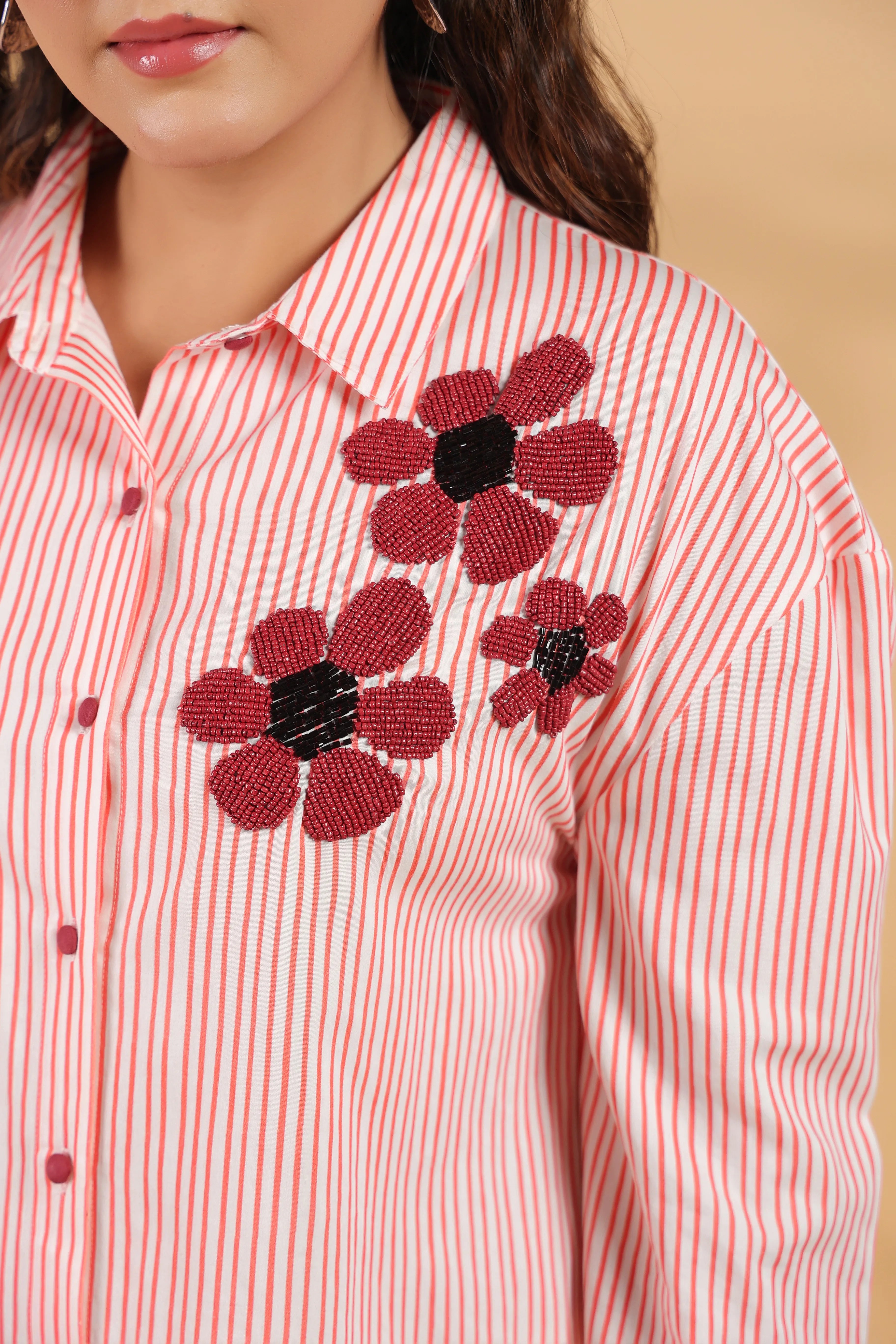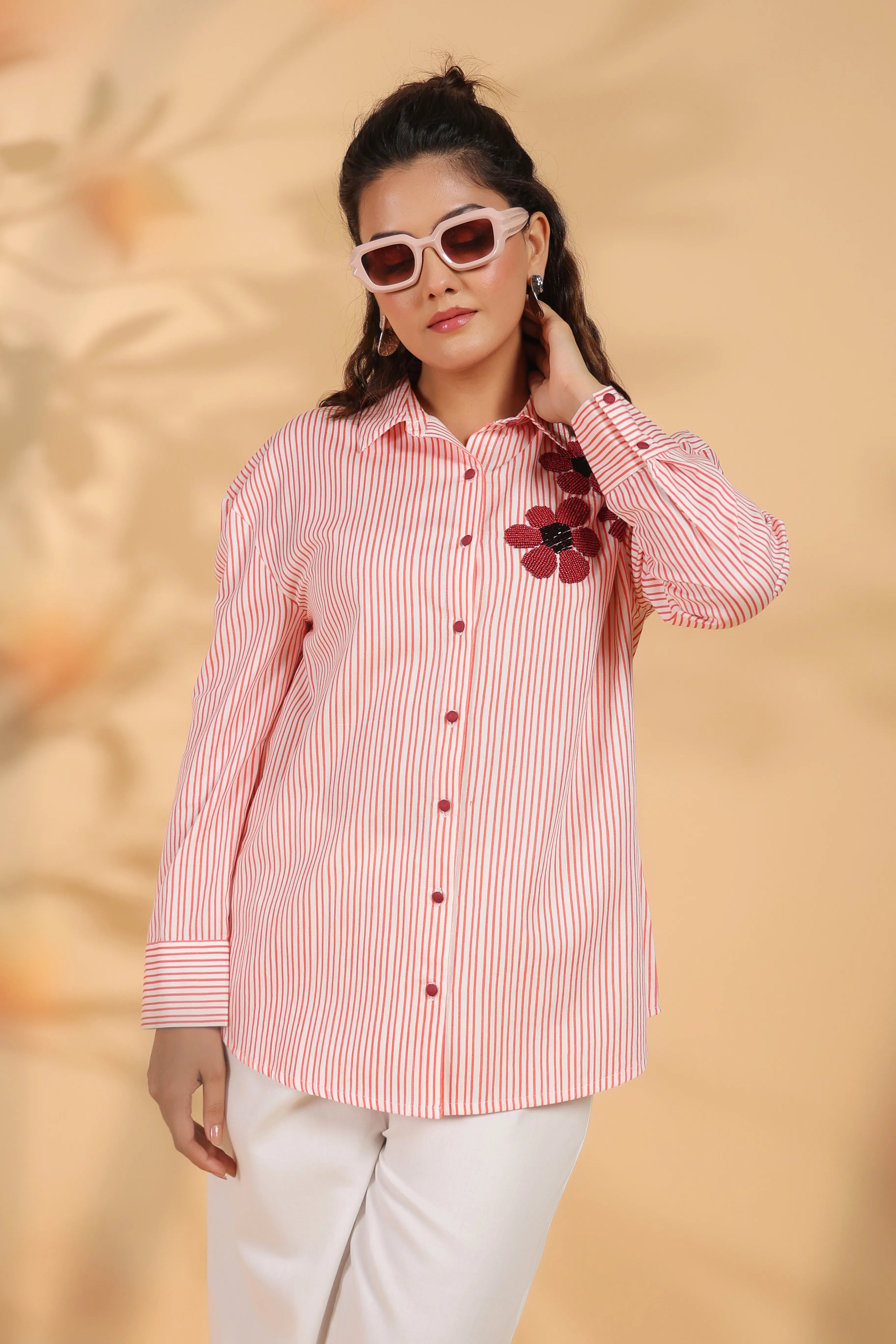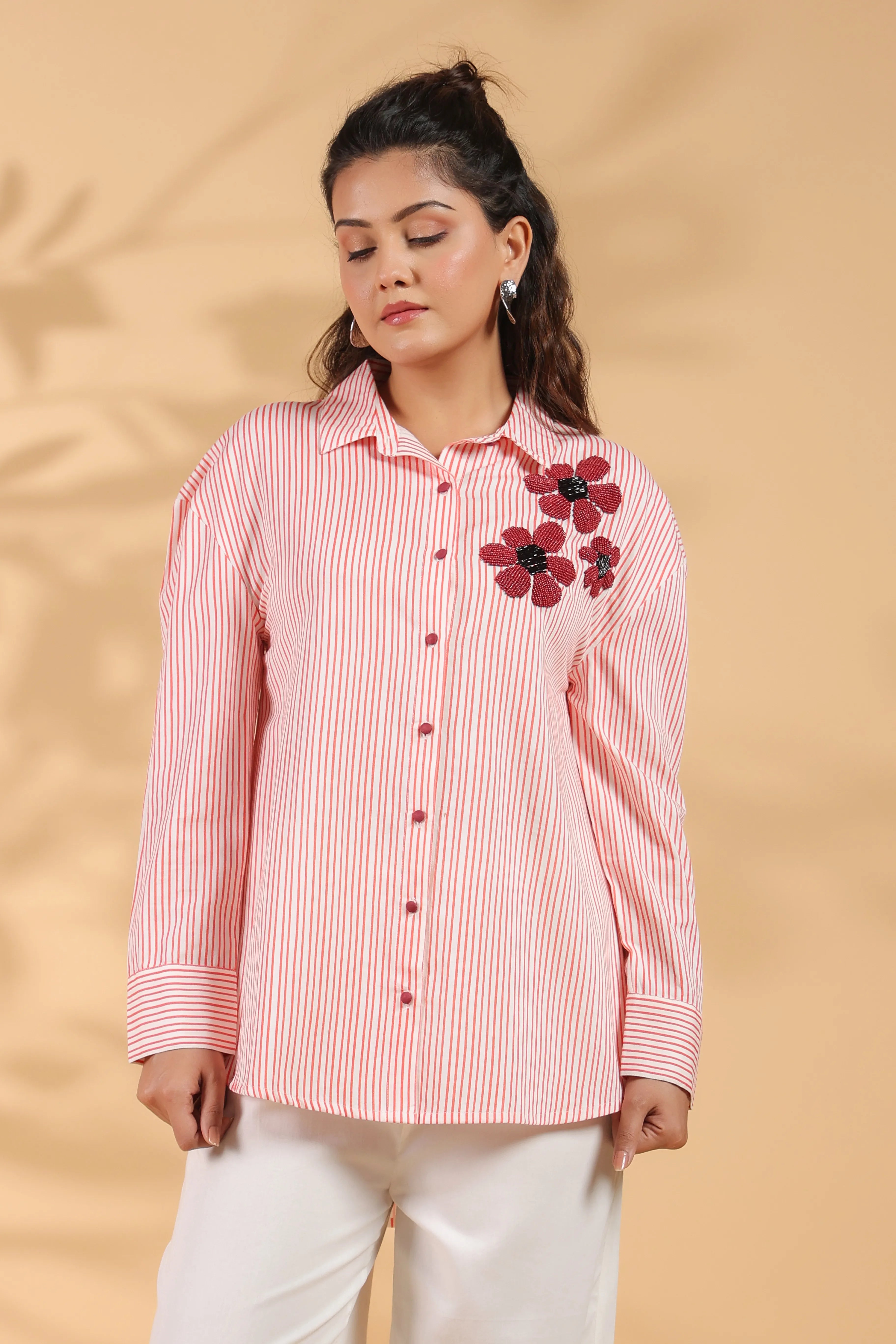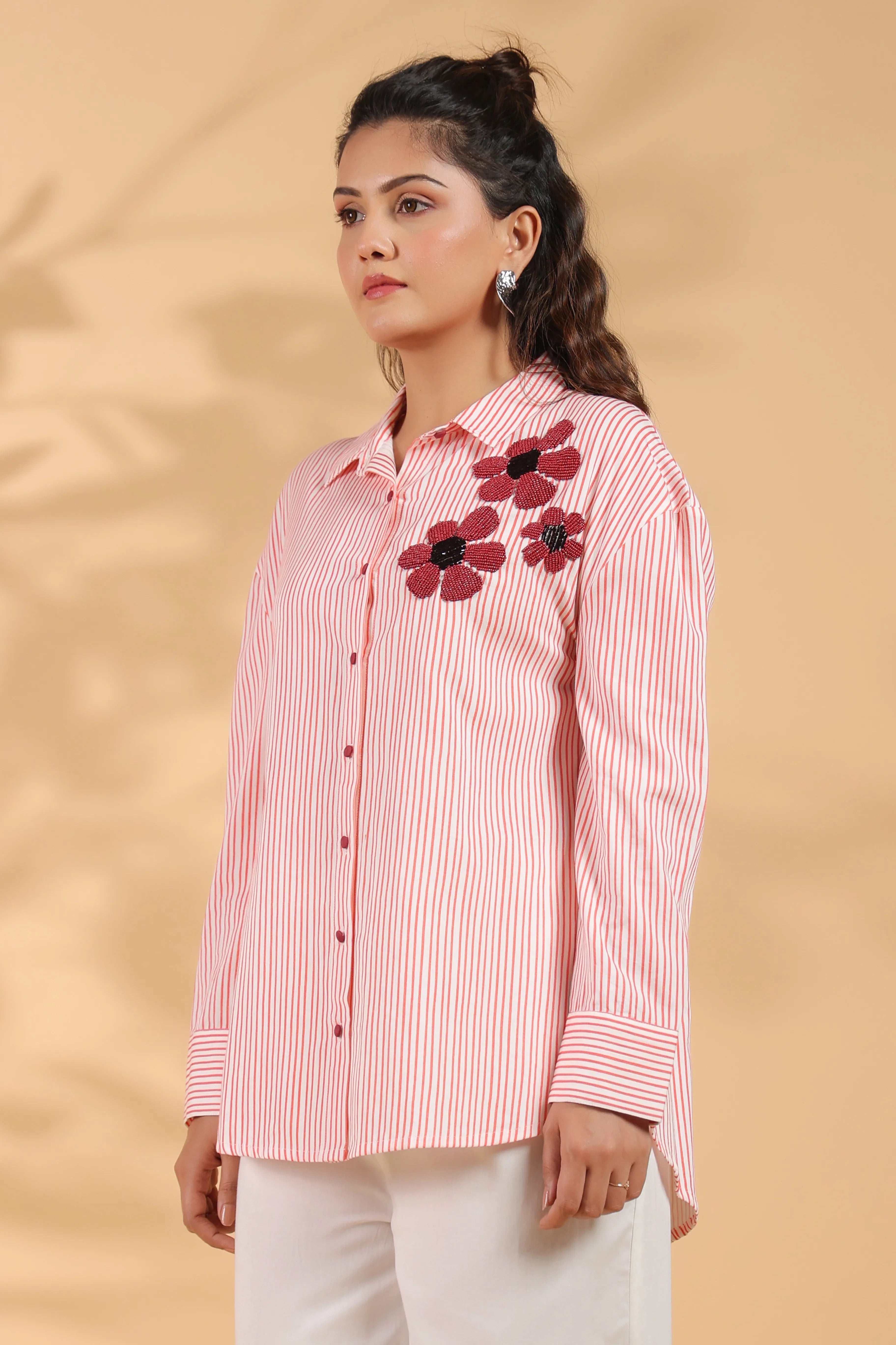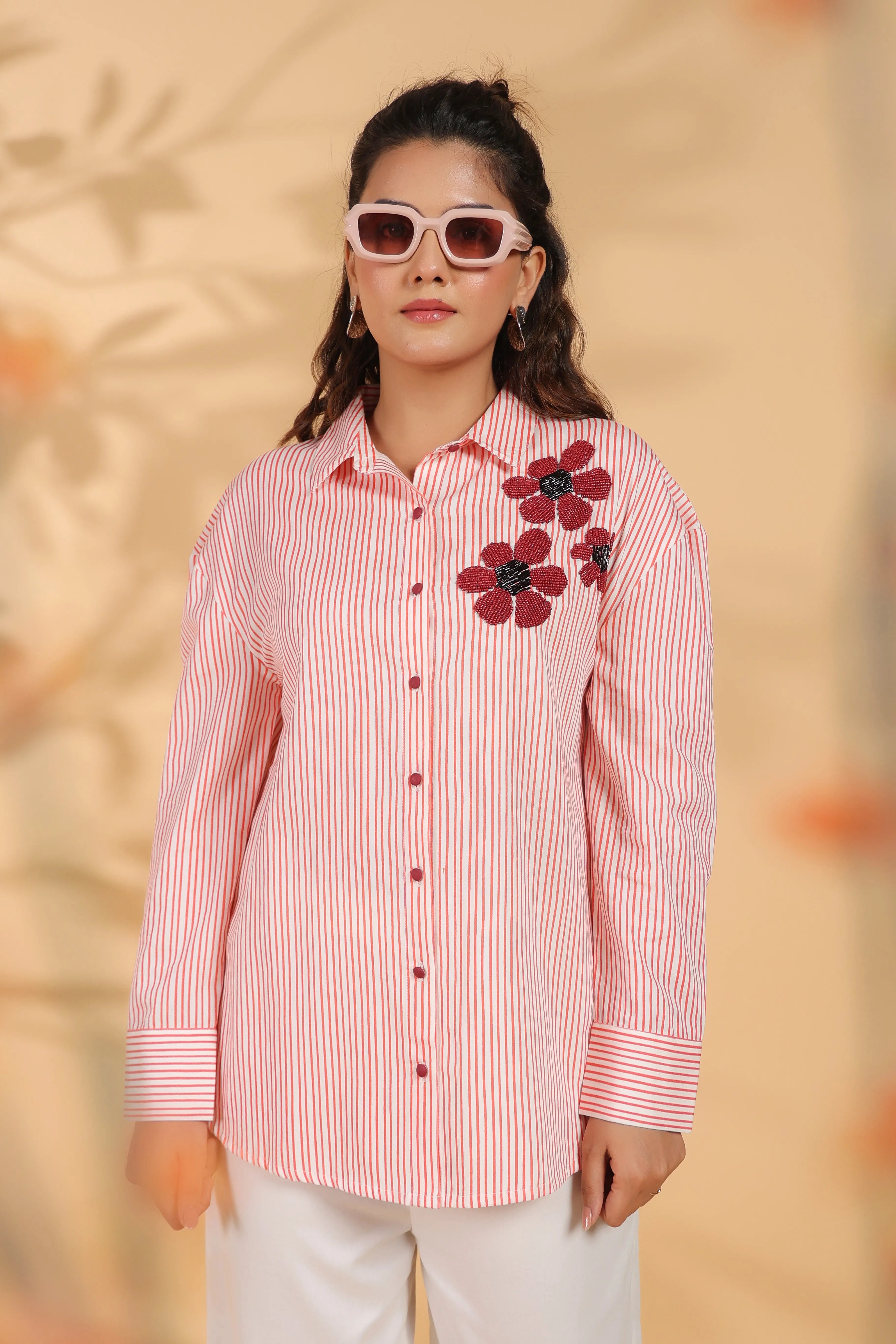 This elegant red and white striped shirt is crafted from luxurious cotton satin, featuring intricate beaded flower embroidery that adds a sophisticated flair to its timeless design. With full sleeves and a shirt collar, it is the perfect piece for both casual and formal occasions, offering a harmonious balance of comfort and style.