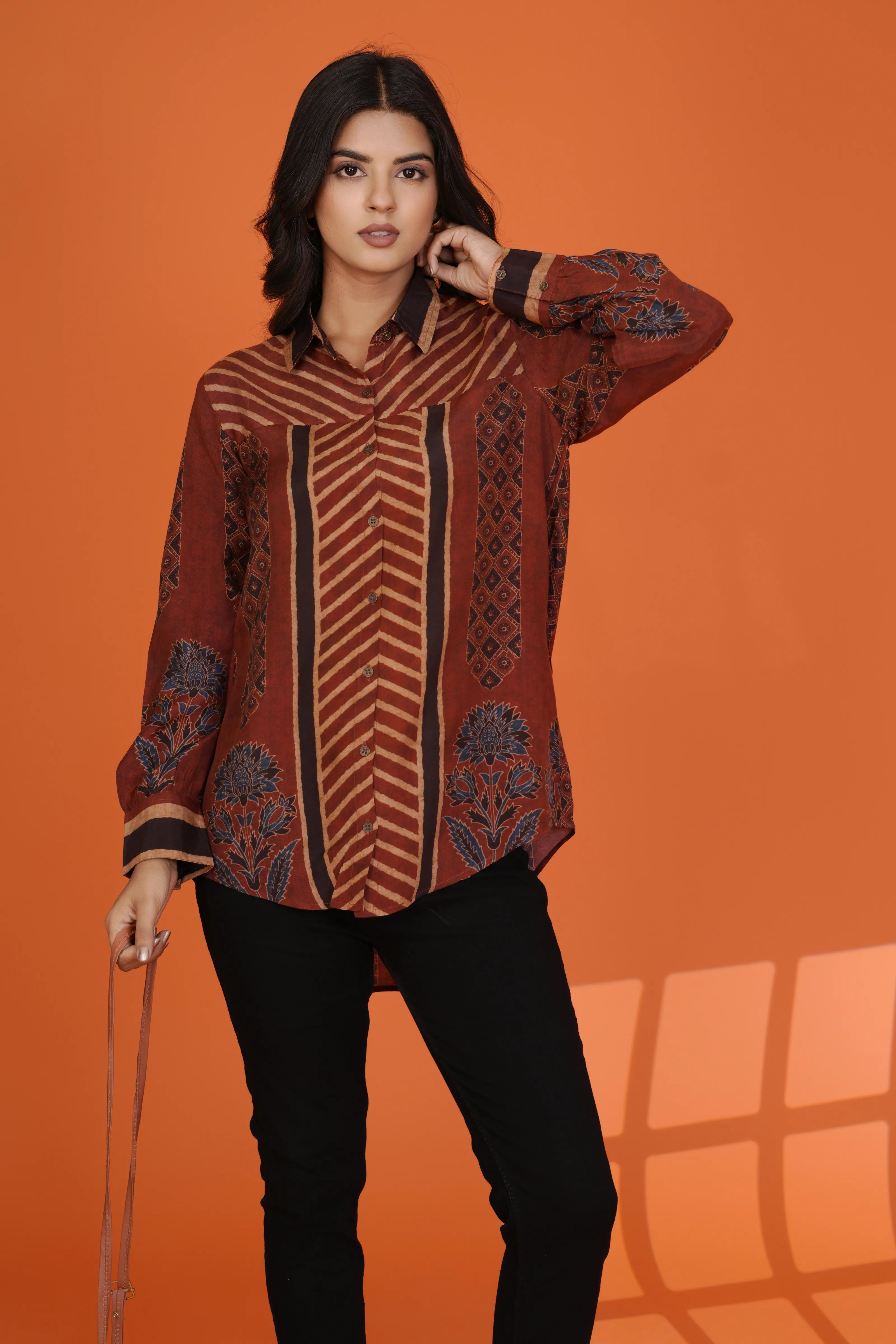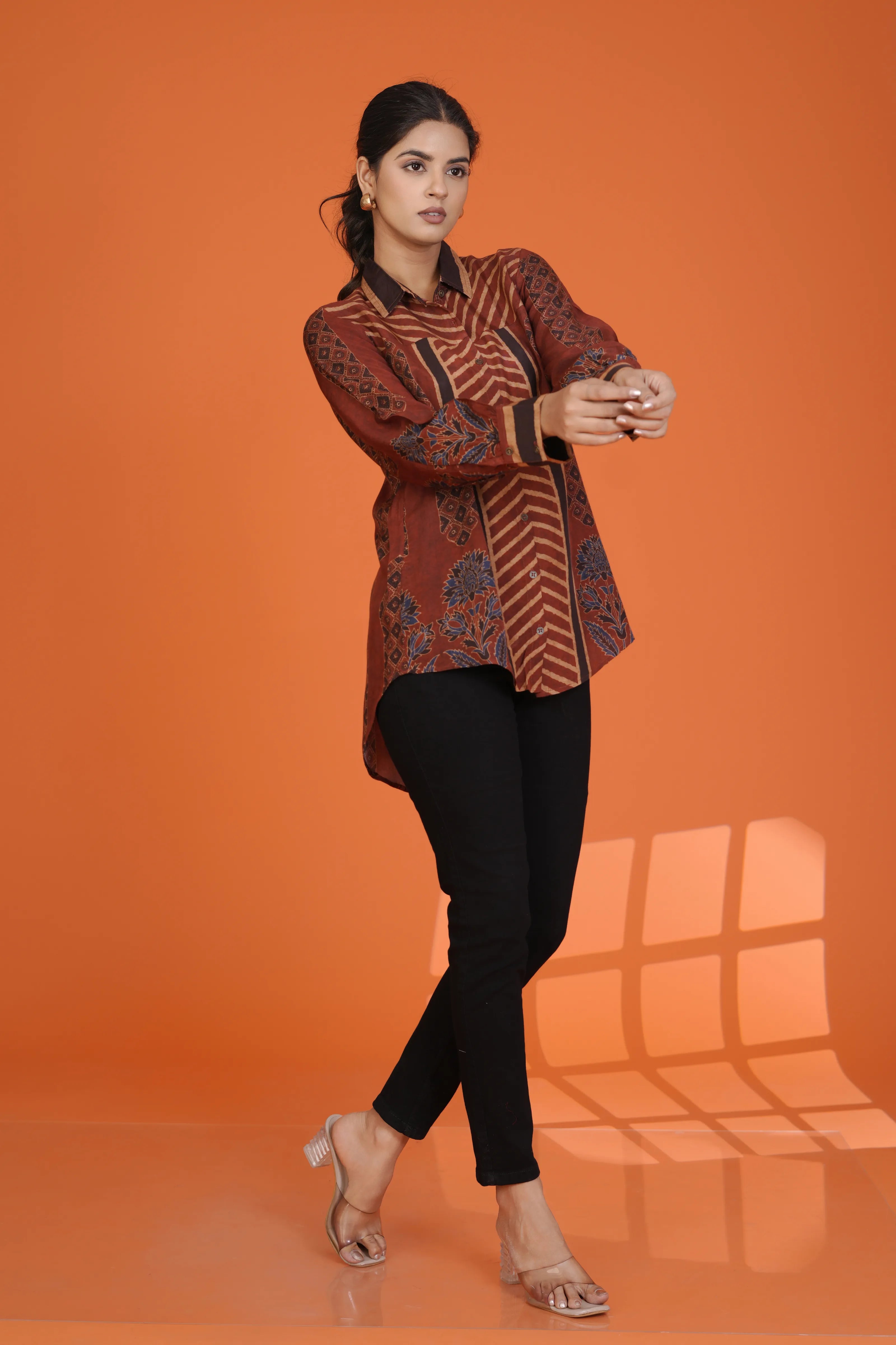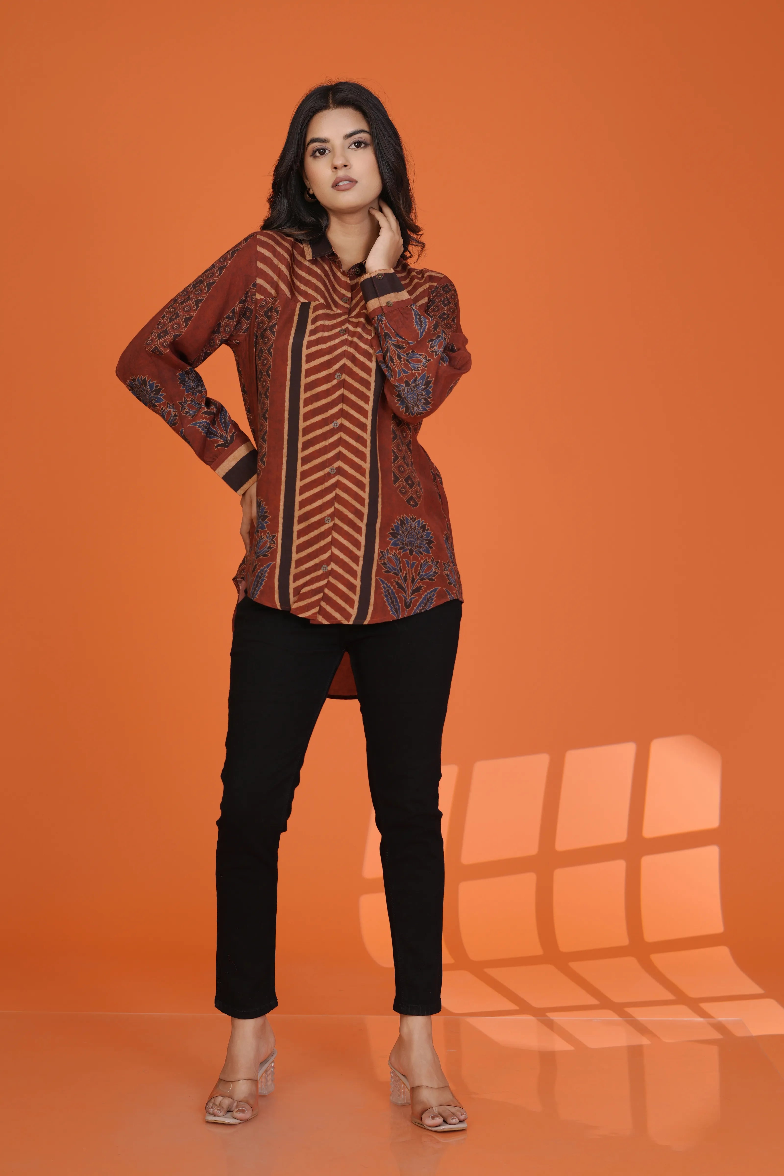 The all-over abstract print is a tapestry of tribal and floral inspirations, harmoniously layered in rich shades of indigo, deep brown, and clay. The shirt features a button-down front with antique-finish metal buttons, a classic collar, full-length sleeves, and an asymmetric hem that adds movement and edge to the overall look.