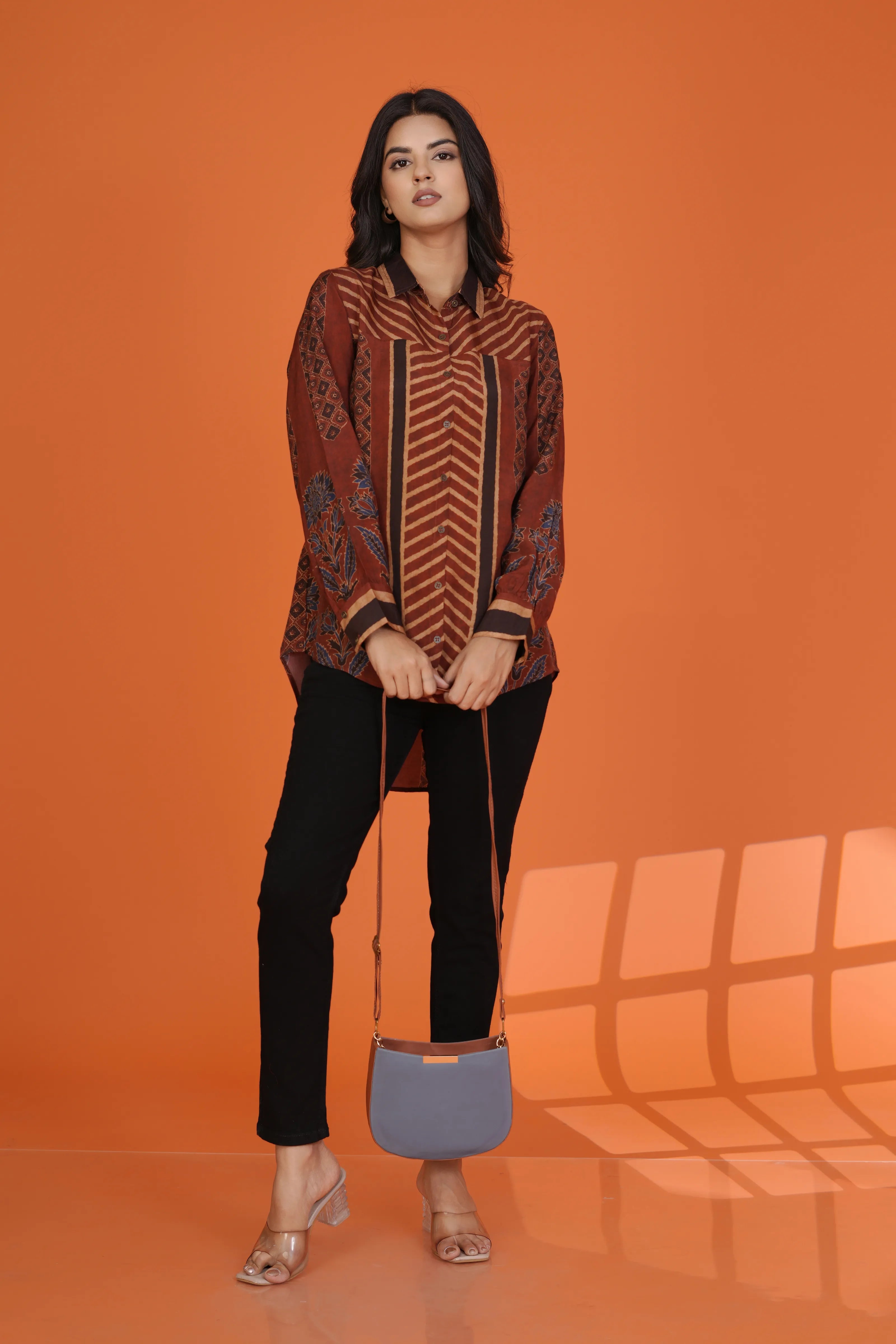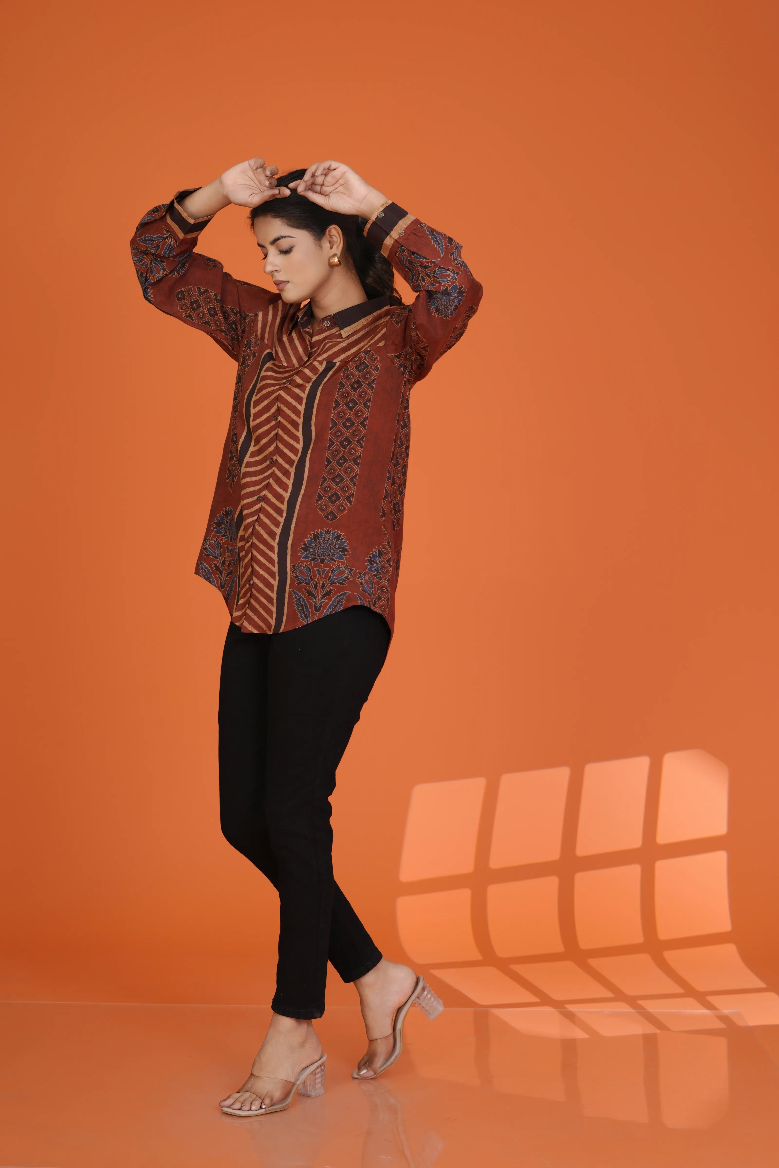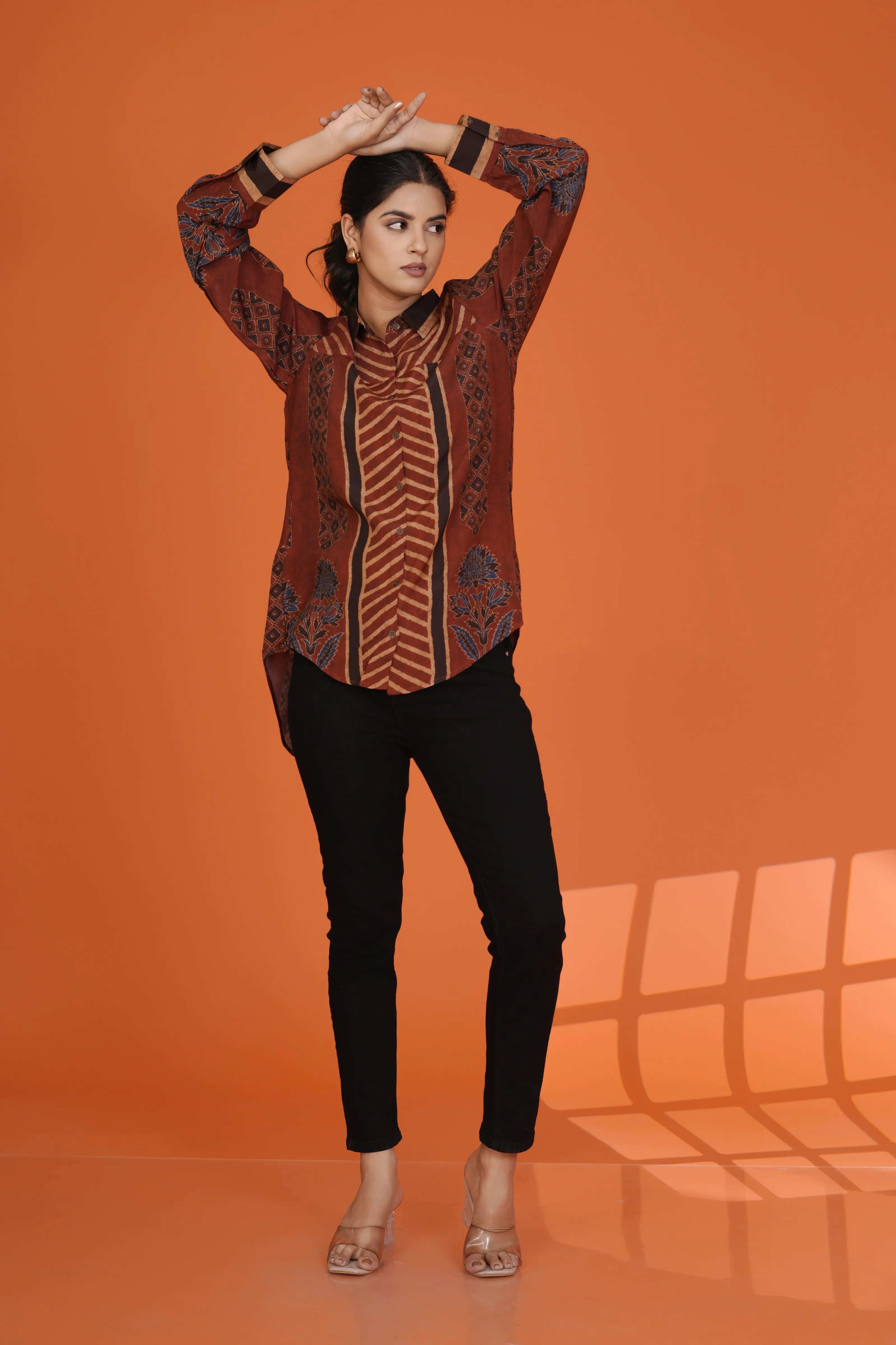 The all-over abstract print is a tapestry of tribal and floral inspirations, harmoniously layered in rich shades of indigo, deep brown, and clay. The shirt features a button-down front with antique-finish metal buttons, a classic collar, full-length sleeves, and an asymmetric hem that adds movement and edge to the overall look.