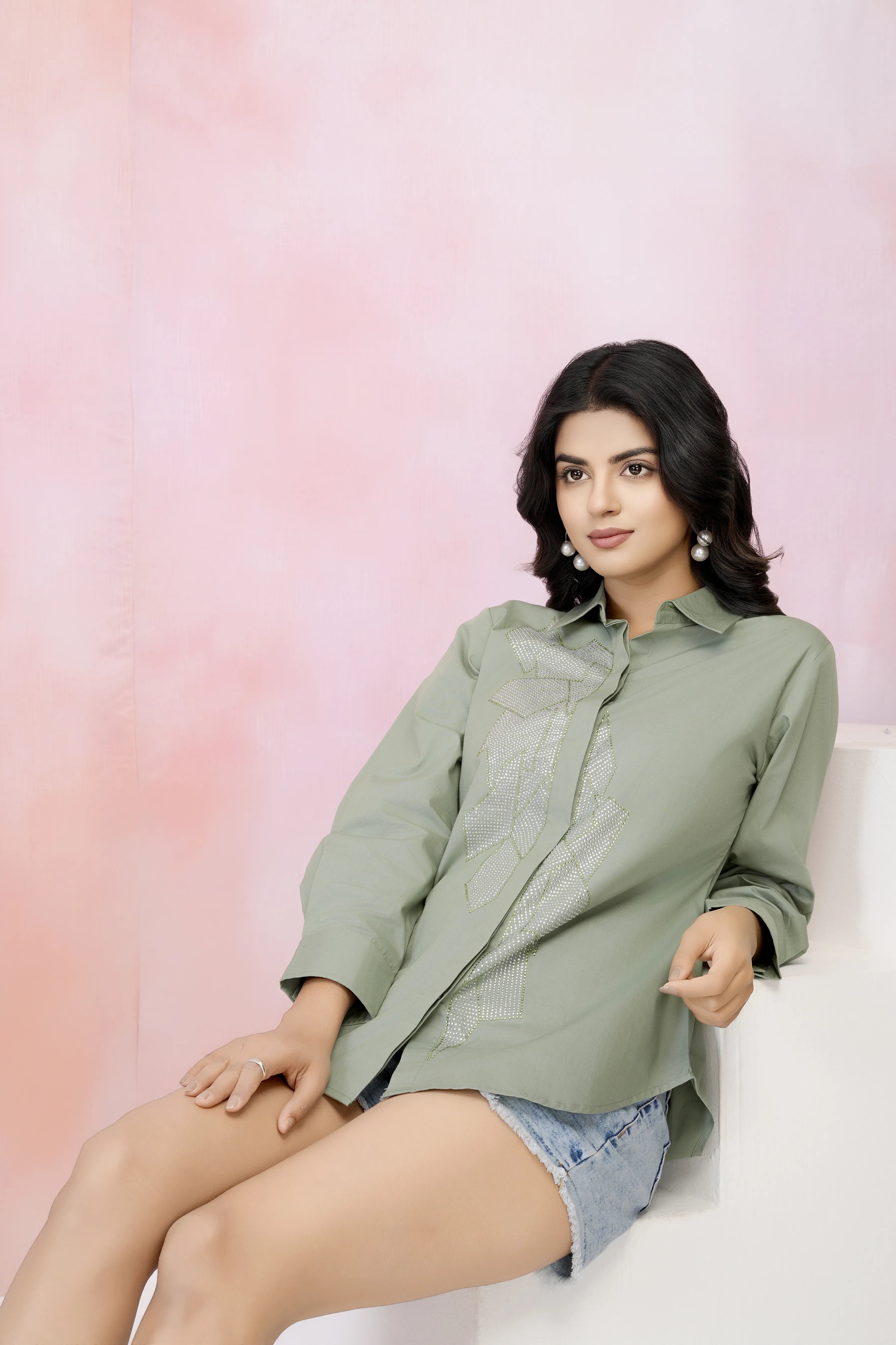 Elegant and sophisticated, this Sea Green Cotton Shirt is designed for effortless style and versatility. Featuring a concealed button placket with delicate rhinestone embellishments, this shirt adds a subtle touch of luxury to your everyday or formal wardrobe. The full sleeves and soft cotton fabric ensure comfort while maintaining a polished, tailored look.