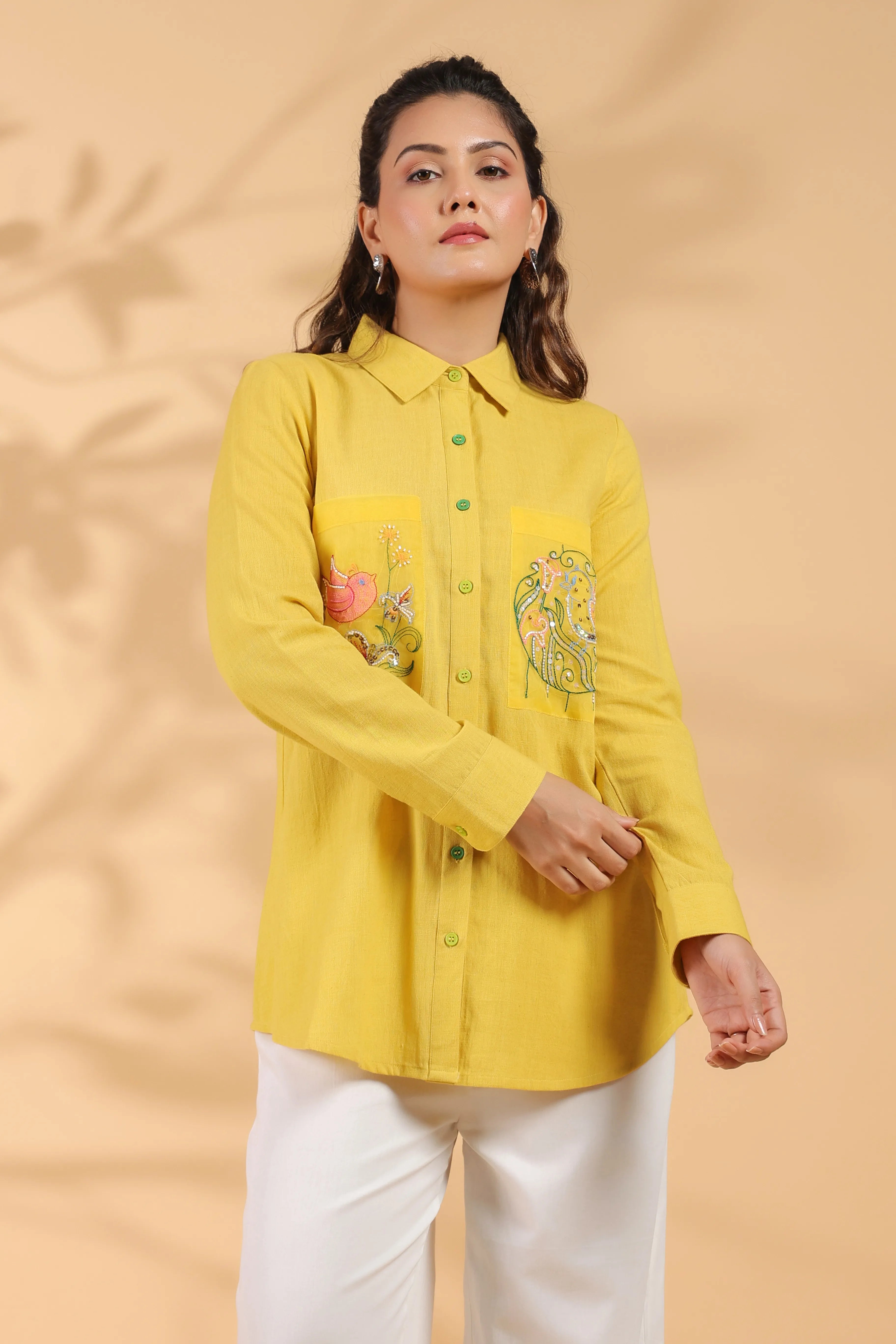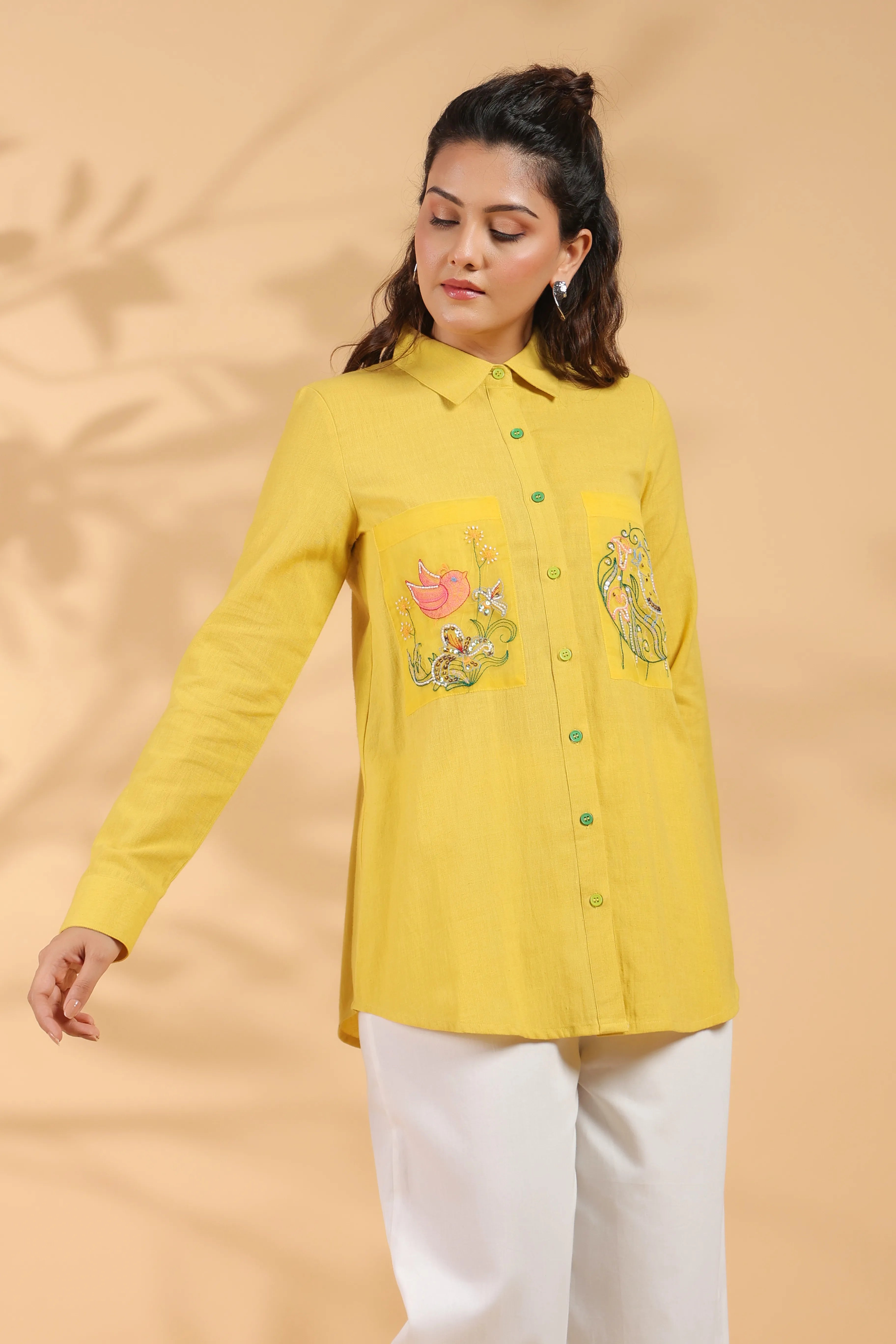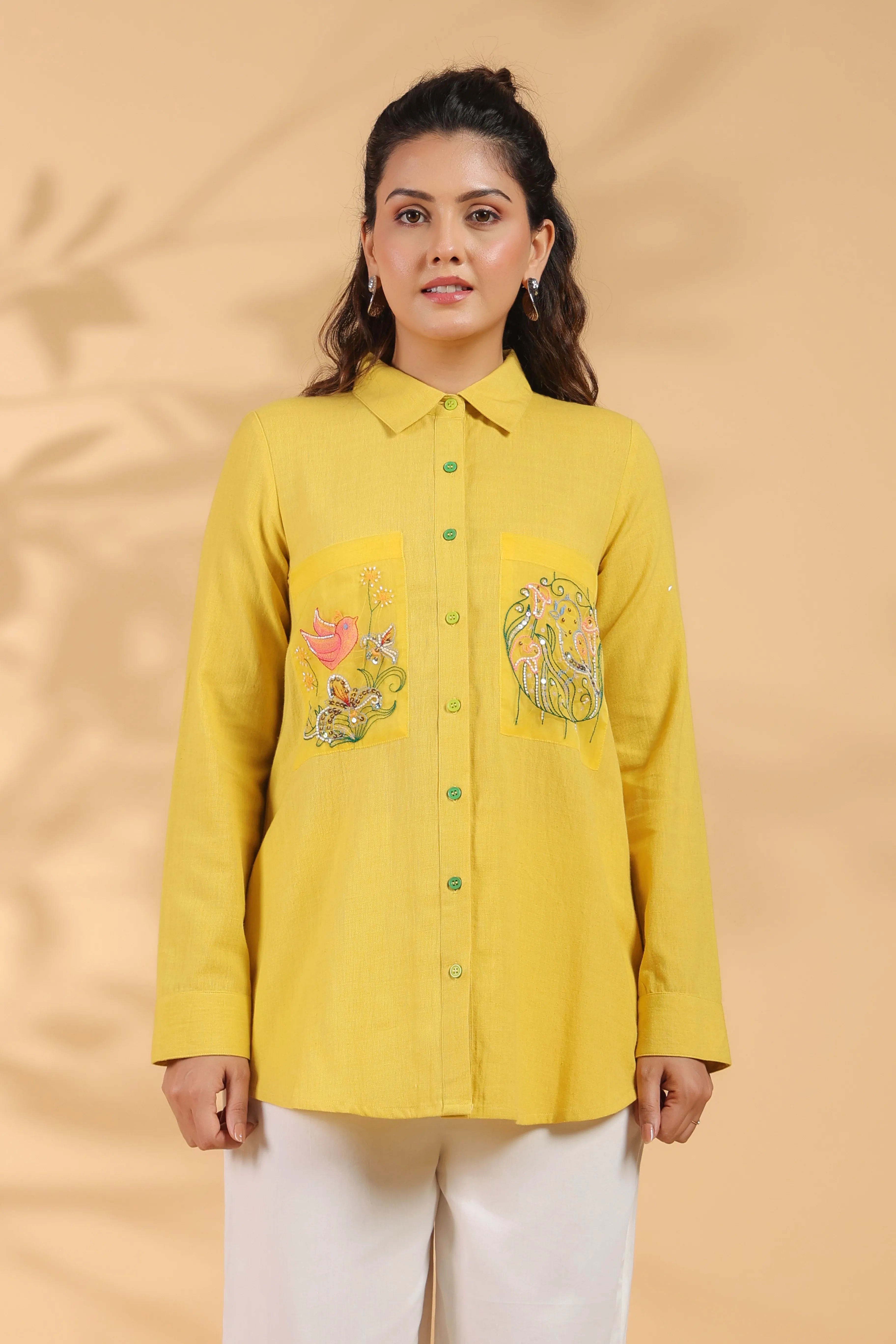 Sunflower Yellow Cotton Flex Shirt with Embroidery