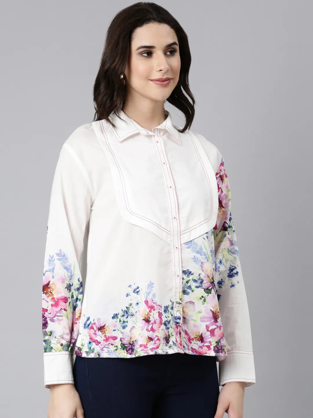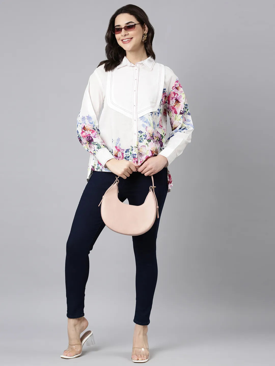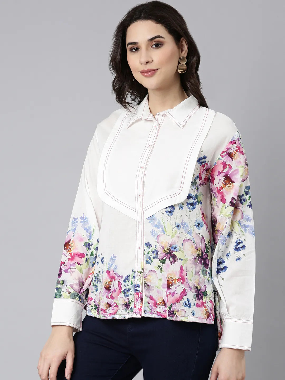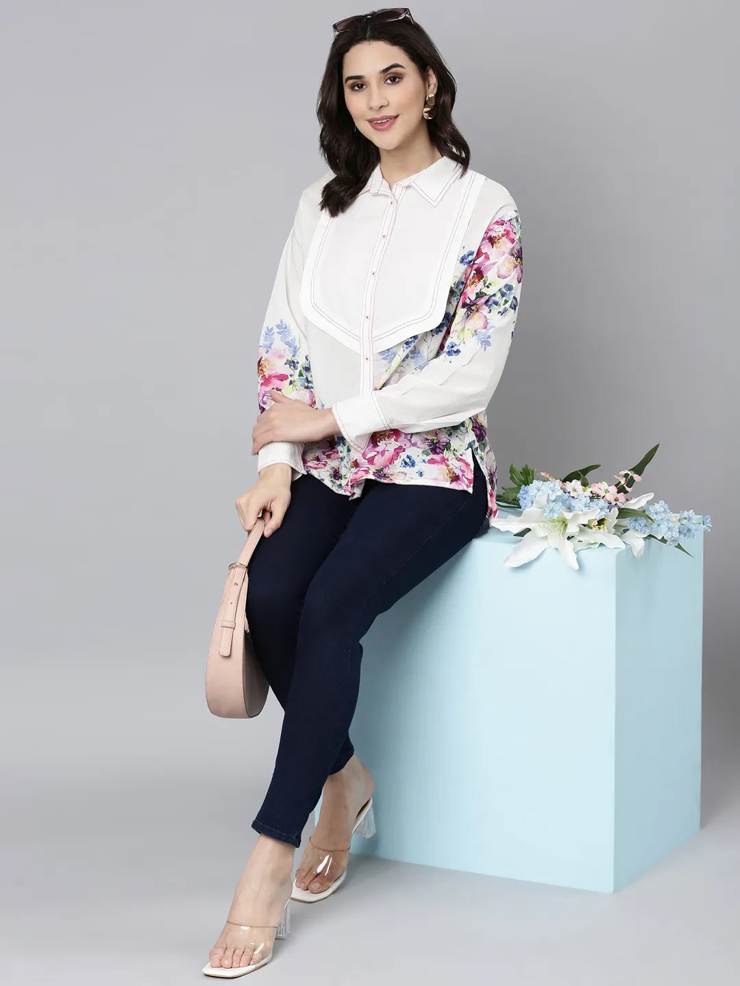 Chic and Contemporary: White Cotton Cambric Full-Sleeve Shirt with Patch Print