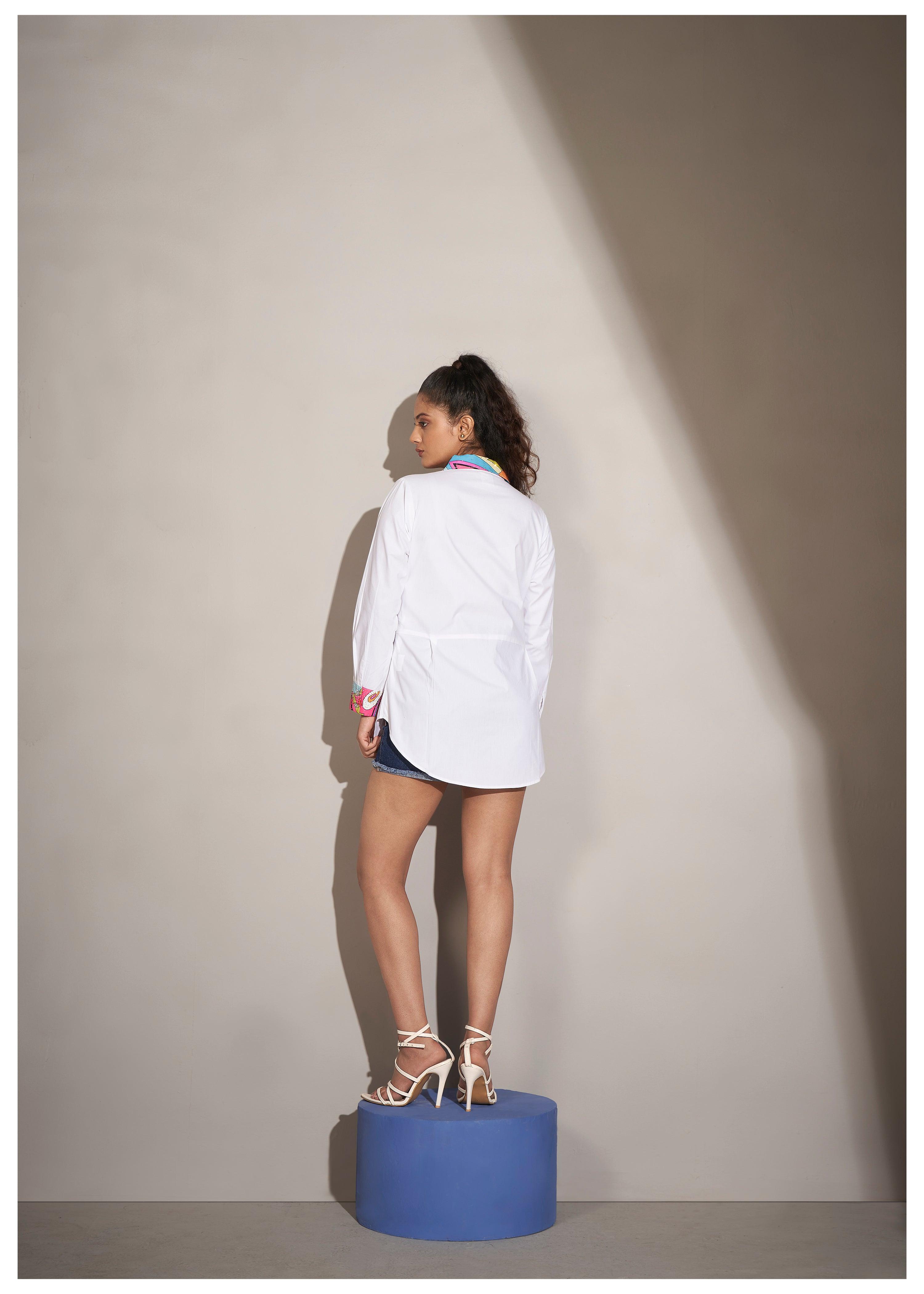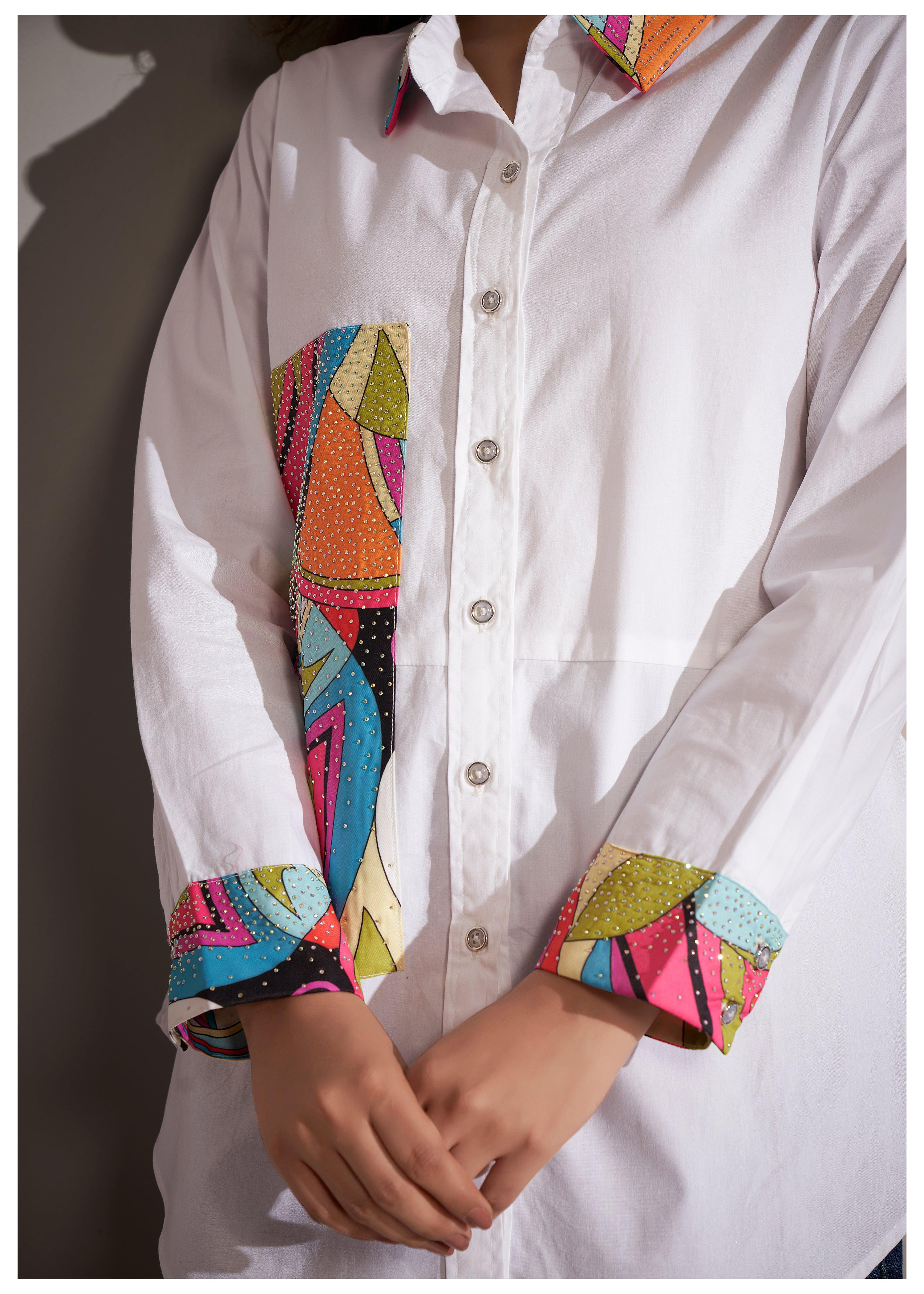 Make a statement with this white cotton shirt, featuring vibrant pop art print patches and eye-catching rhinestone accents. The shirt's straight full sleeves with embellished cuffs and the curved hem create a contemporary, relaxed fit, while the shirt collar adds a classic touch. Crafted from premium cotton poplin, this shirt is perfect for those who love modern, artistic flair in their wardrobe.