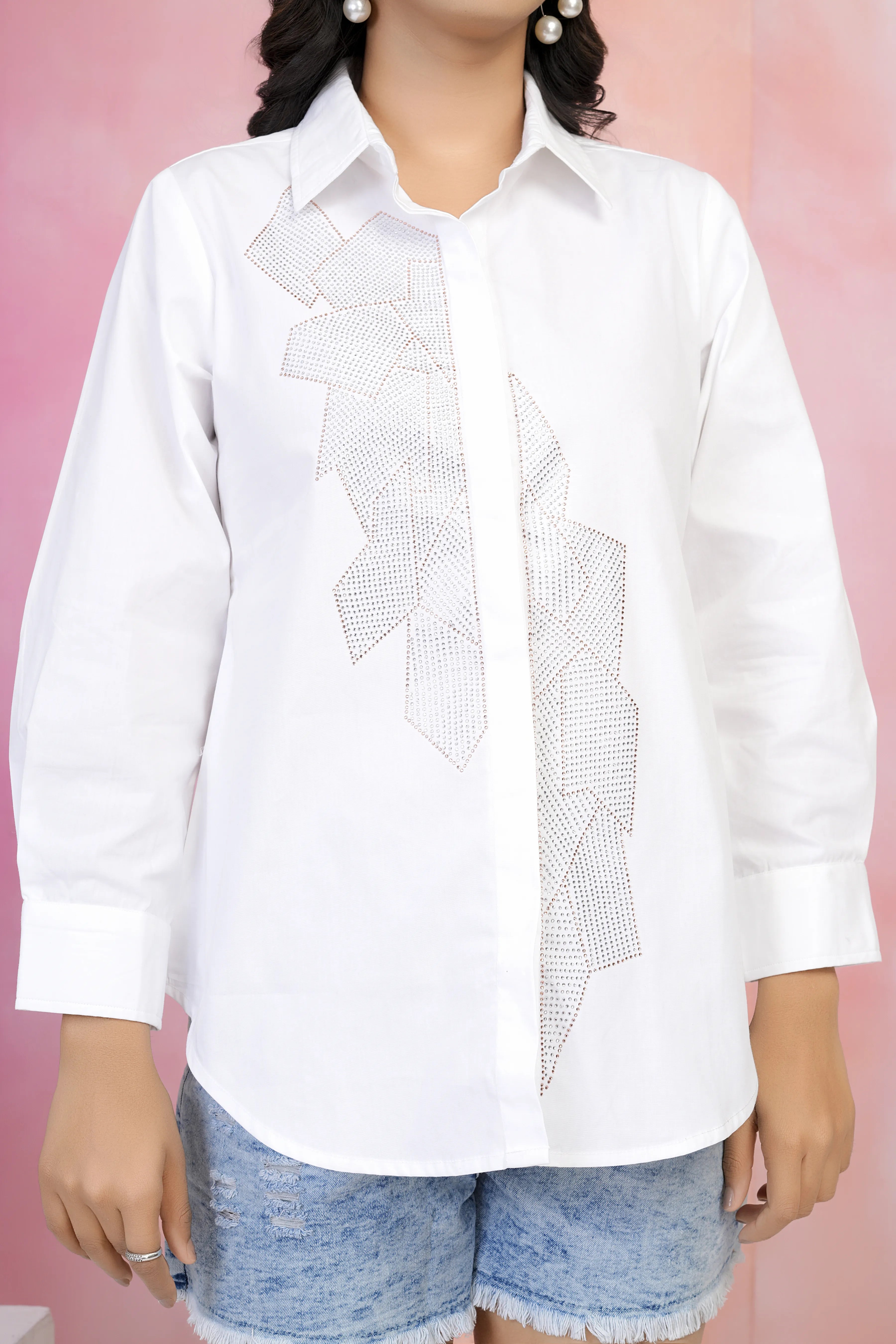 Refined and effortlessly chic, this White Cotton Shirt is a wardrobe essential for a polished and sophisticated look. Featuring a concealed button placket front with delicate rhinestone detailing, this piece blends subtle glamour with classic tailoring. The full sleeves and crisp cotton fabric ensure both comfort and timeless elegance.