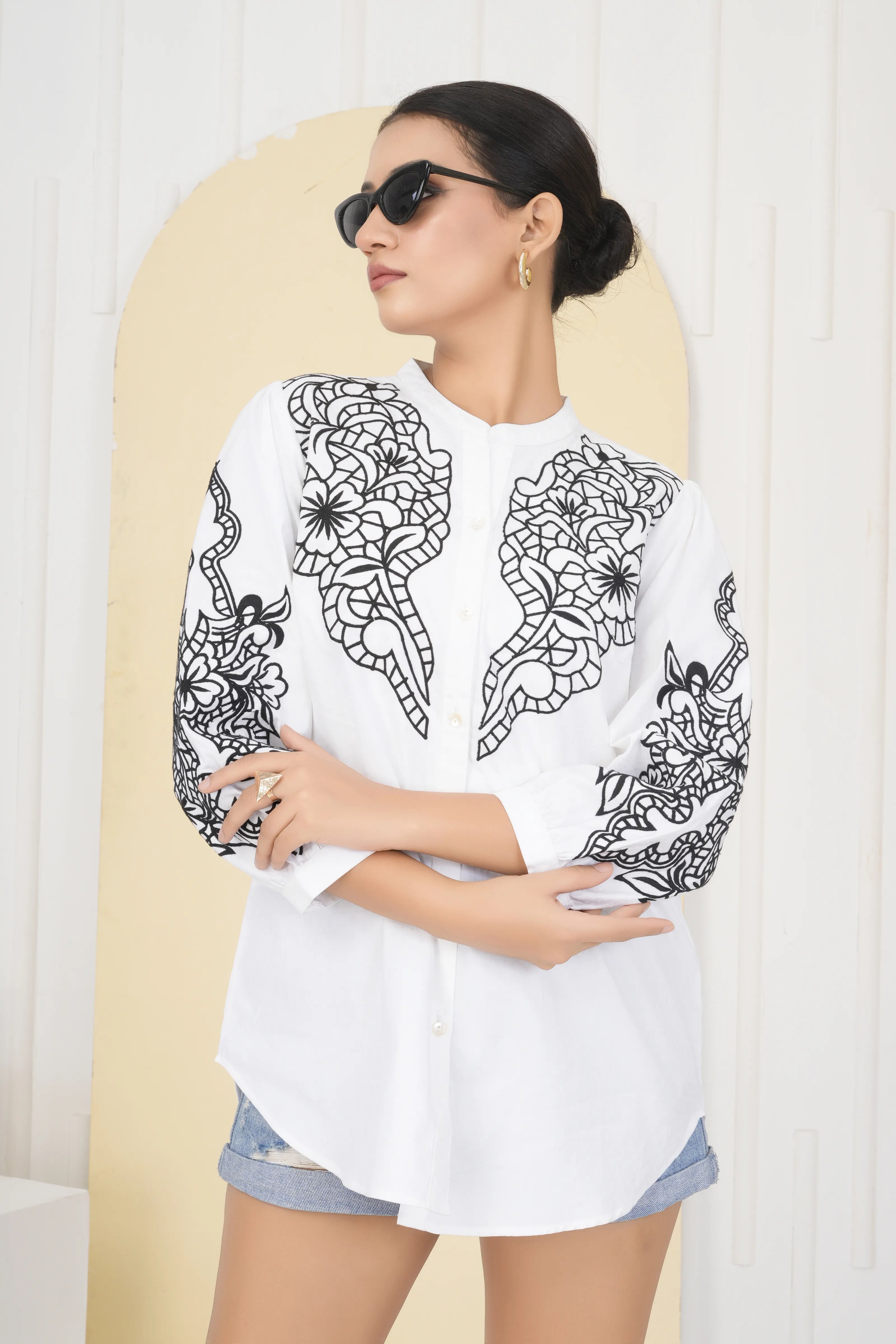 Color: Classic white with intricate placement embroidery