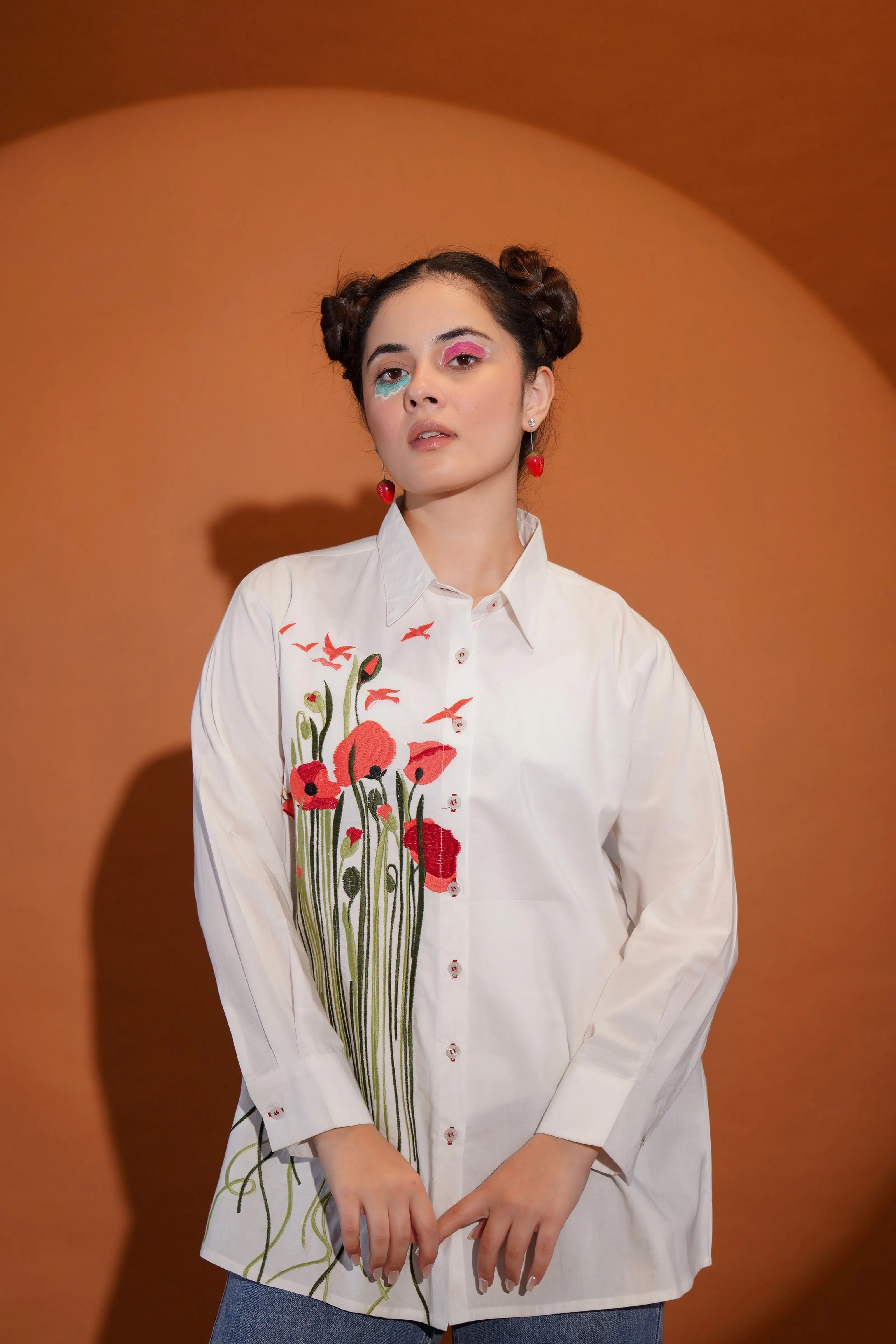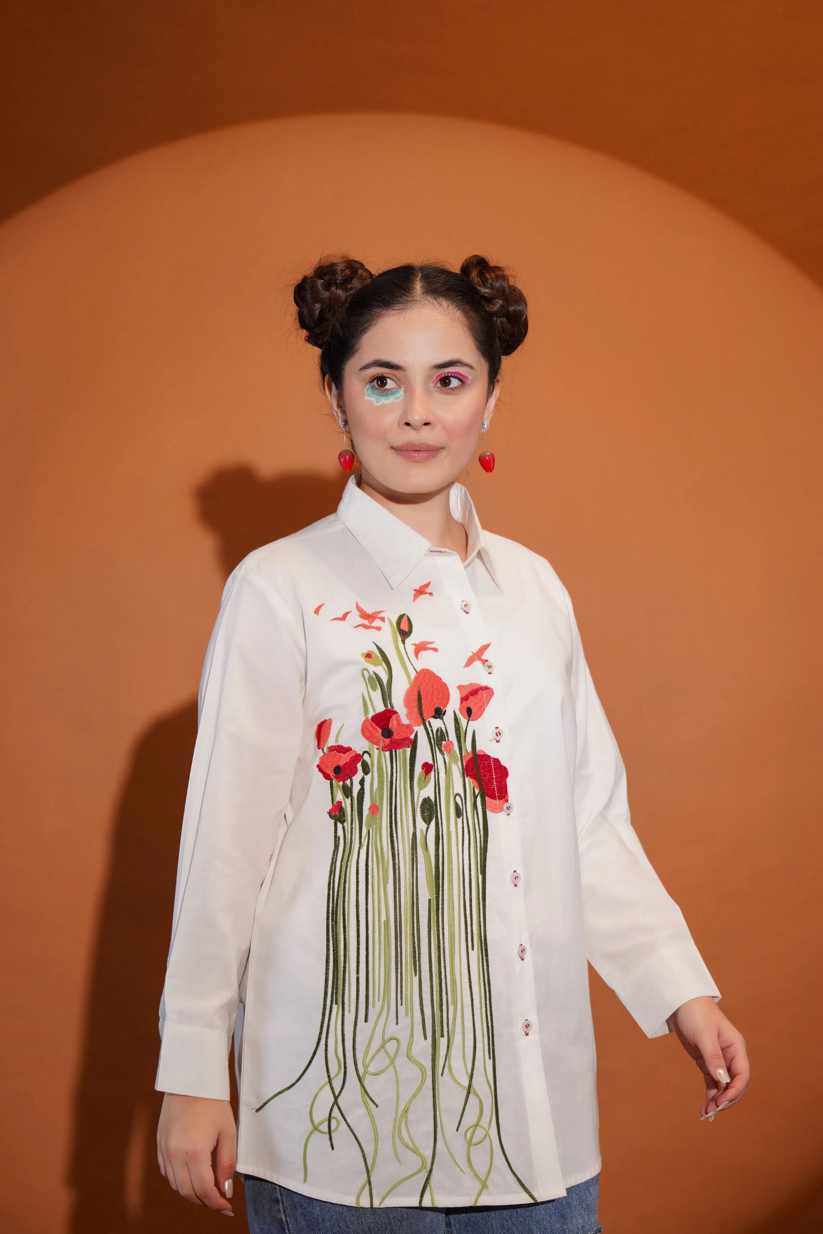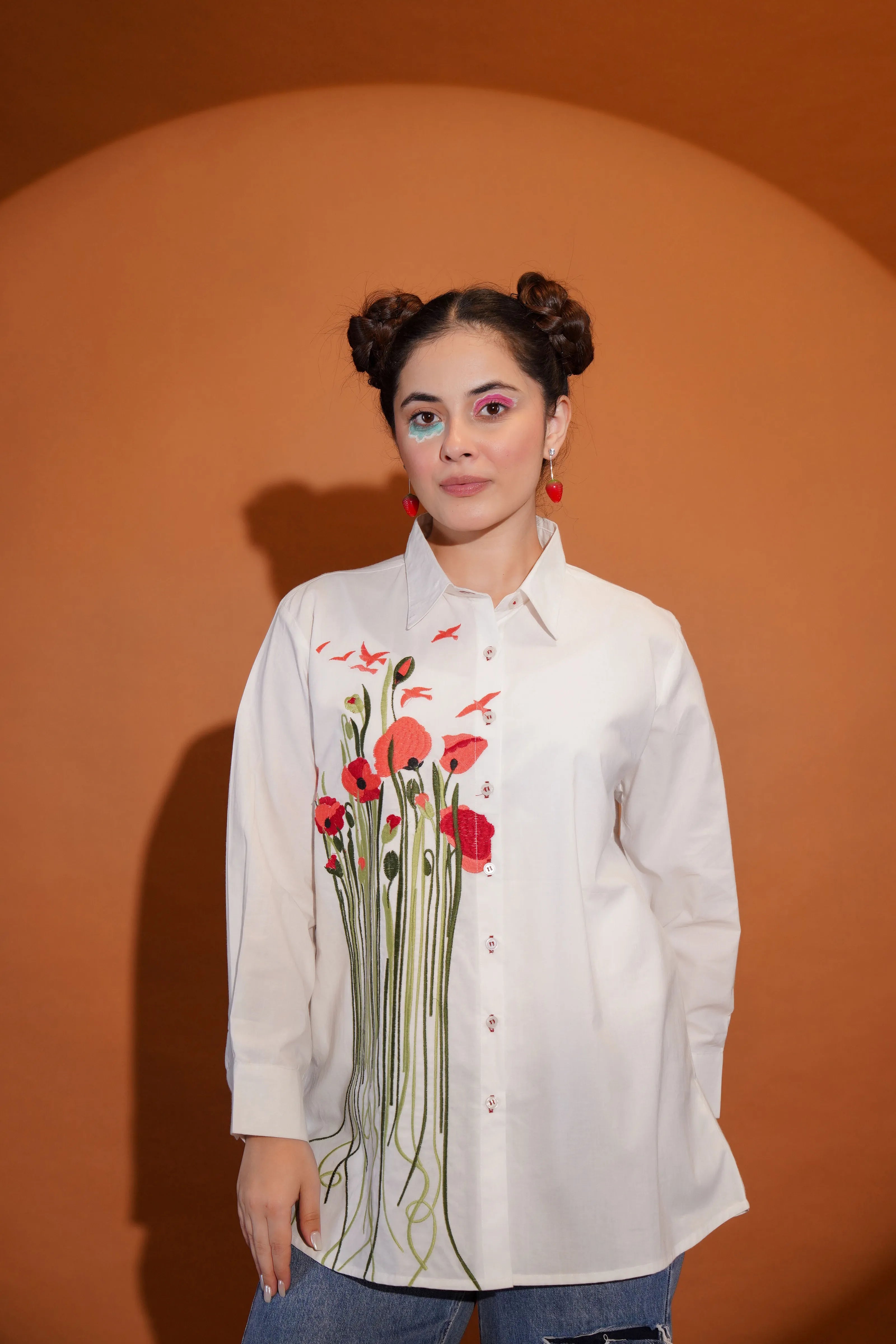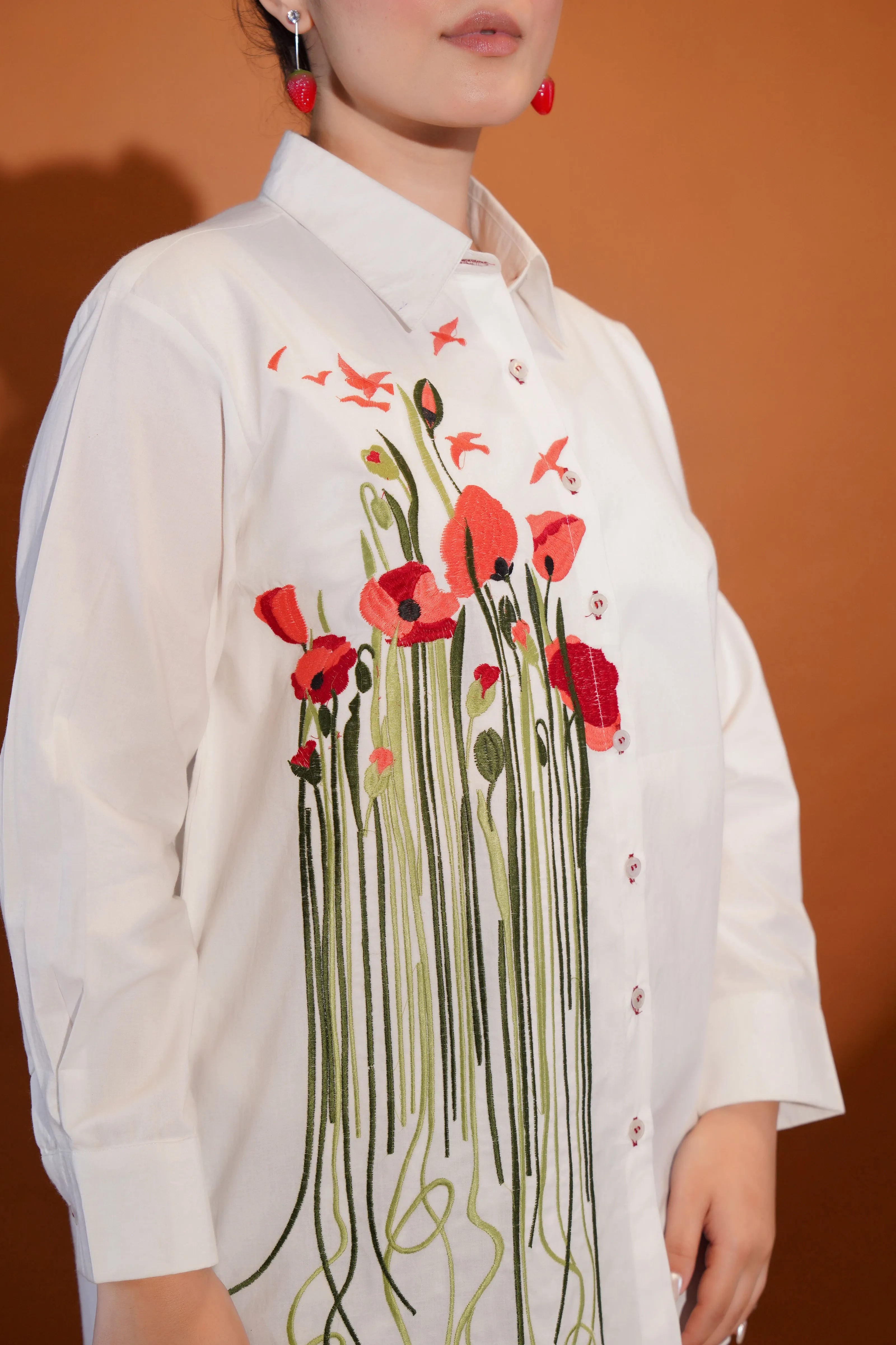Key Features: • Fabric: Crisp and breathable cotton poplin • Color: Clean white base with multicolour floral and leaf embroidery • Design Details: Full sleeves, shirt collar, front button closure • Embroidery: Bold multicolour motif across front with artistic stem detailing • Fit: Relaxed, modern silhouette that moves with you