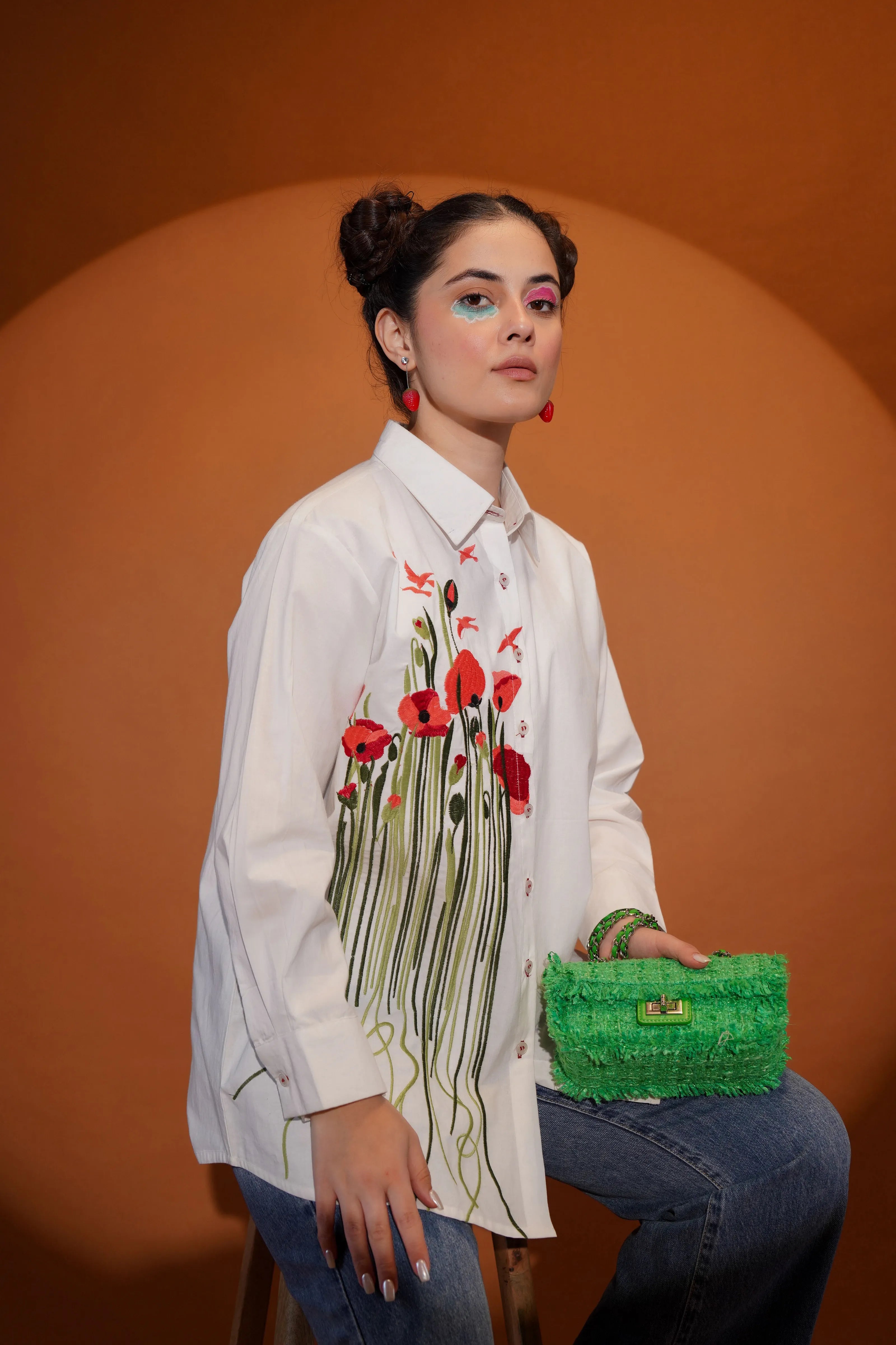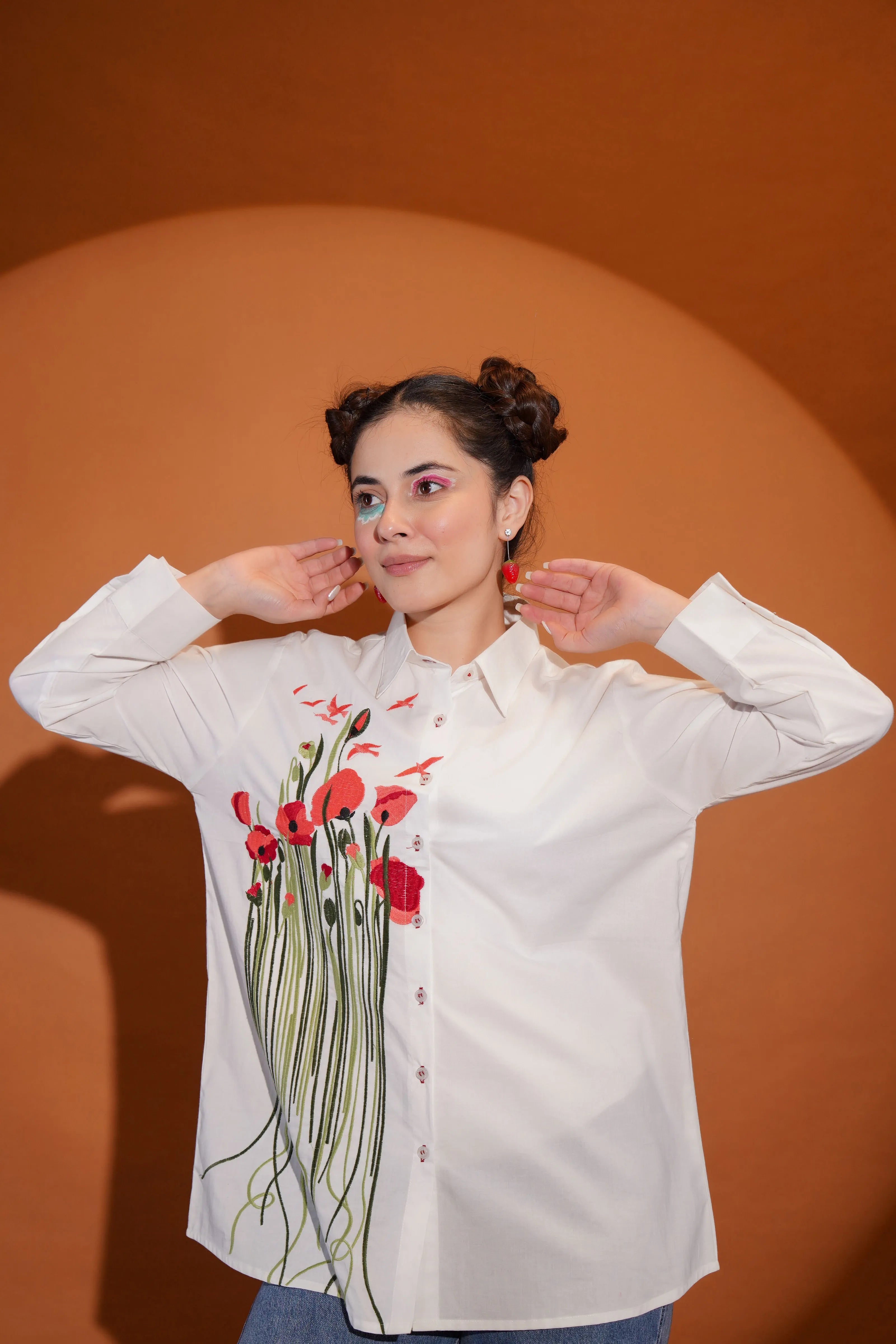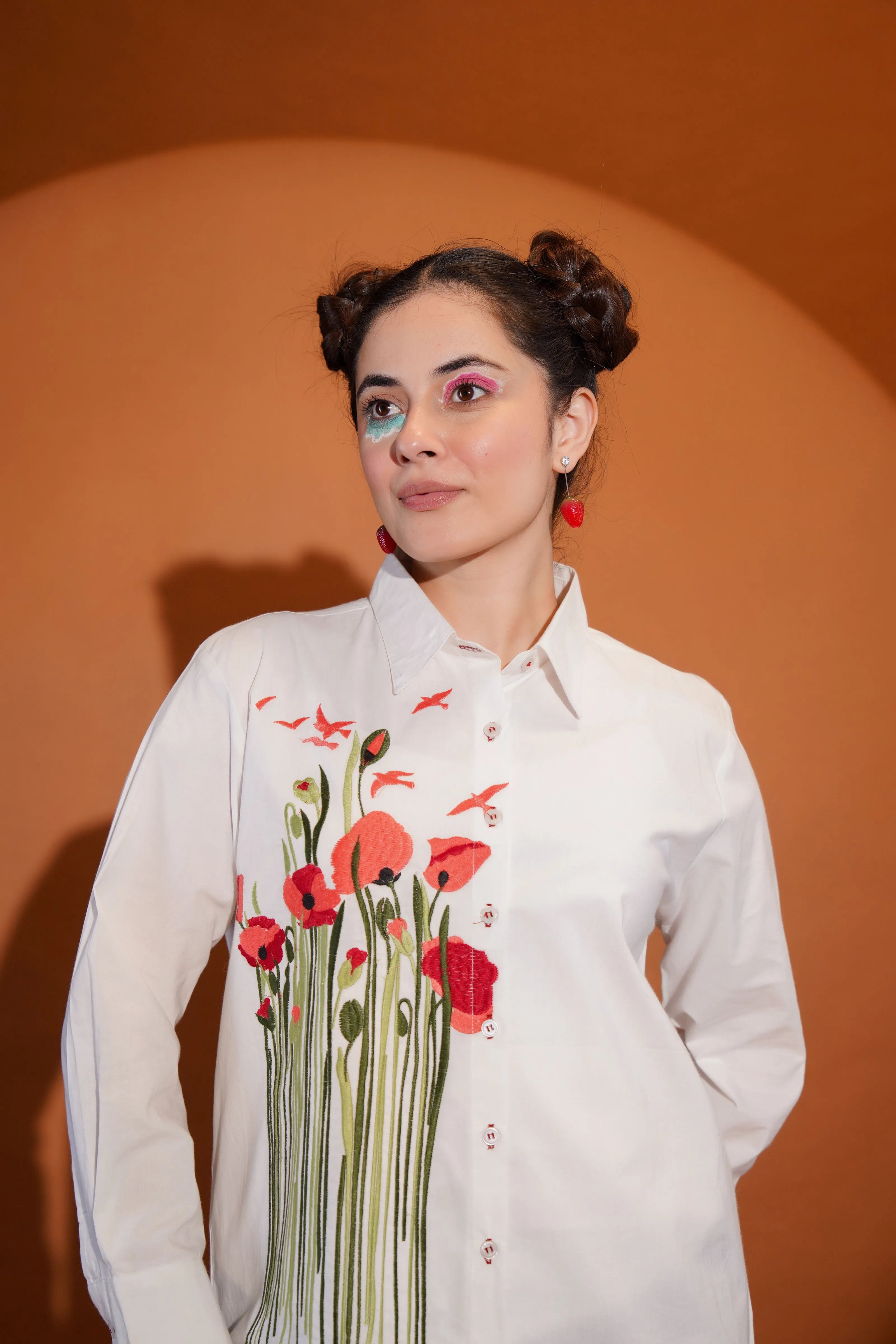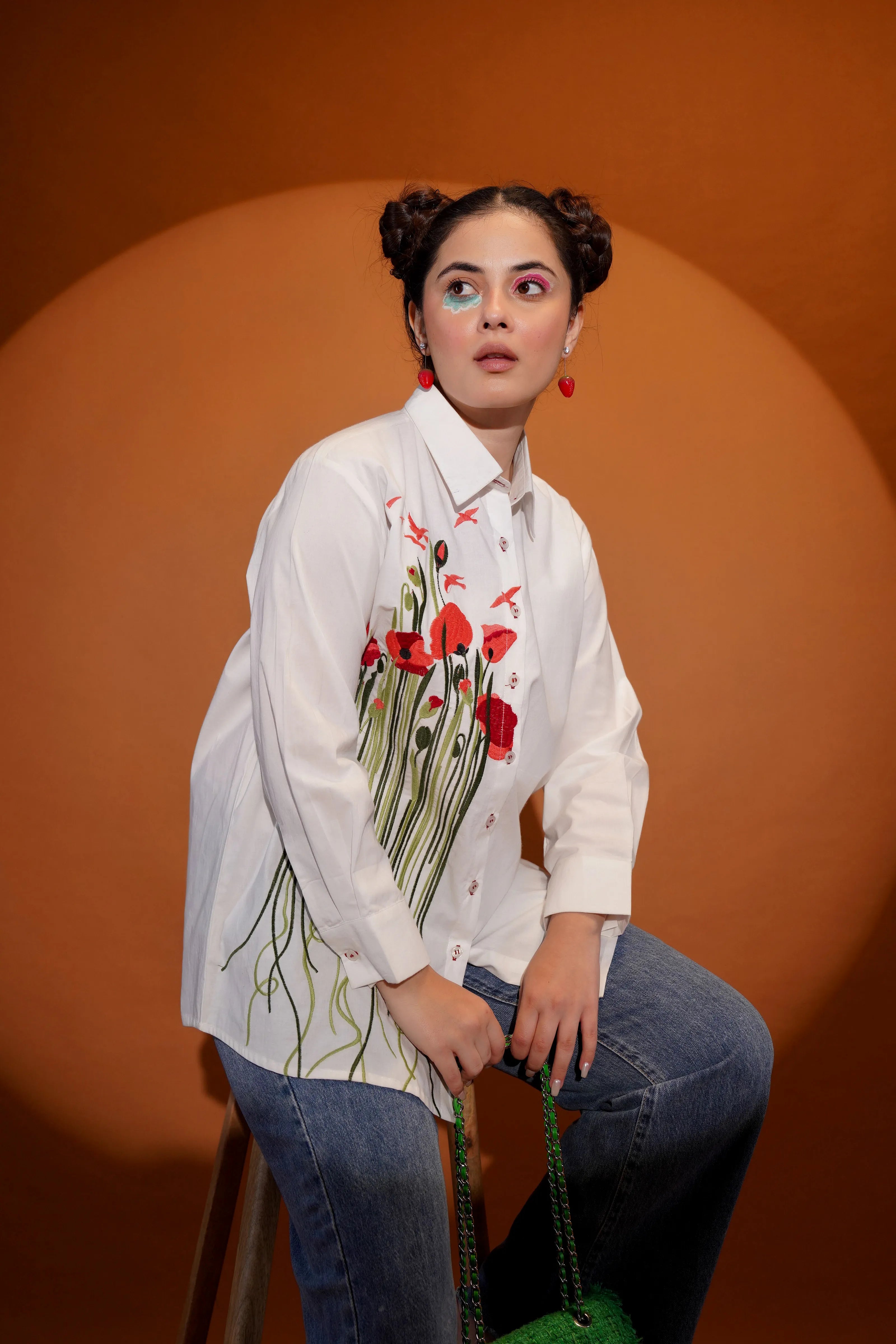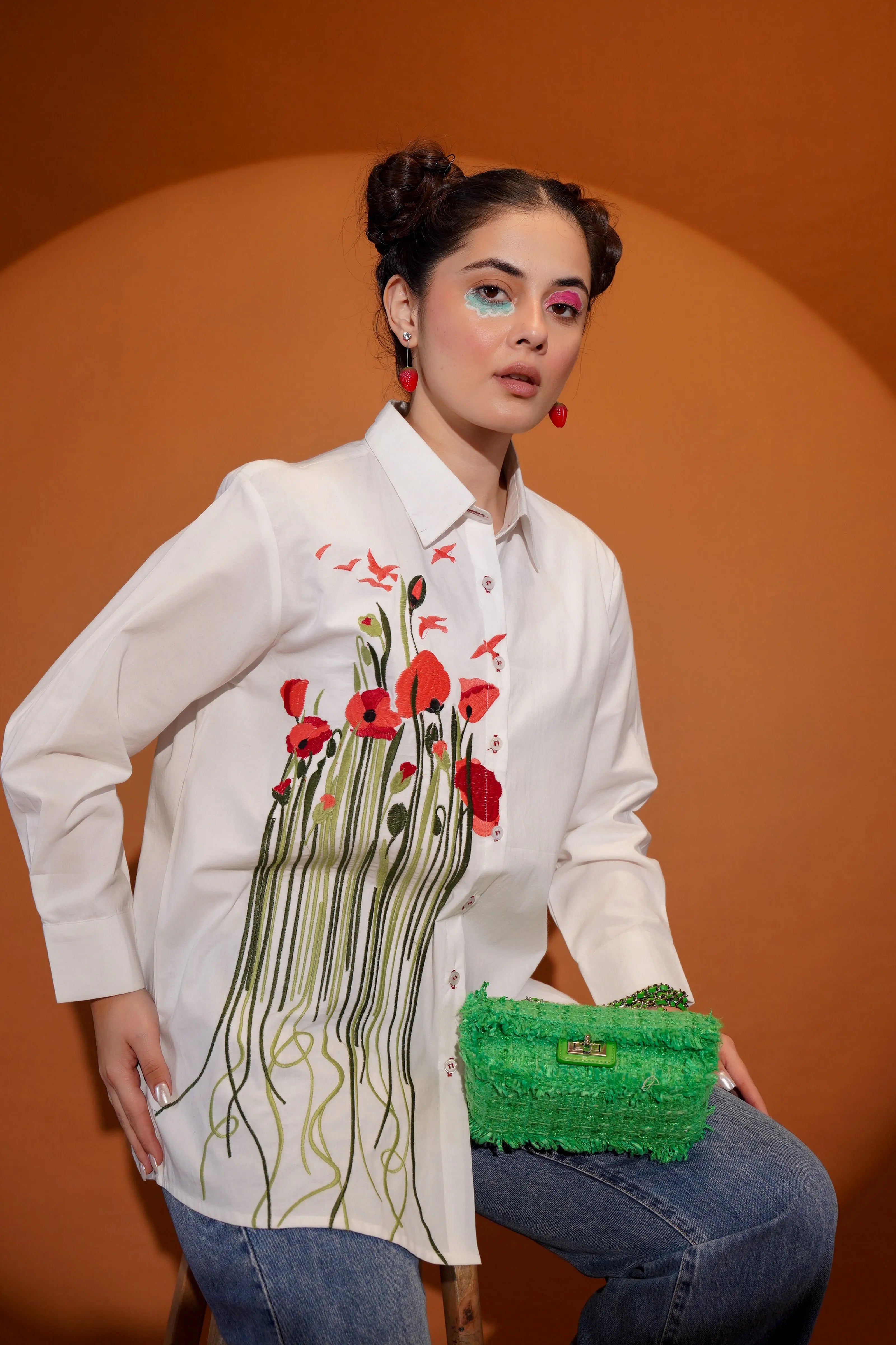 Key Features: • Fabric: Crisp and breathable cotton poplin • Color: Clean white base with multicolour floral and leaf embroidery • Design Details: Full sleeves, shirt collar, front button closure • Embroidery: Bold multicolour motif across front with artistic stem detailing • Fit: Relaxed, modern silhouette that moves with you