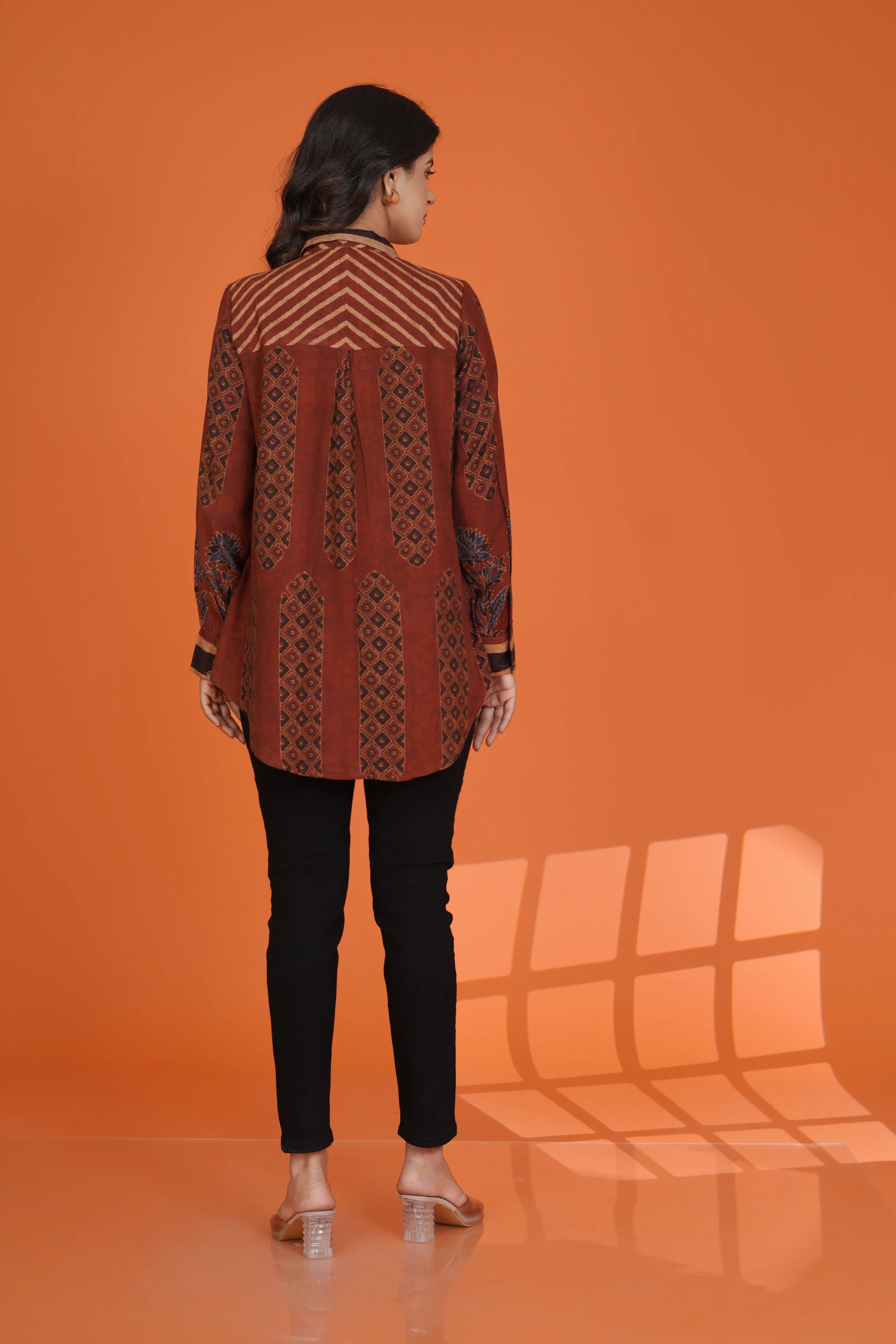 Rust Abstract Printed Shirt with Asymmetric Hem in Muslin