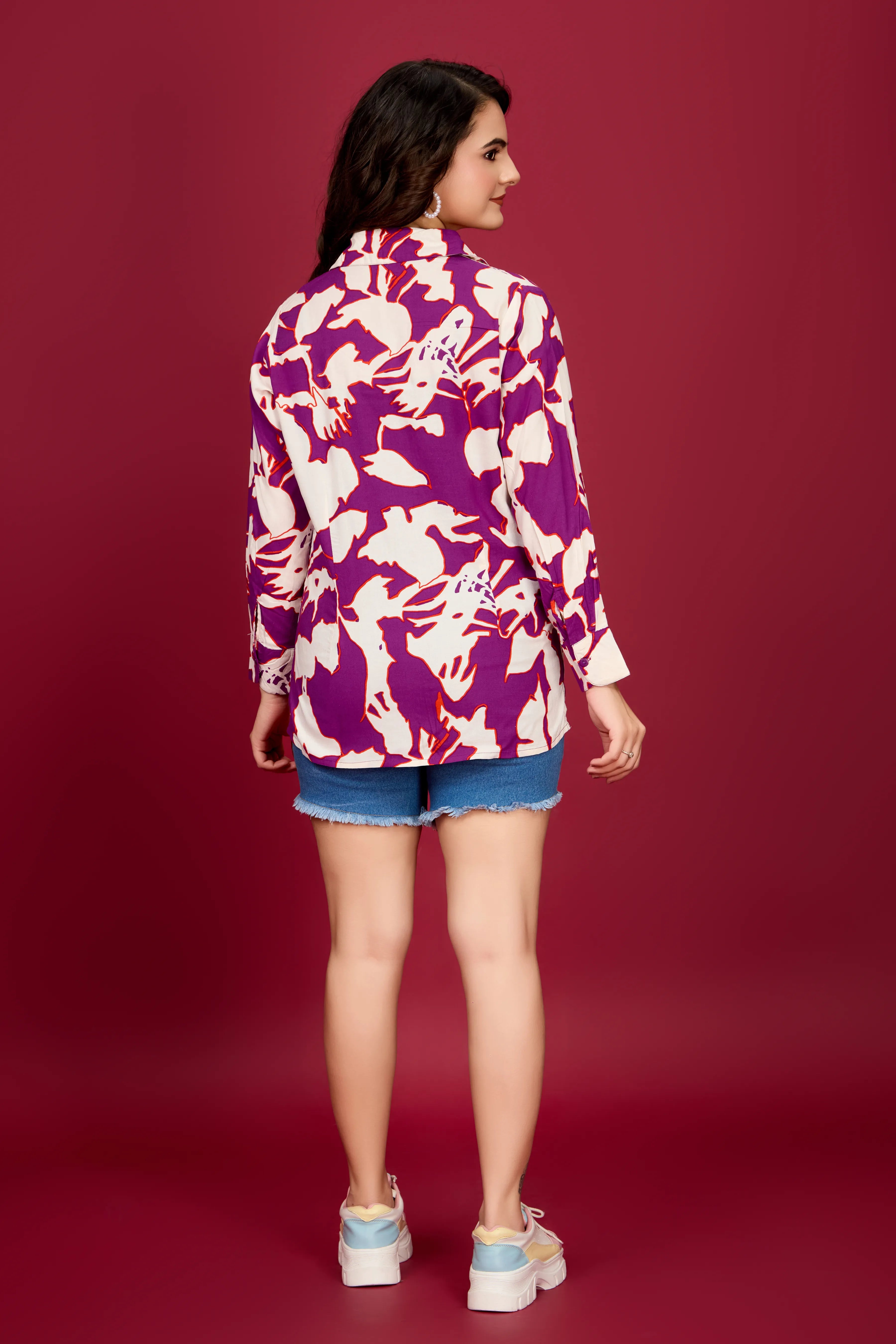 Purple Printed Viscose Shirt with Rhinestone Leaf Collar