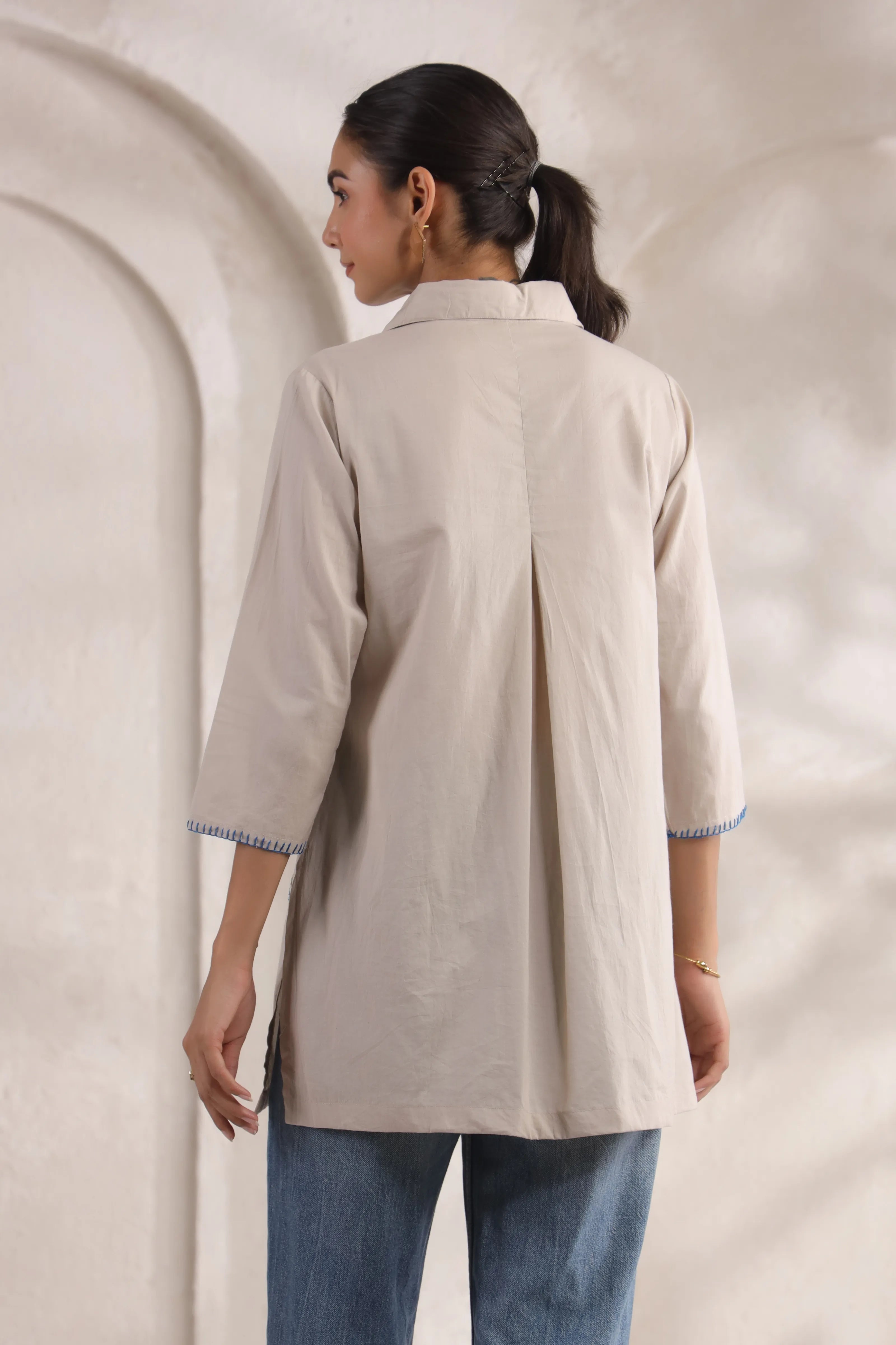 Navy Chambray Embroidered Shirt with Geometric Detailing