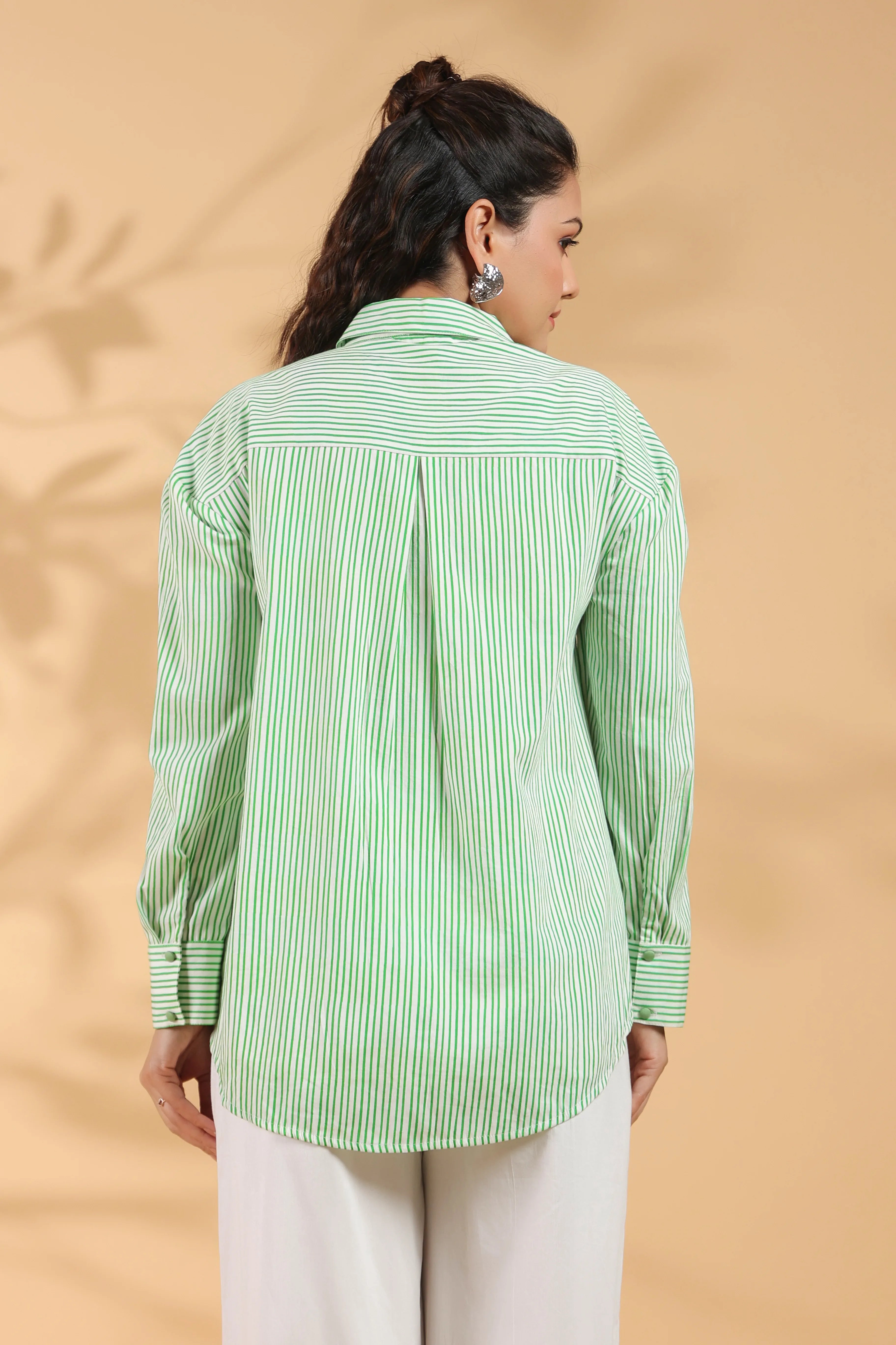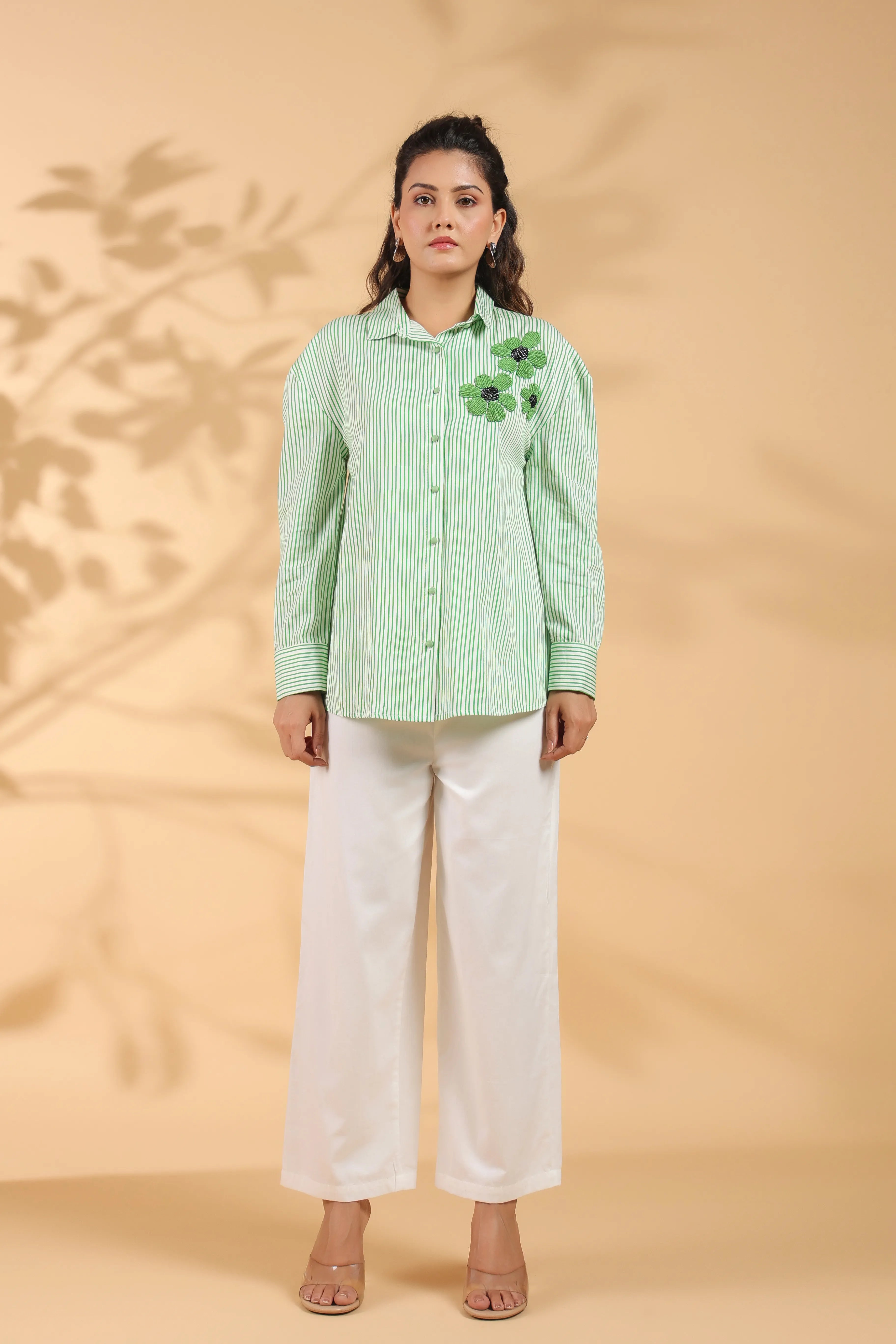 Green & White Stripe Cotton Satin Beaded flower Embroidered Shirt