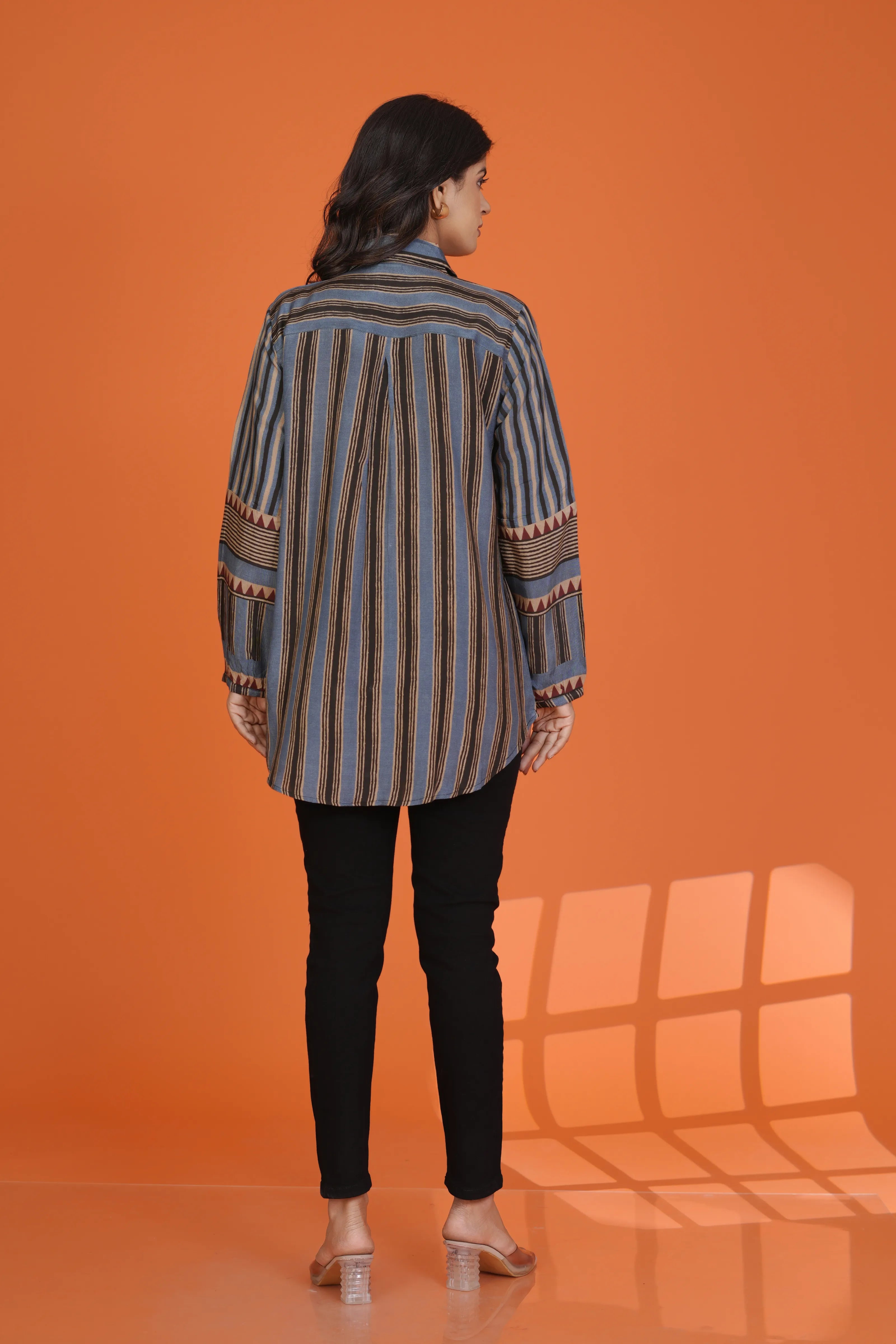 Navy Blue Base & Beige Striped Block Printed Cotton Oversized Shirt