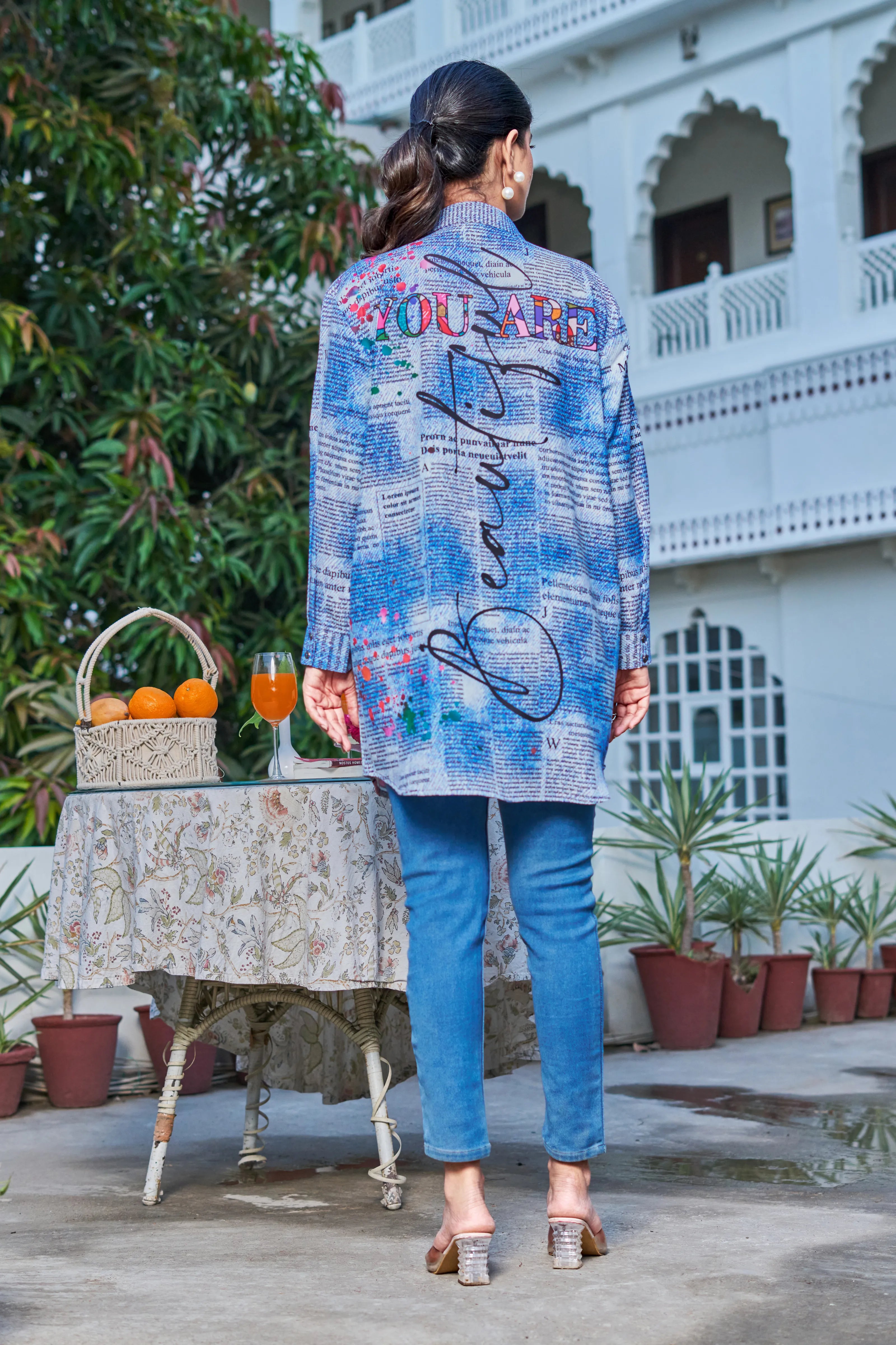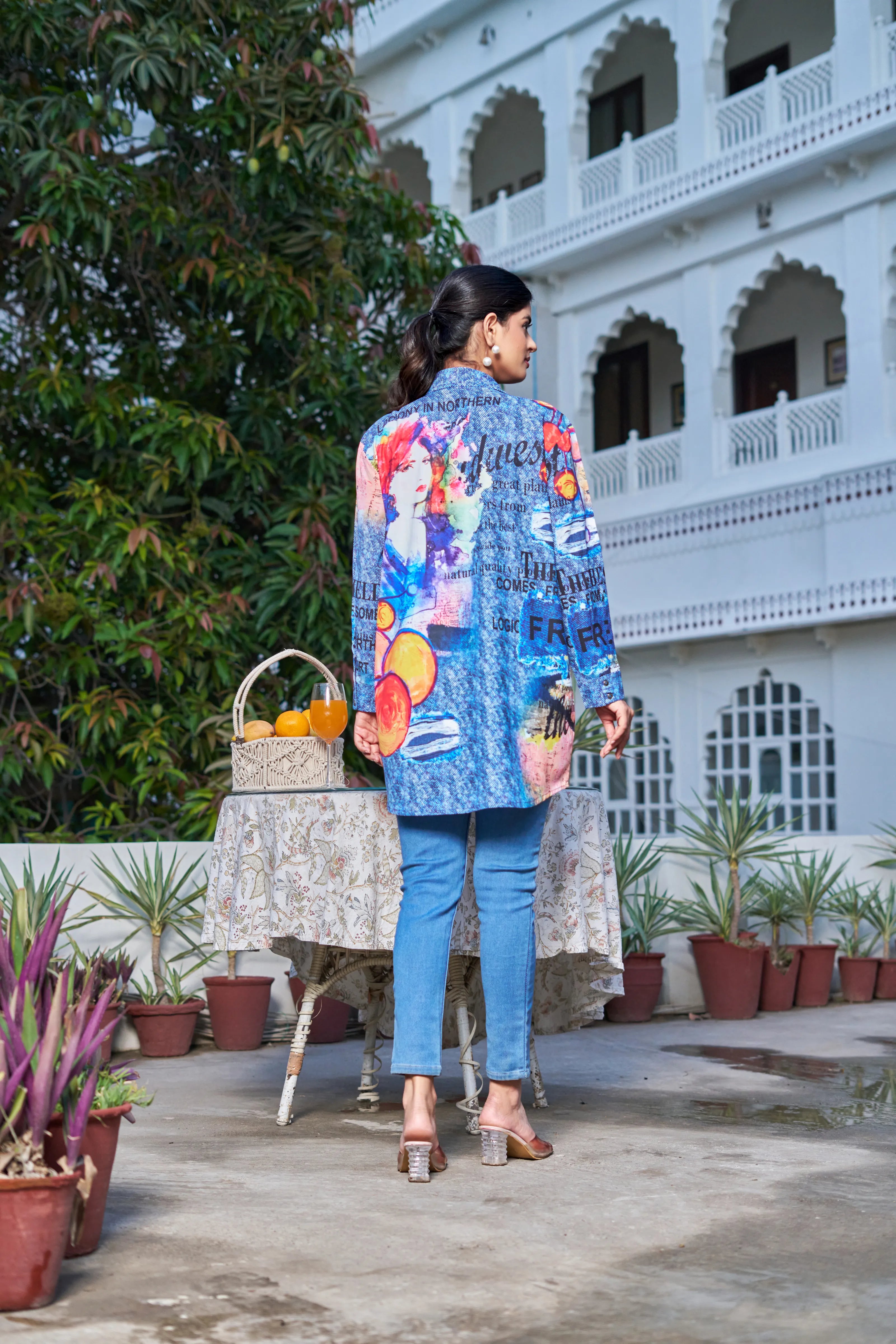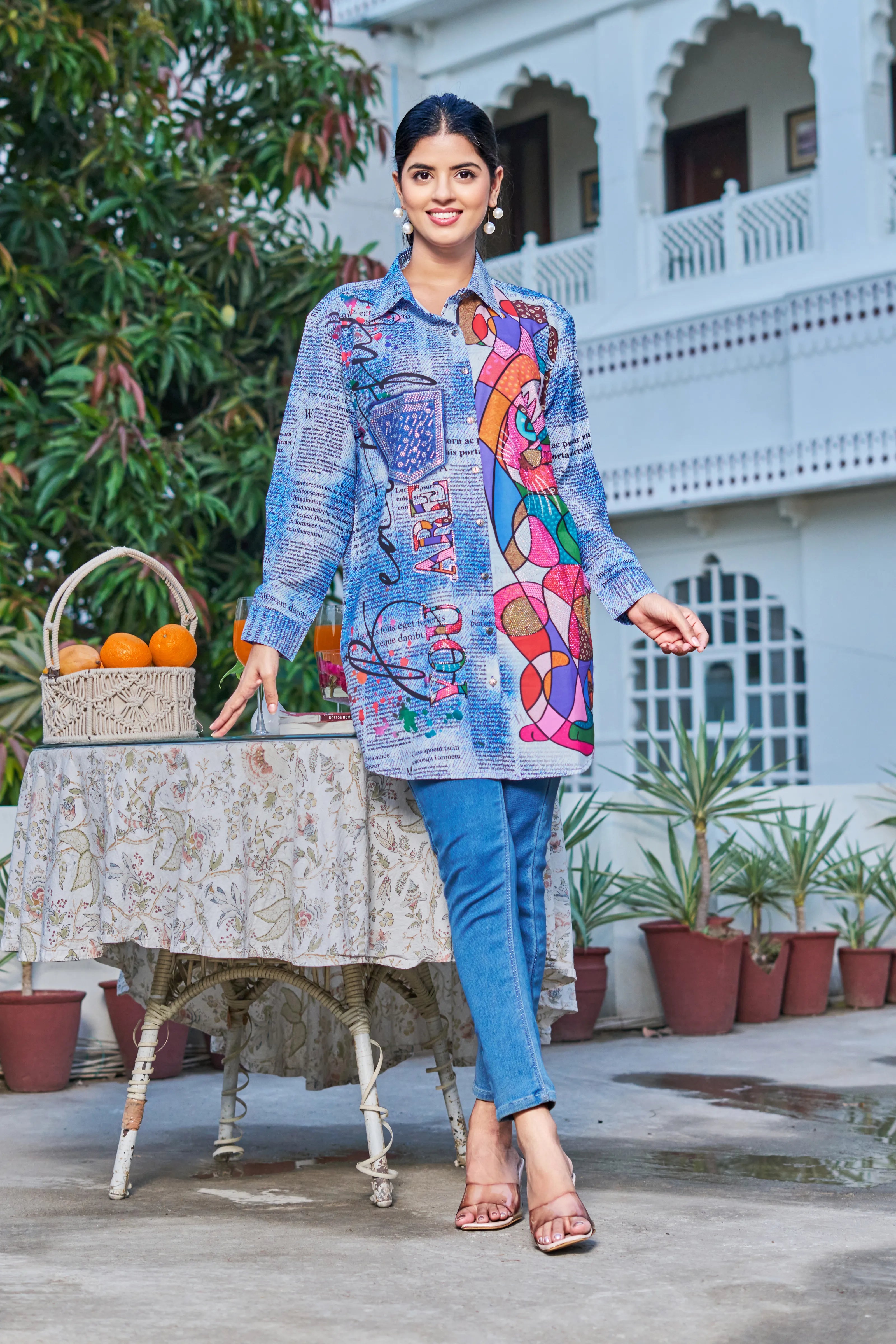 Multicolor Rhinestone Pop-Art Longline Shirt in Poly Muslin