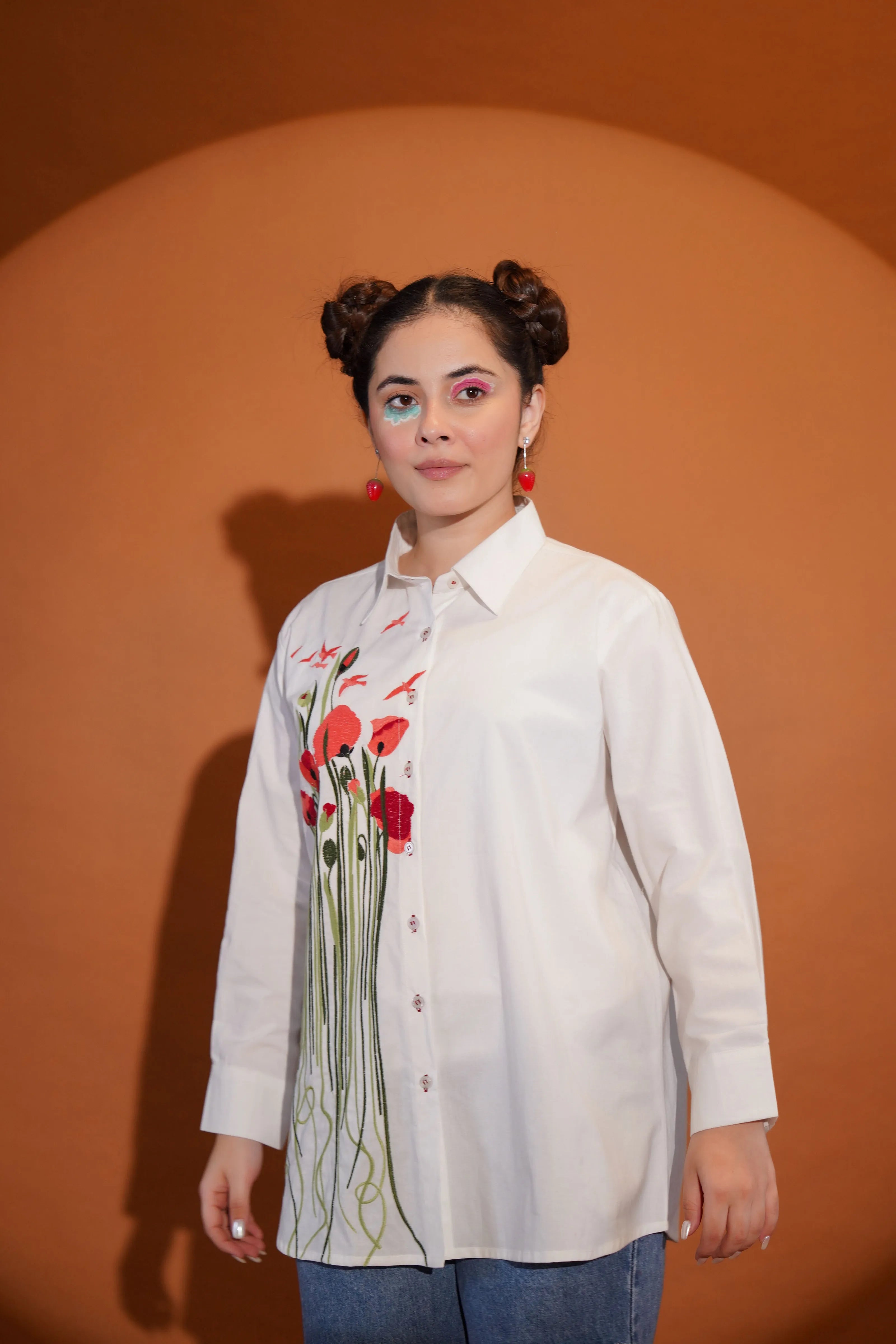 White Shirt with Multicolour Floral Embroidery in Cotton Poplin