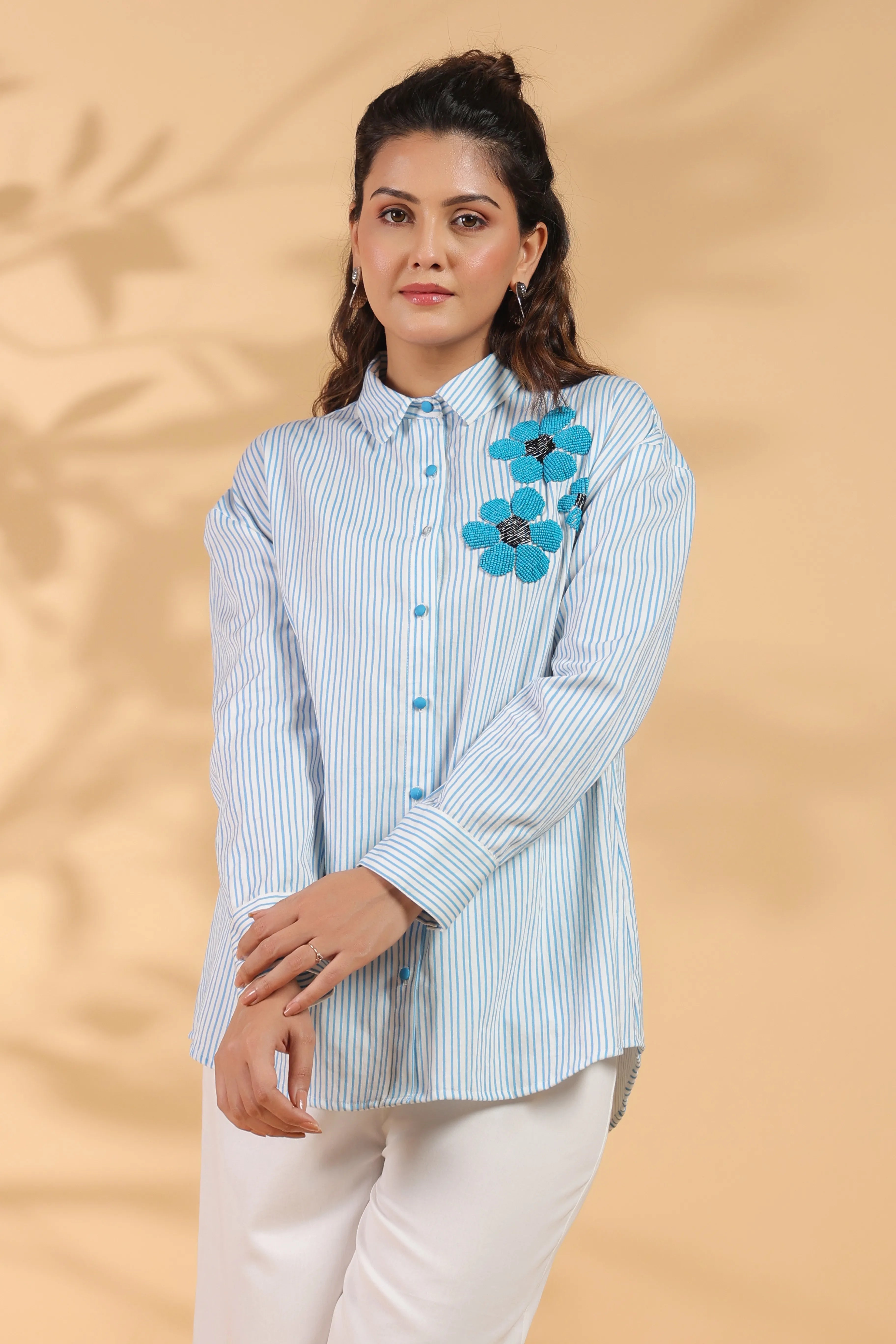 Blue & White Stripe Cotton Satin Beaded flower Embroidered Shirt