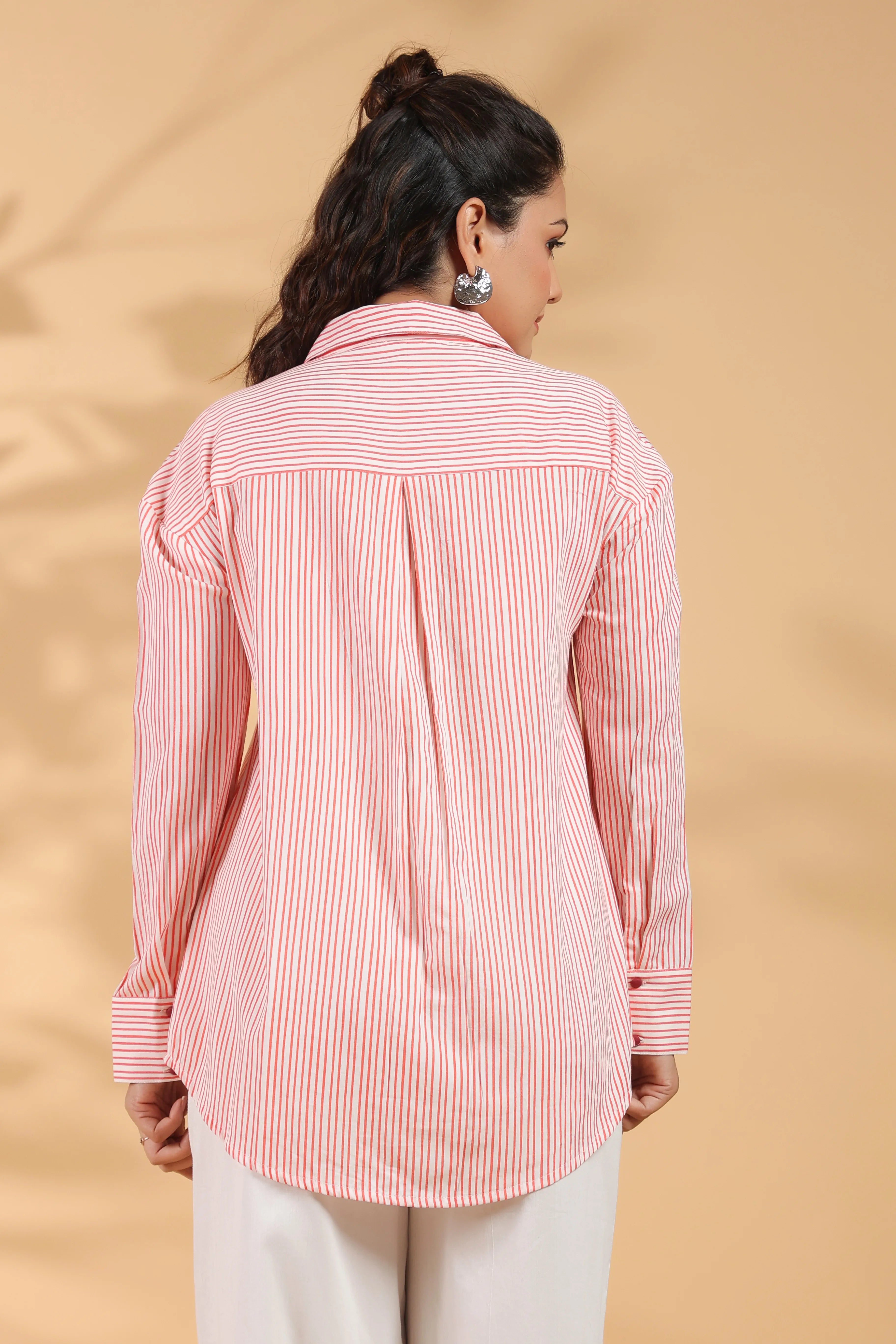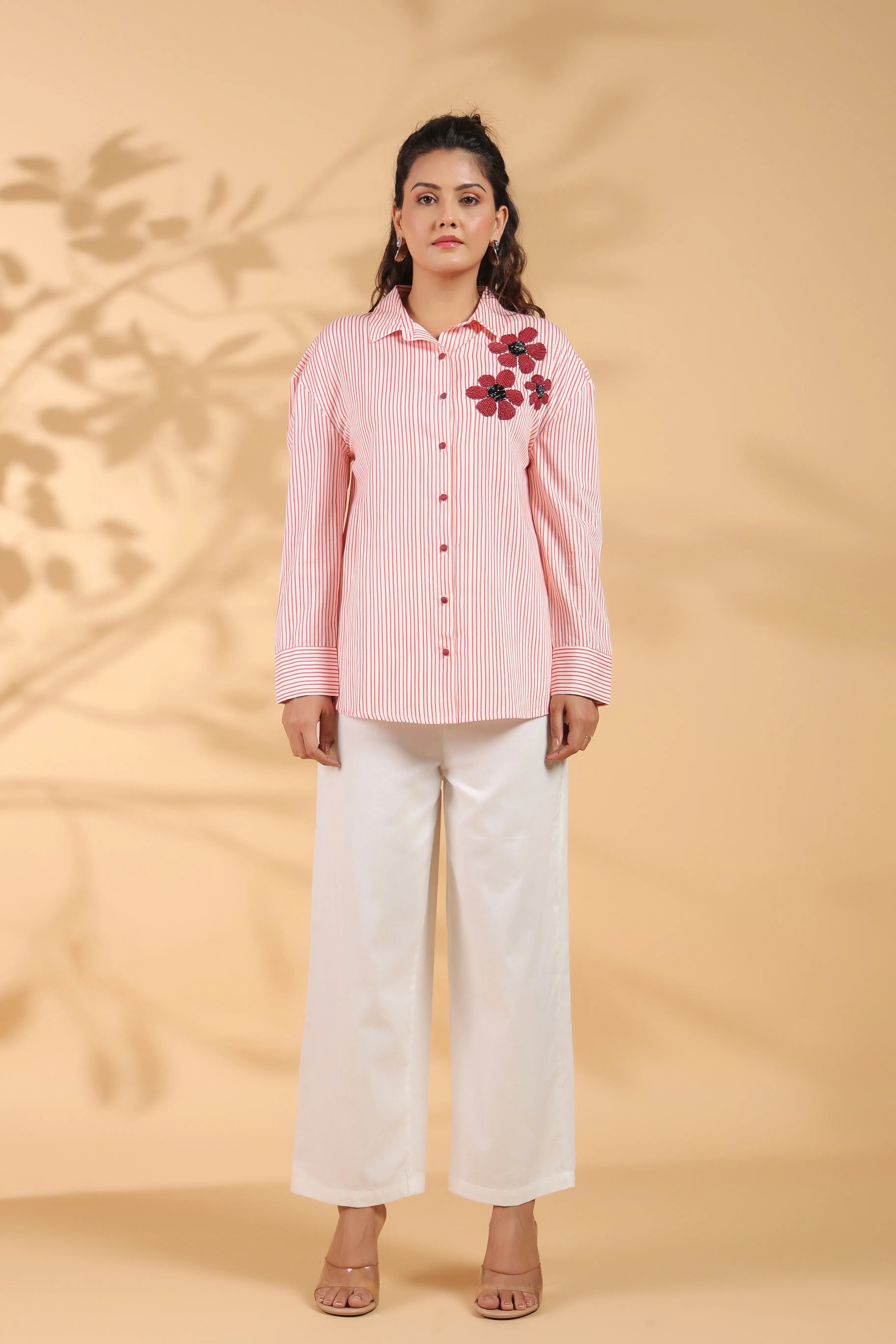 Red & White Stripe Cotton Satin Beaded flower Embroidered Shirt