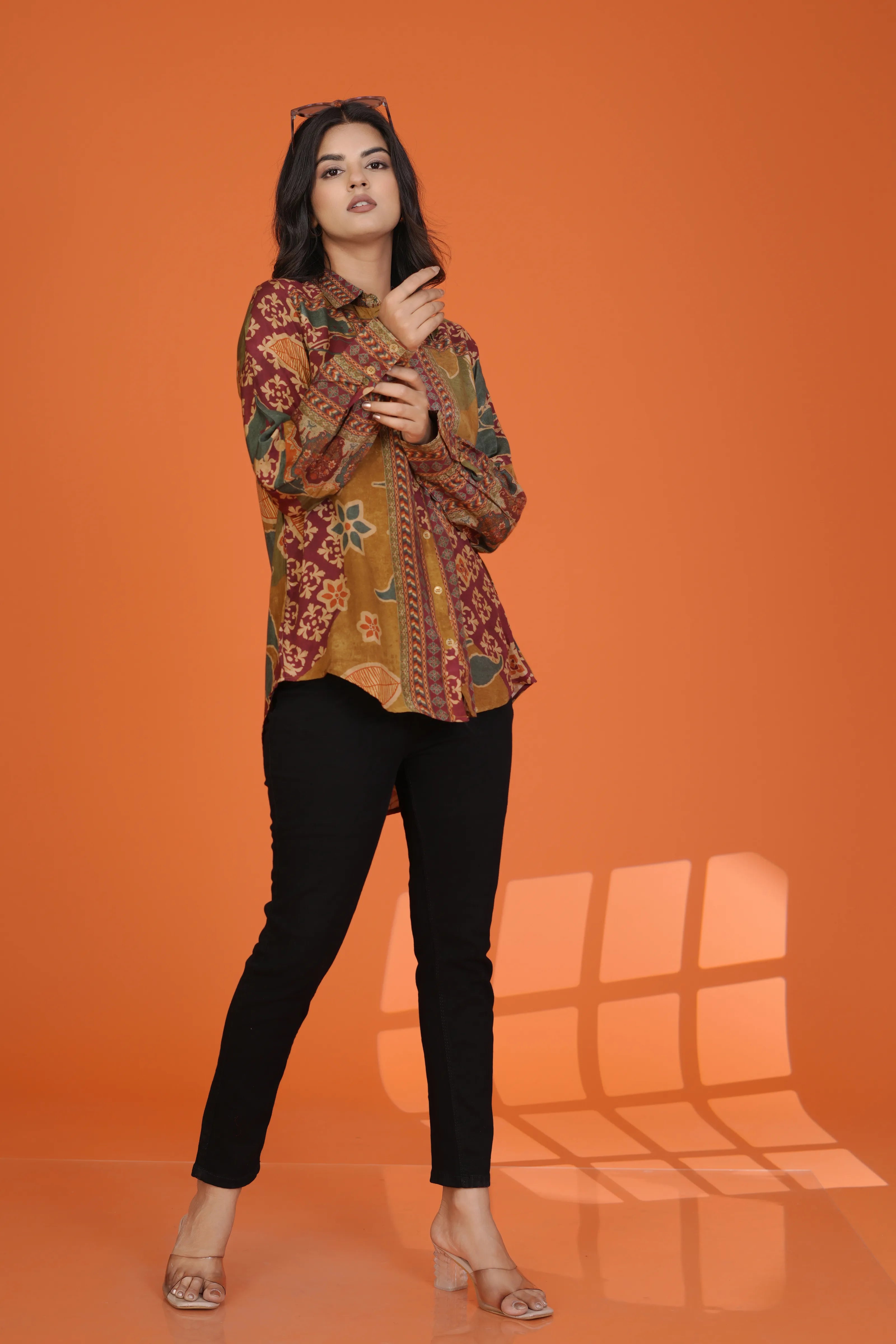 Orange Multi Floral Printed Rhinestone Cotton Cambric Shirt