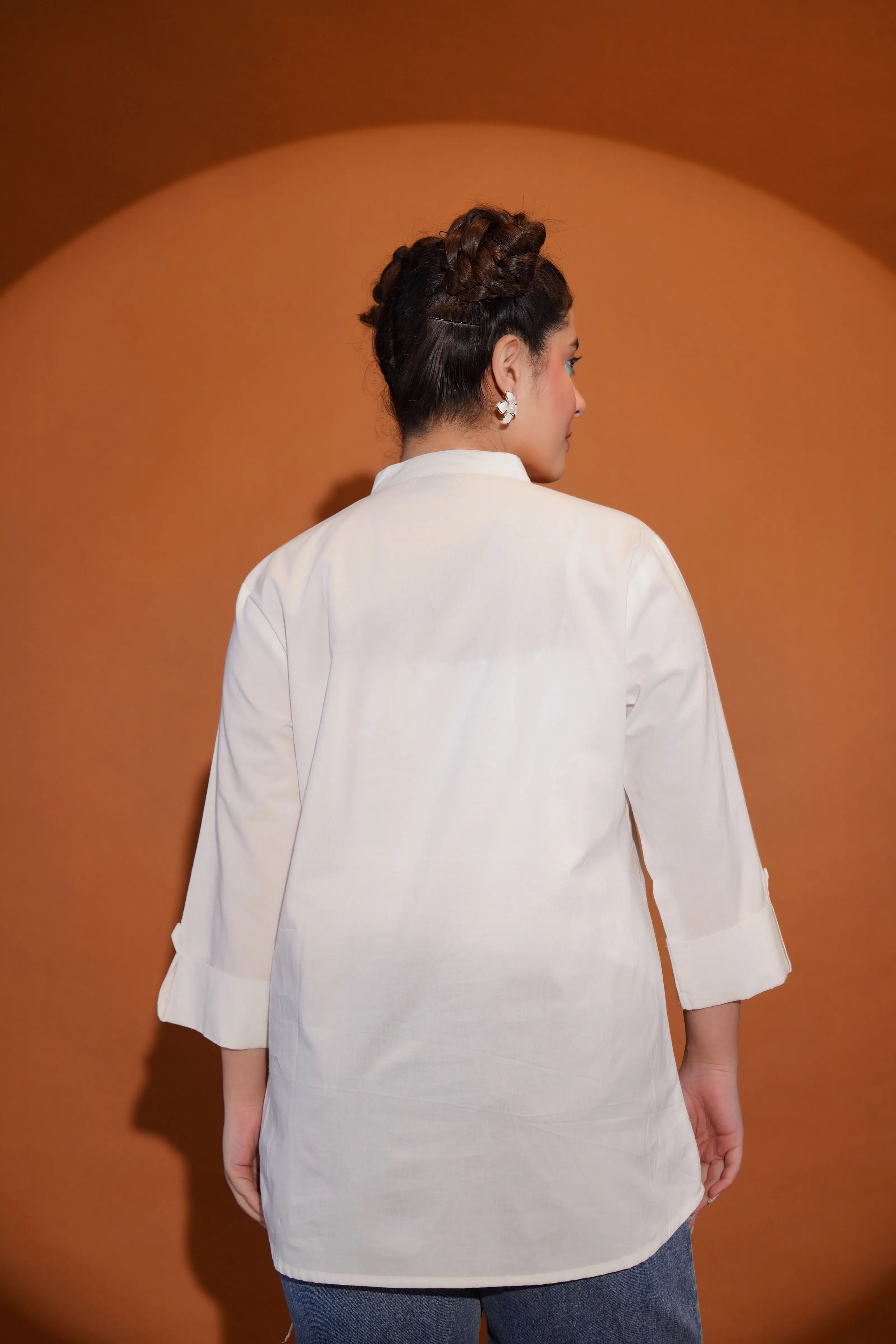 White Embroidered Mandarin Collar Cotton Poplin Shirt