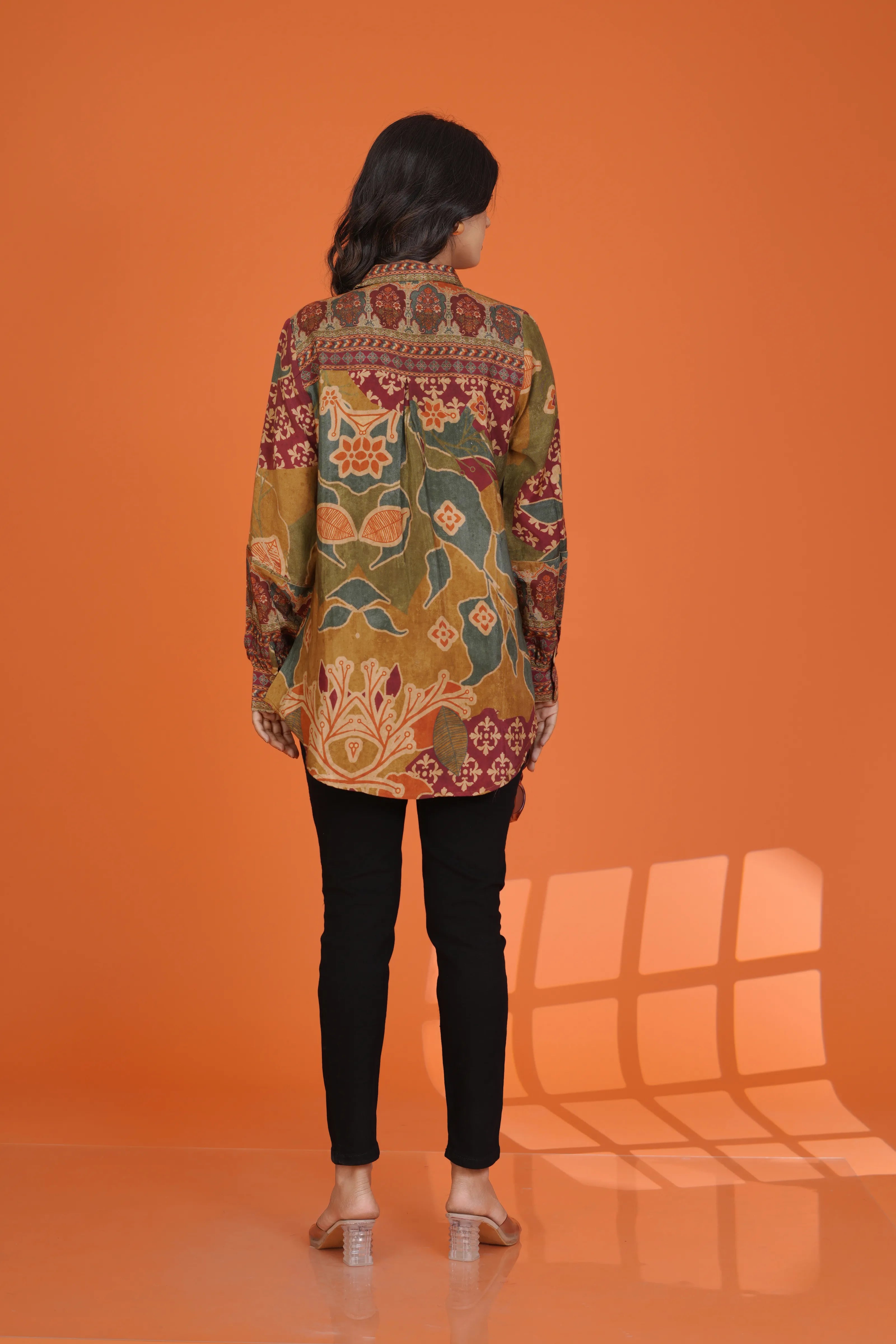 Orange Printed Viscose Shirt with Rhinestone Floral Collar