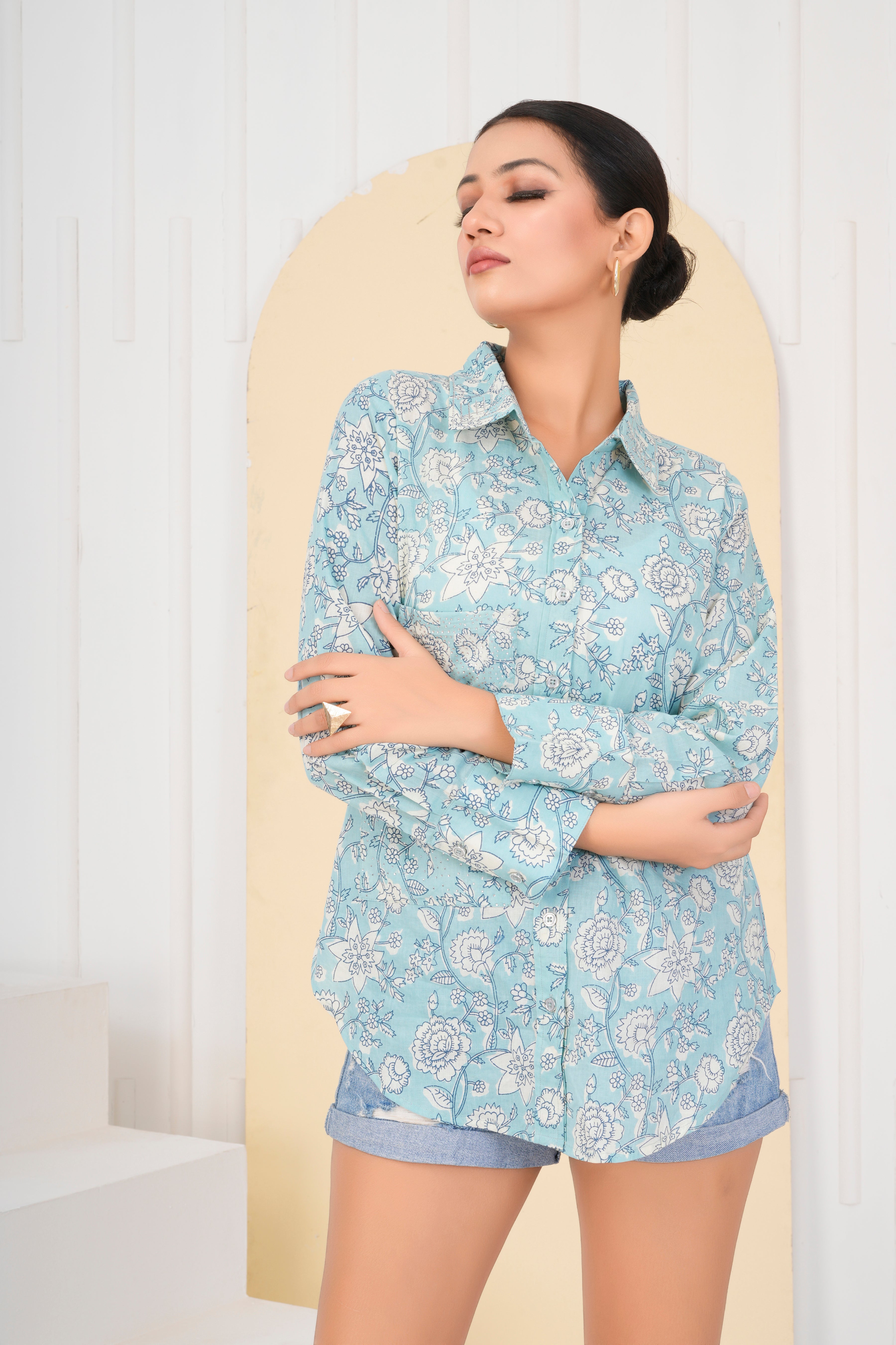 Aqua Color Floral Printed Rhinestone Cotton Cambric Shirt