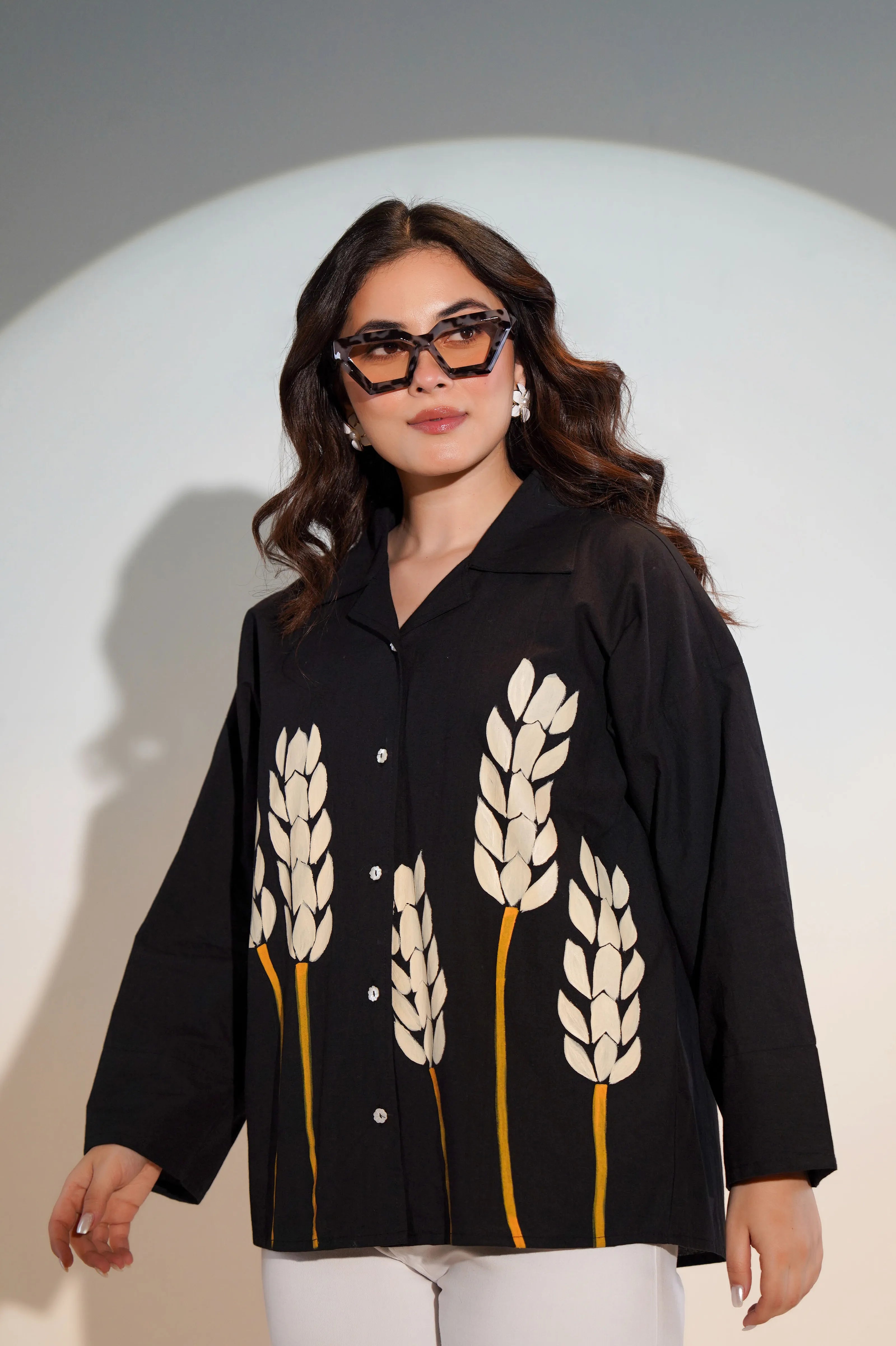 Black Base & Mustard Patch Printed Cotton Oversized Shirt