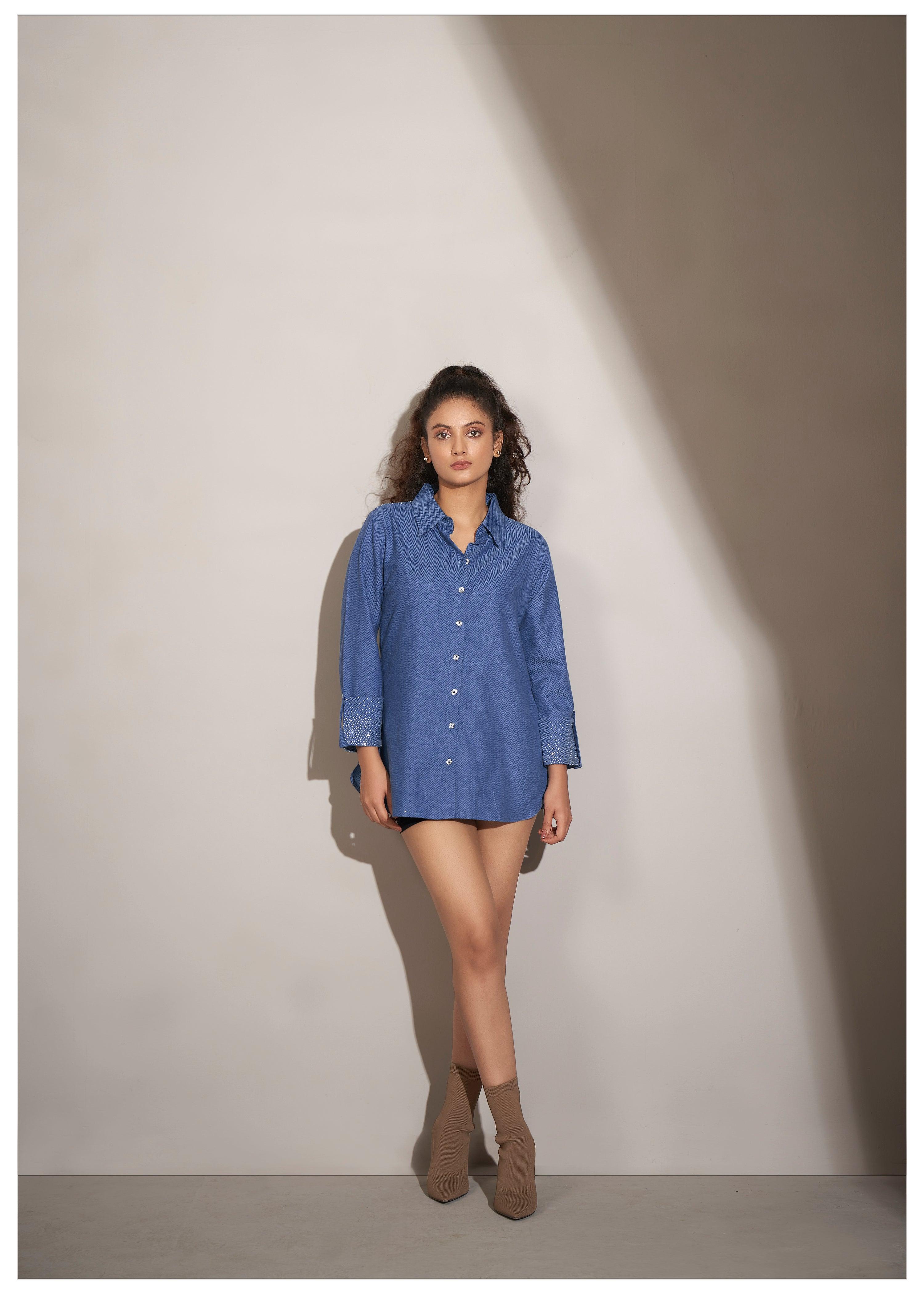 Blue Cotton Twill Weave Shirt with Rhinestone Accents