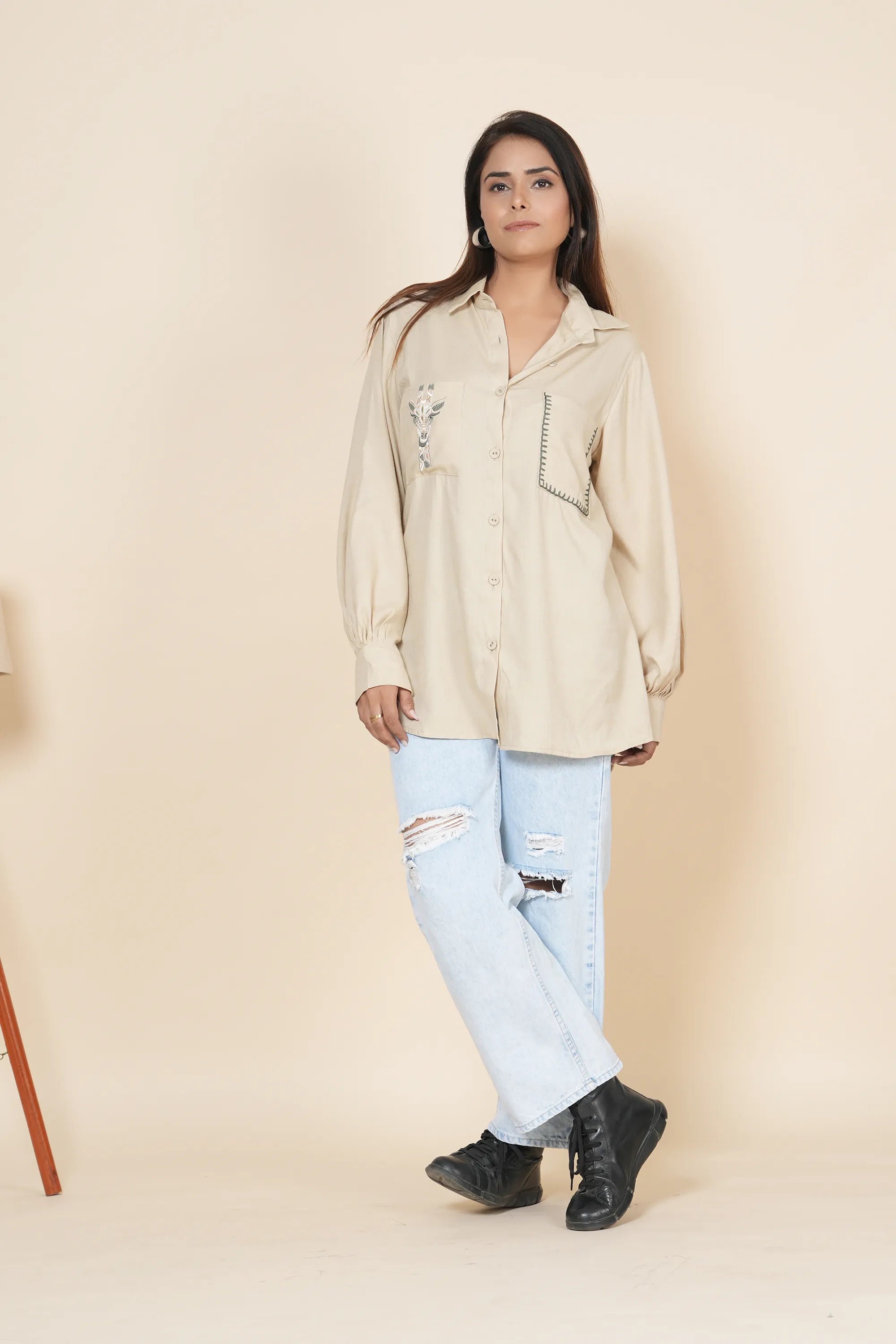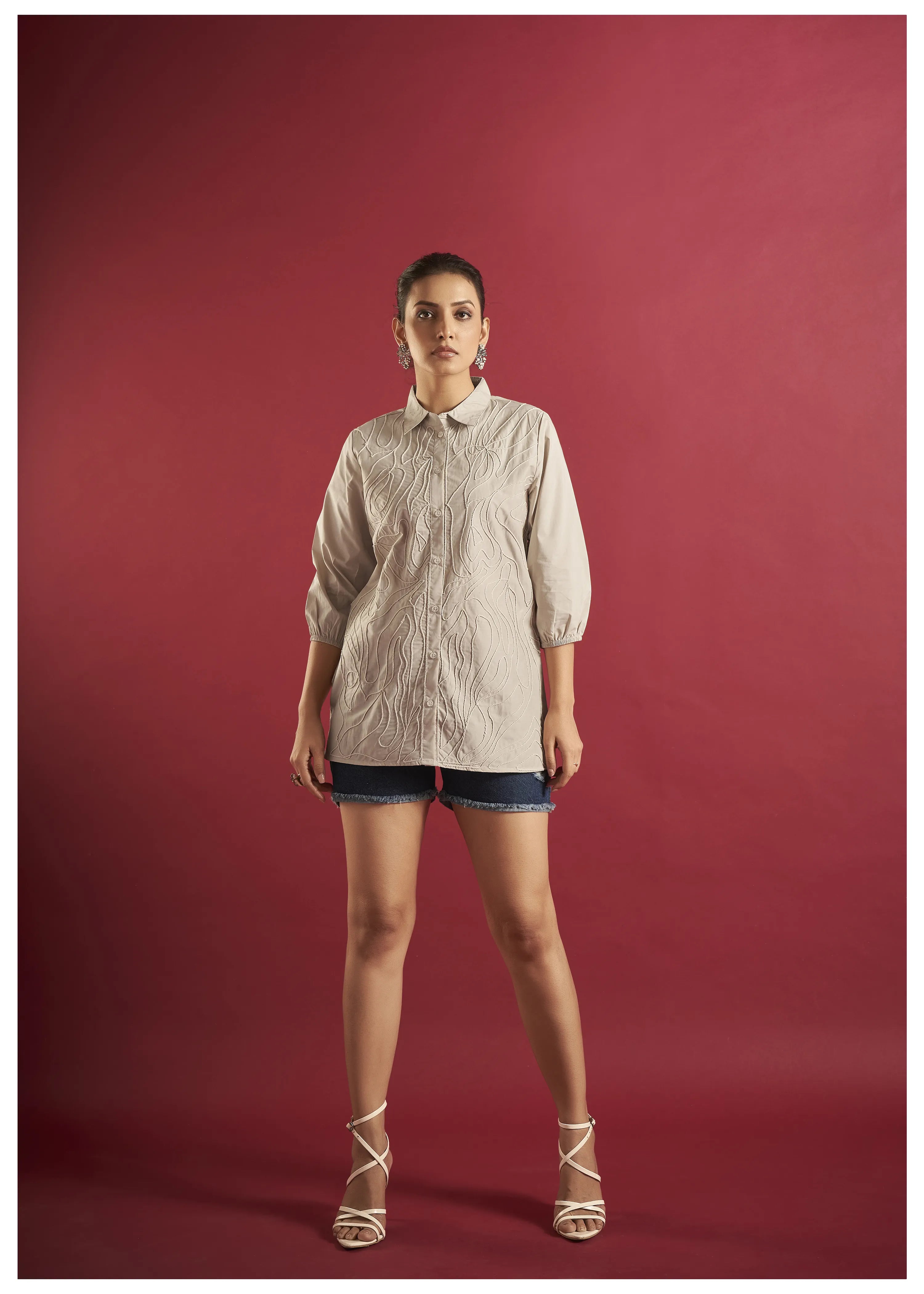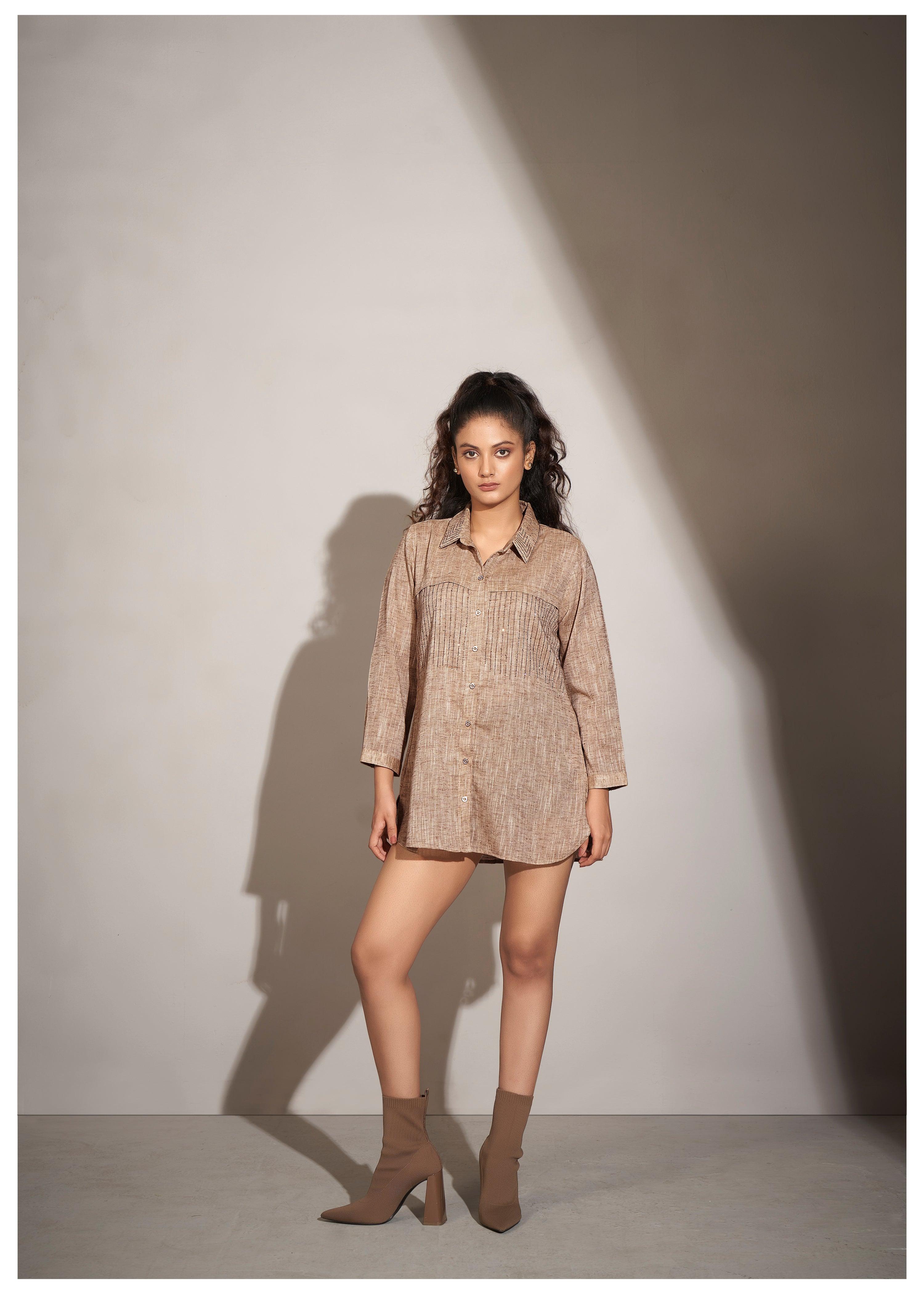 beige linen shirt with thread work embroidery