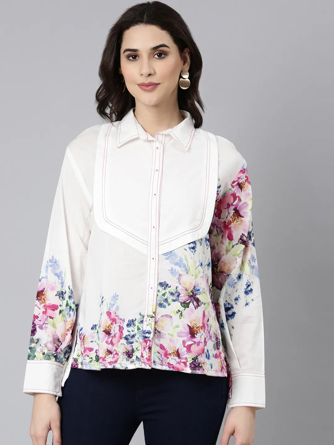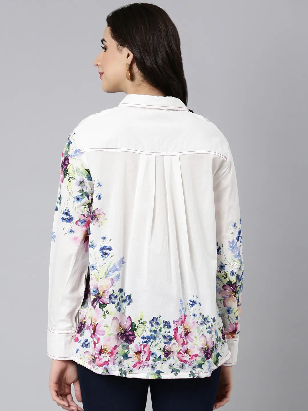 White Cotton Cambric Full-Sleeve Floral Placement Print Shirts
