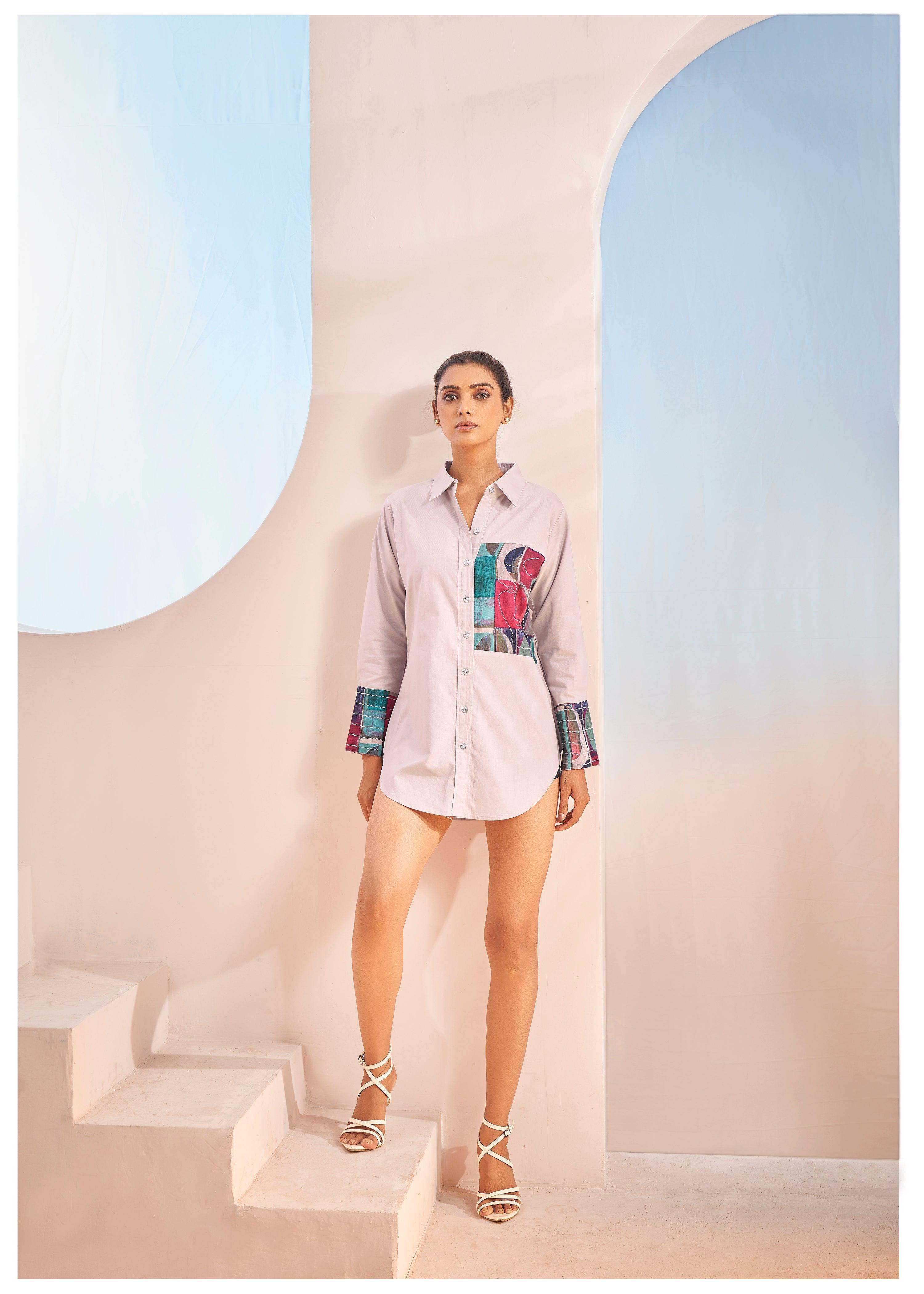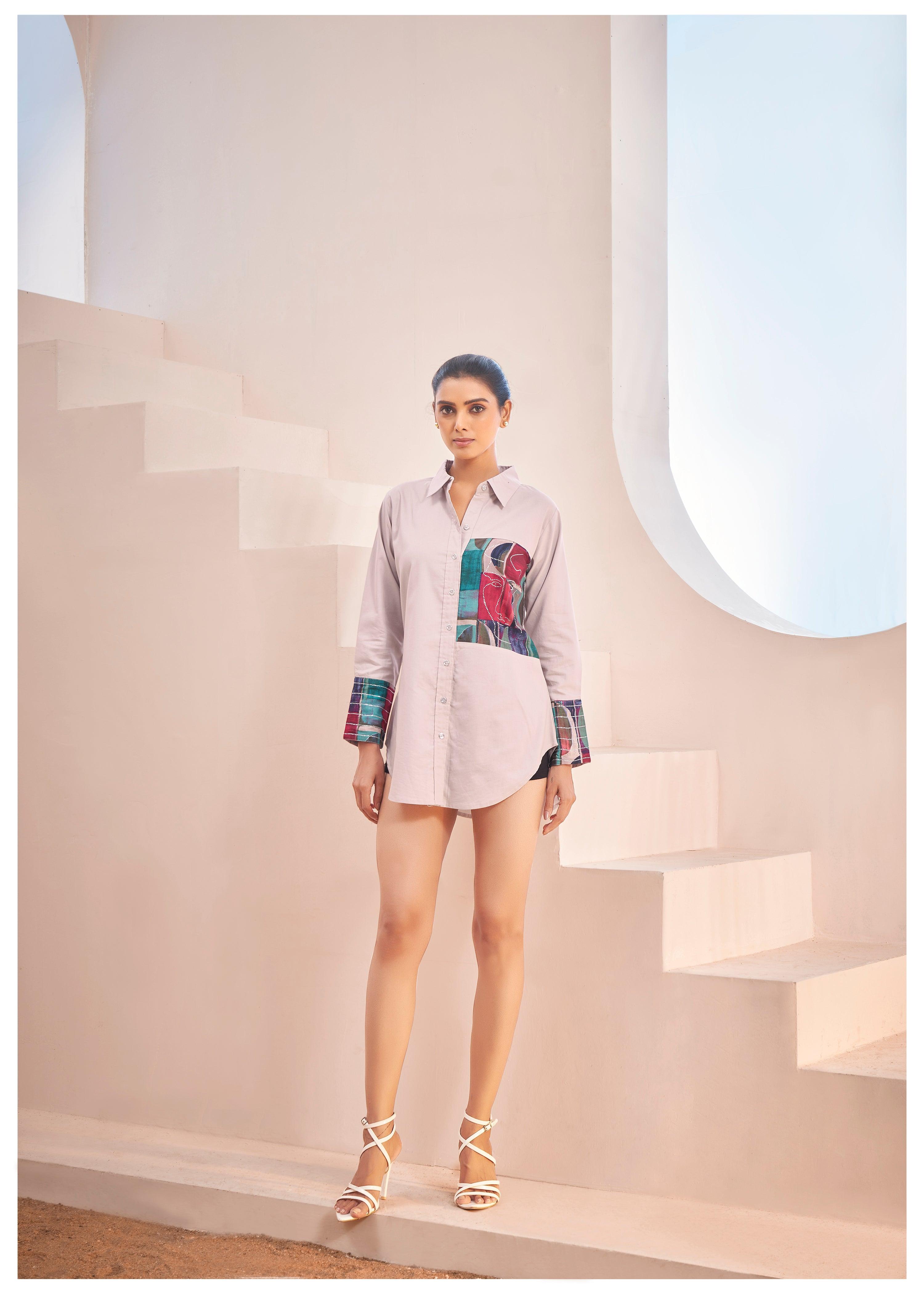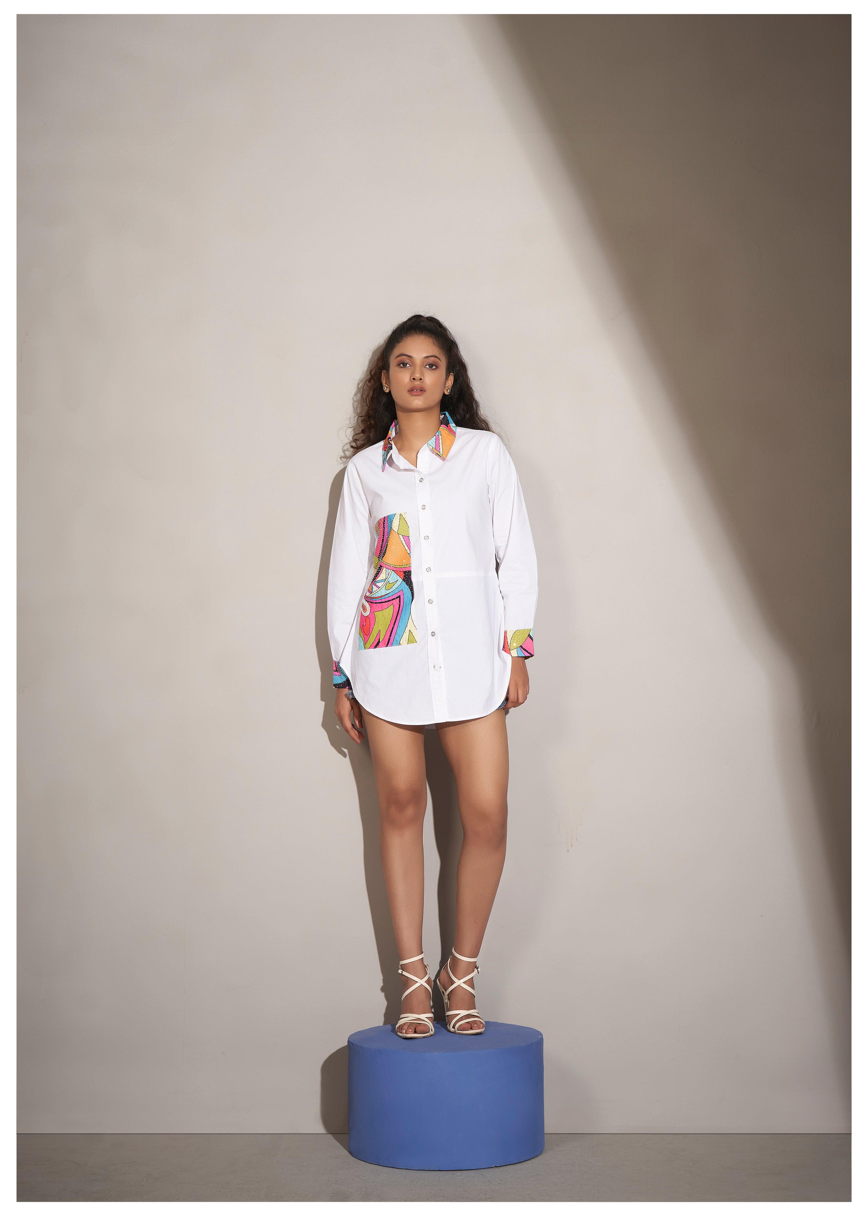 White Cotton Cambric Full-Sleeve Shirt with Patch Print