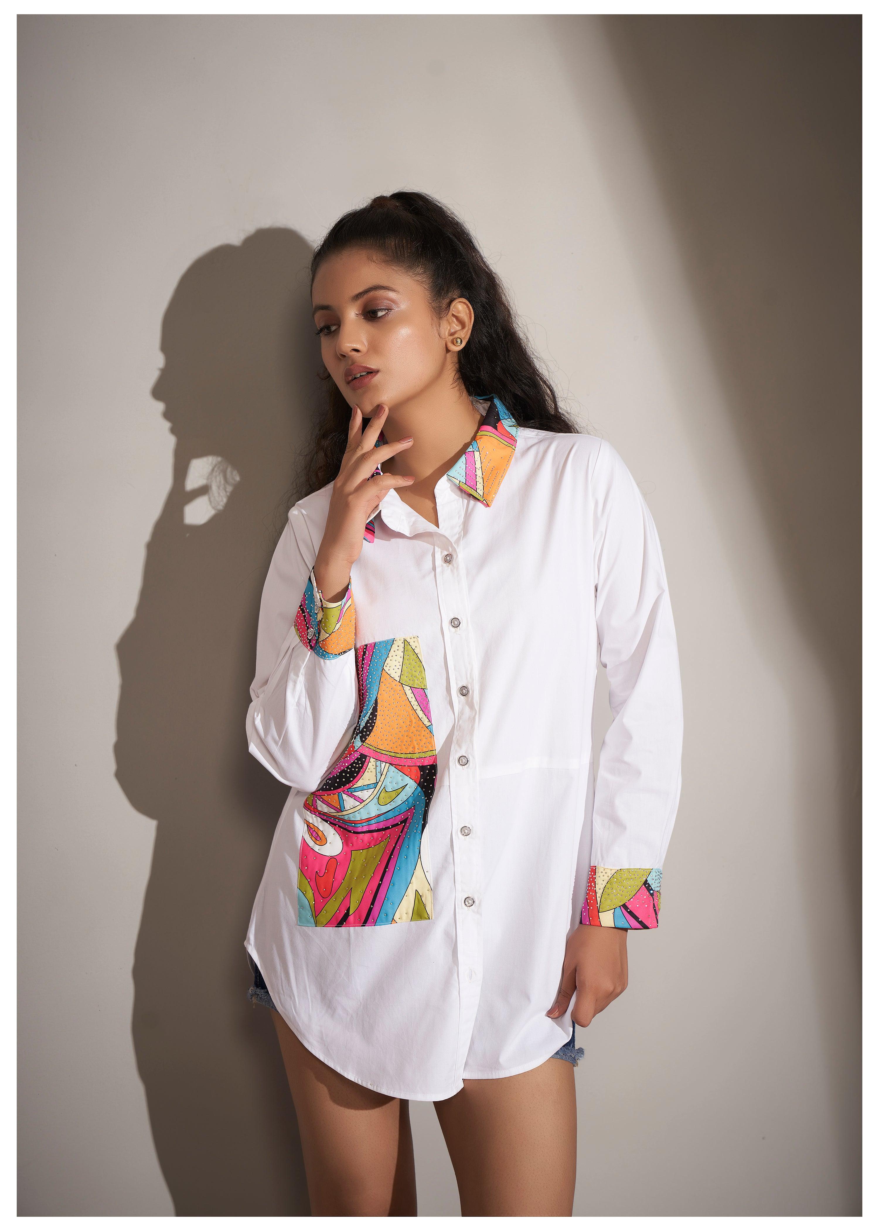 White Cotton Shirt with Pop Art Print and Rhinestone Accents