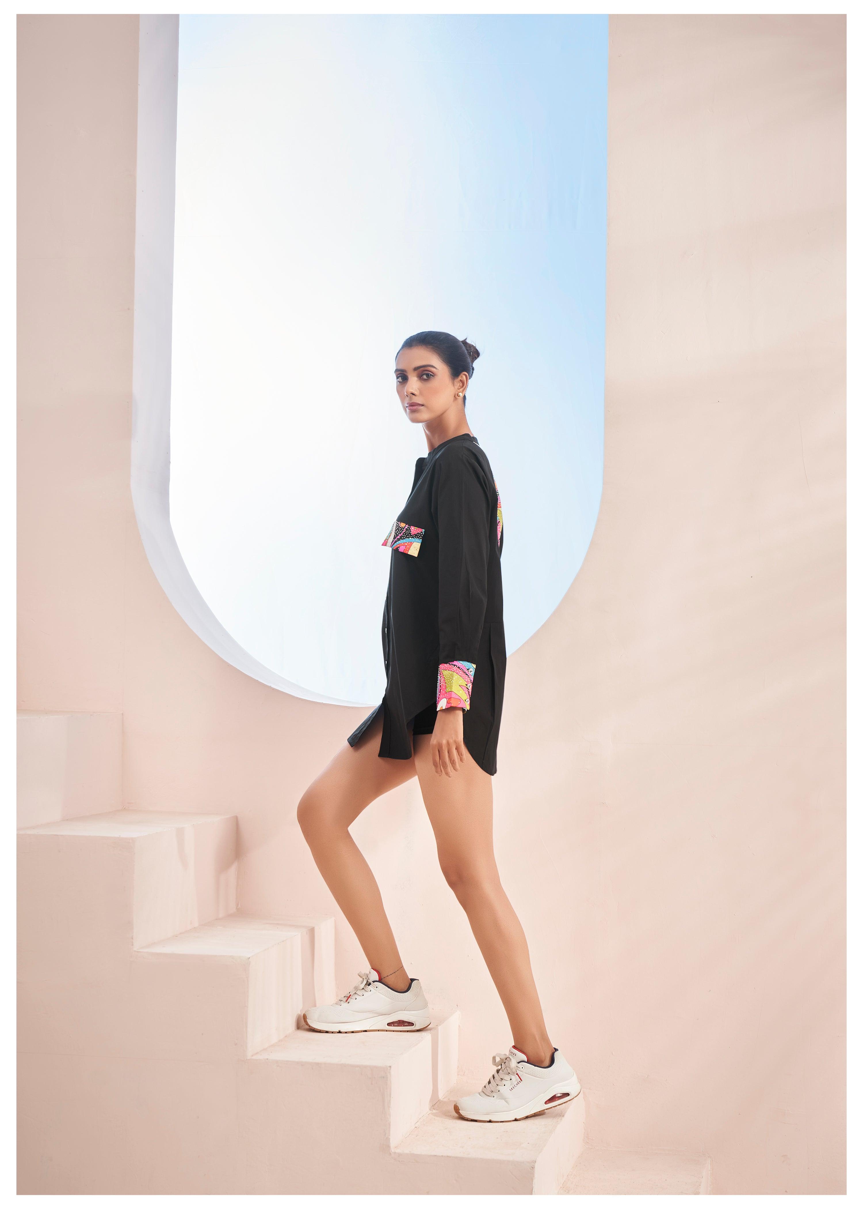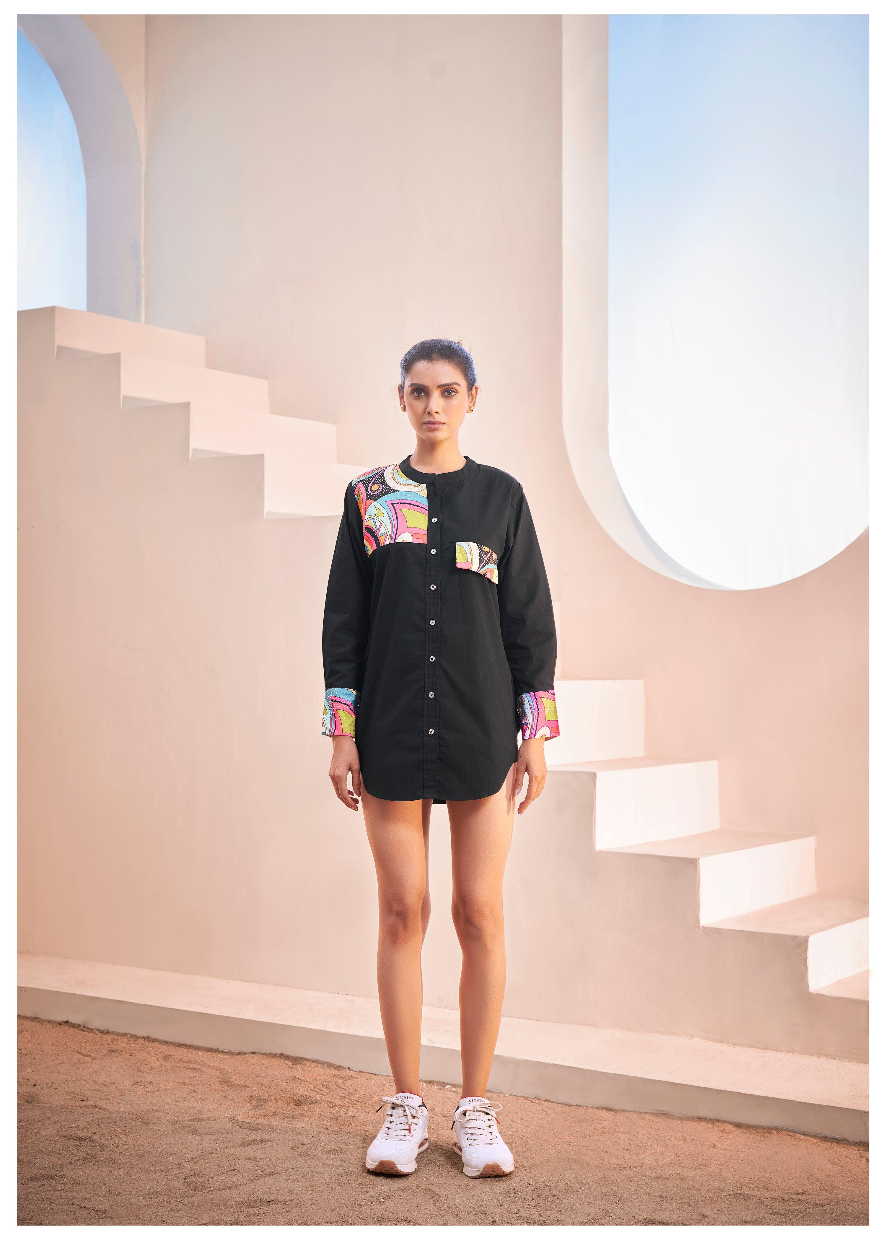 Black Cotton Shirt with Pop Print Patches and Rhinestone