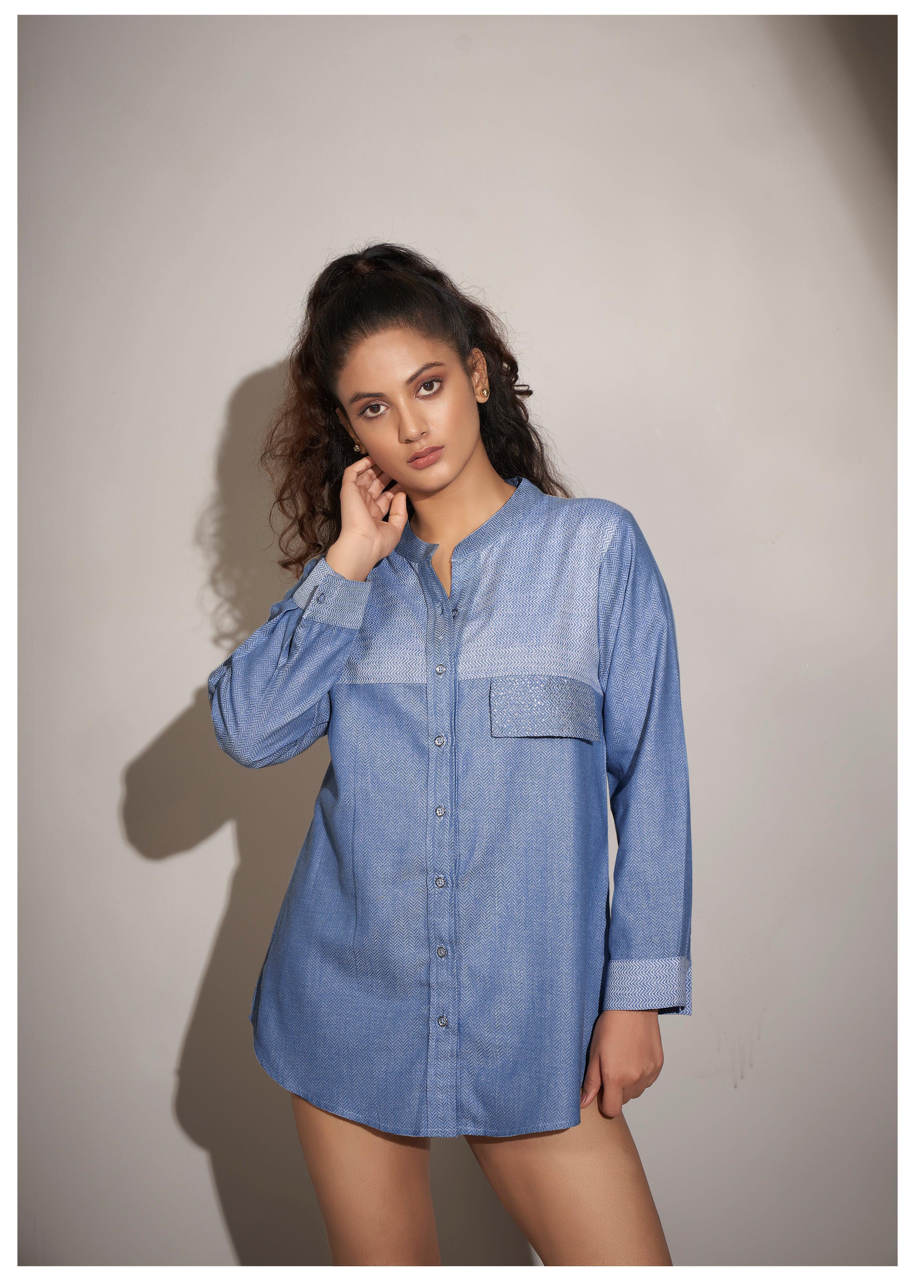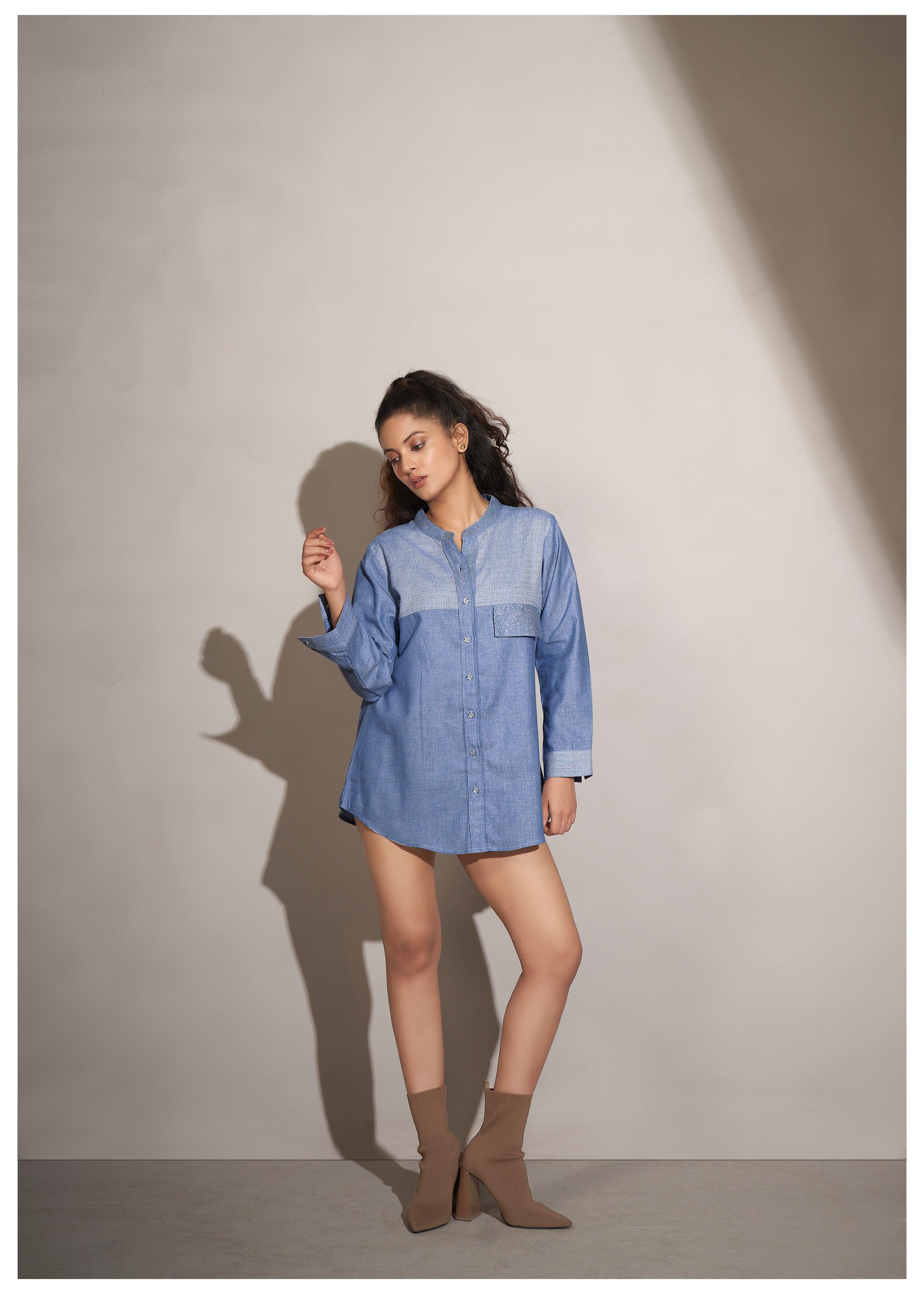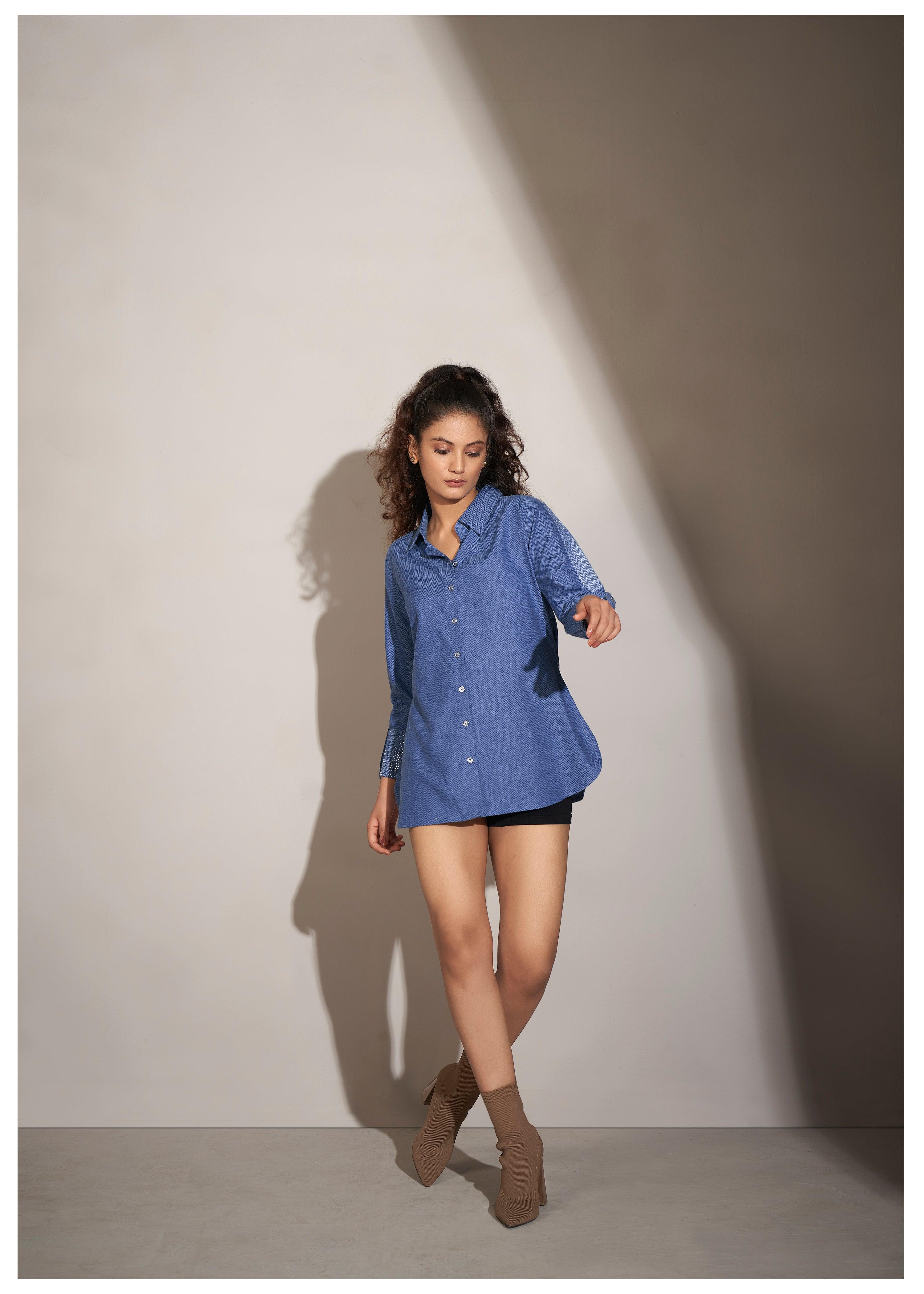 Blue Twill Weave Textured Cotton Shirt with Rhinestone Details