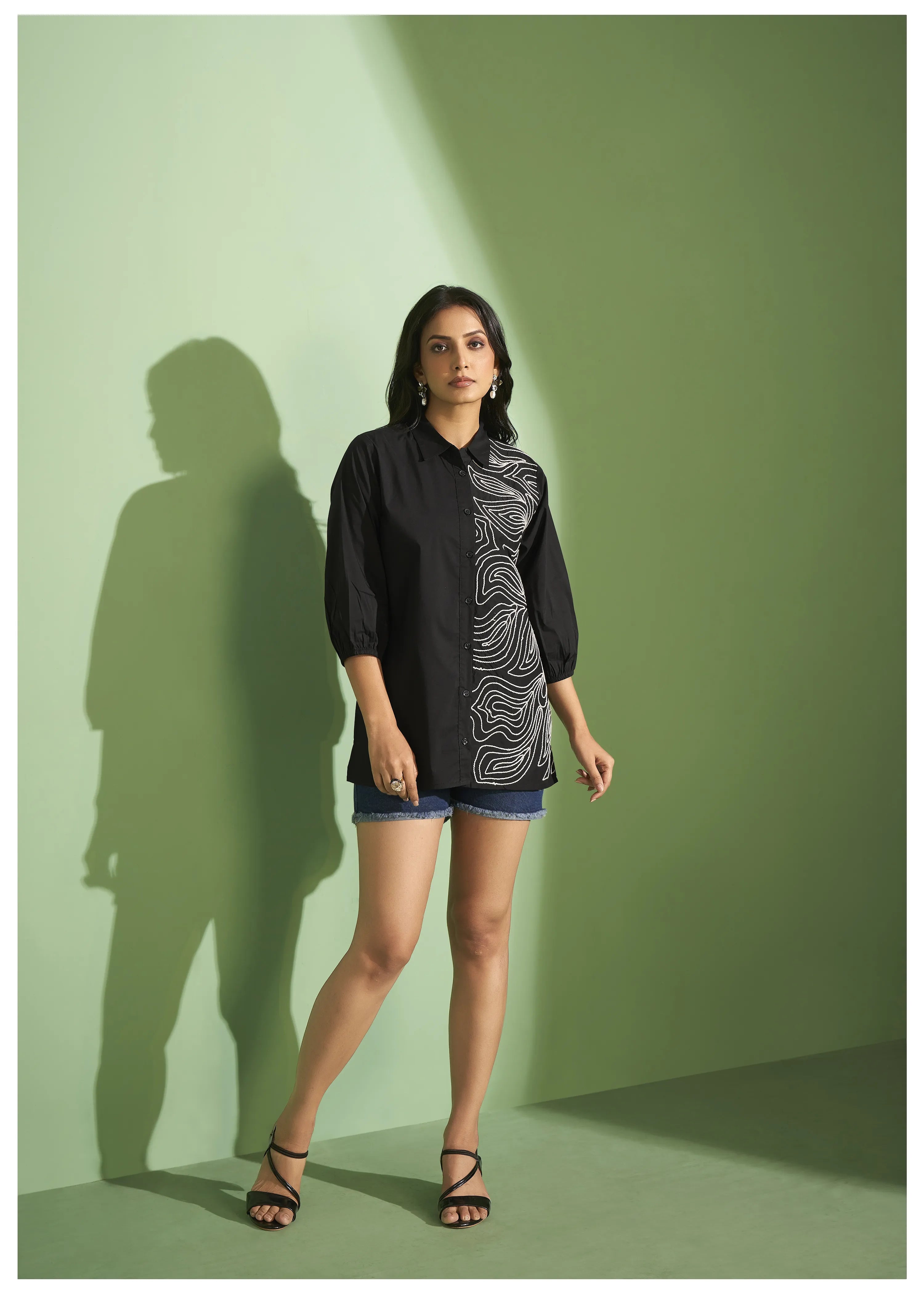 Black Cotton Poplin Shirt with Cord Embroidery