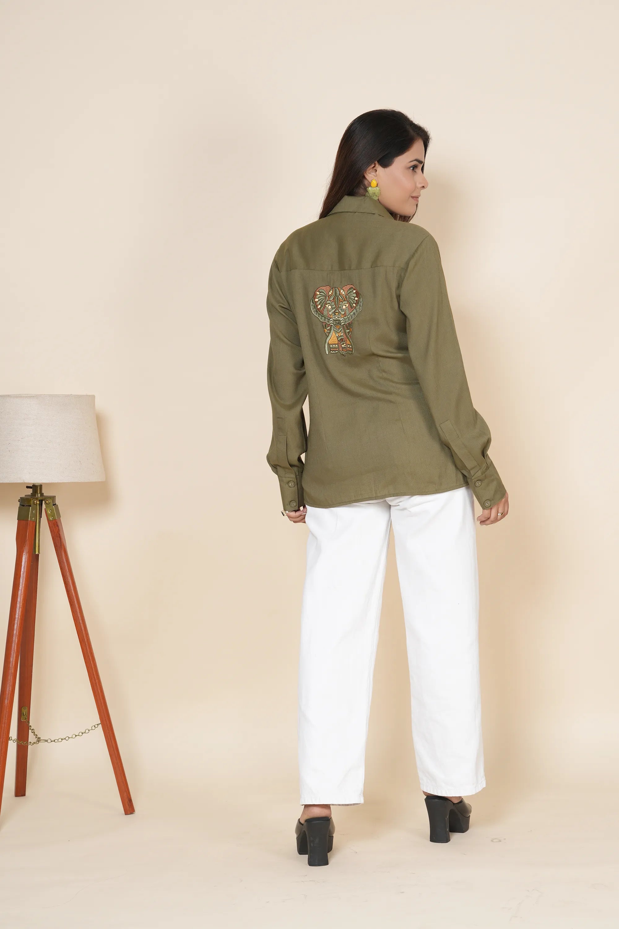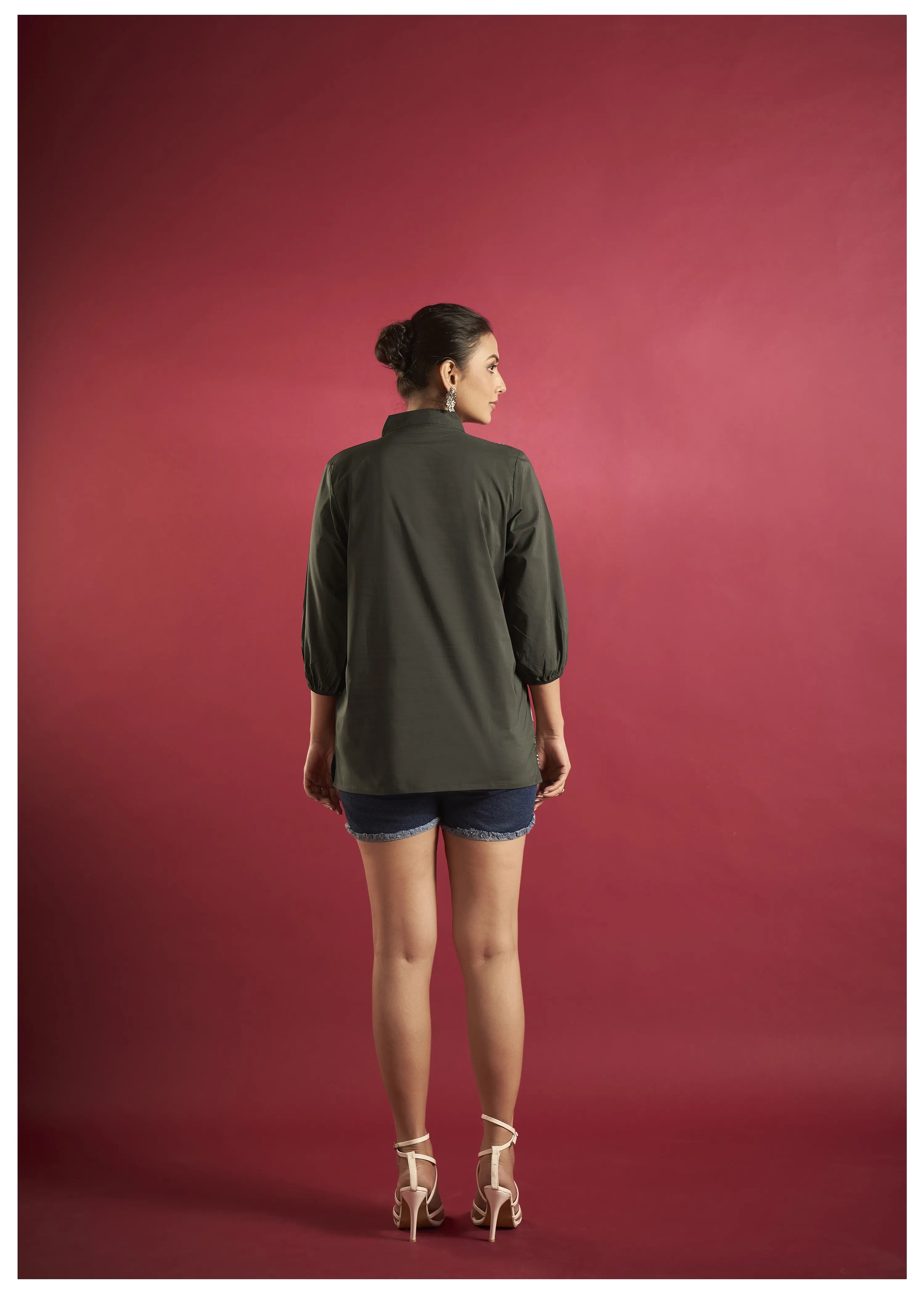 Olive Green Cotton Poplin Shirt with Cord Embroidery