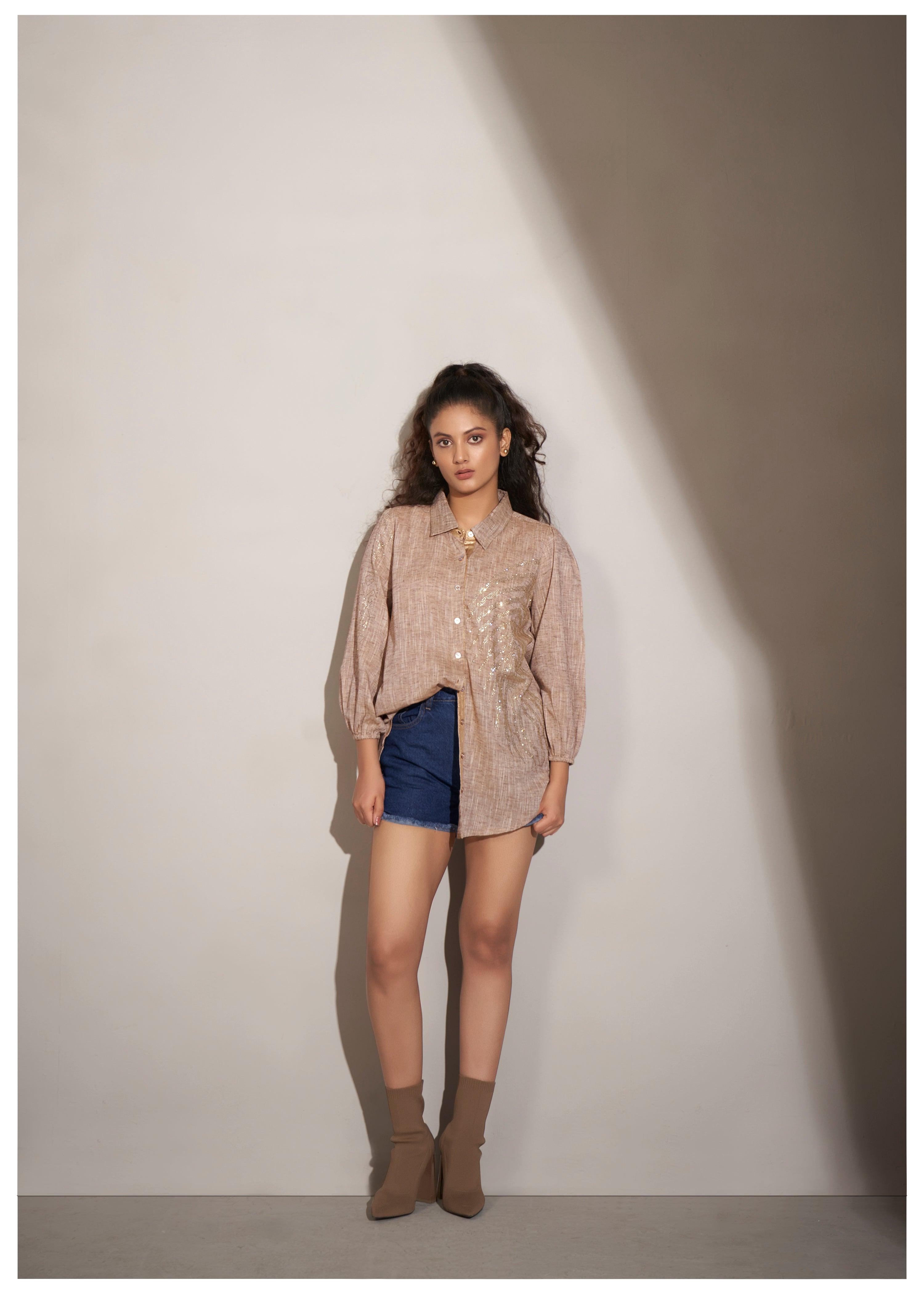 Beige Cotton Khadi Shirt with Fern Leaf Rhinestone Detailing
