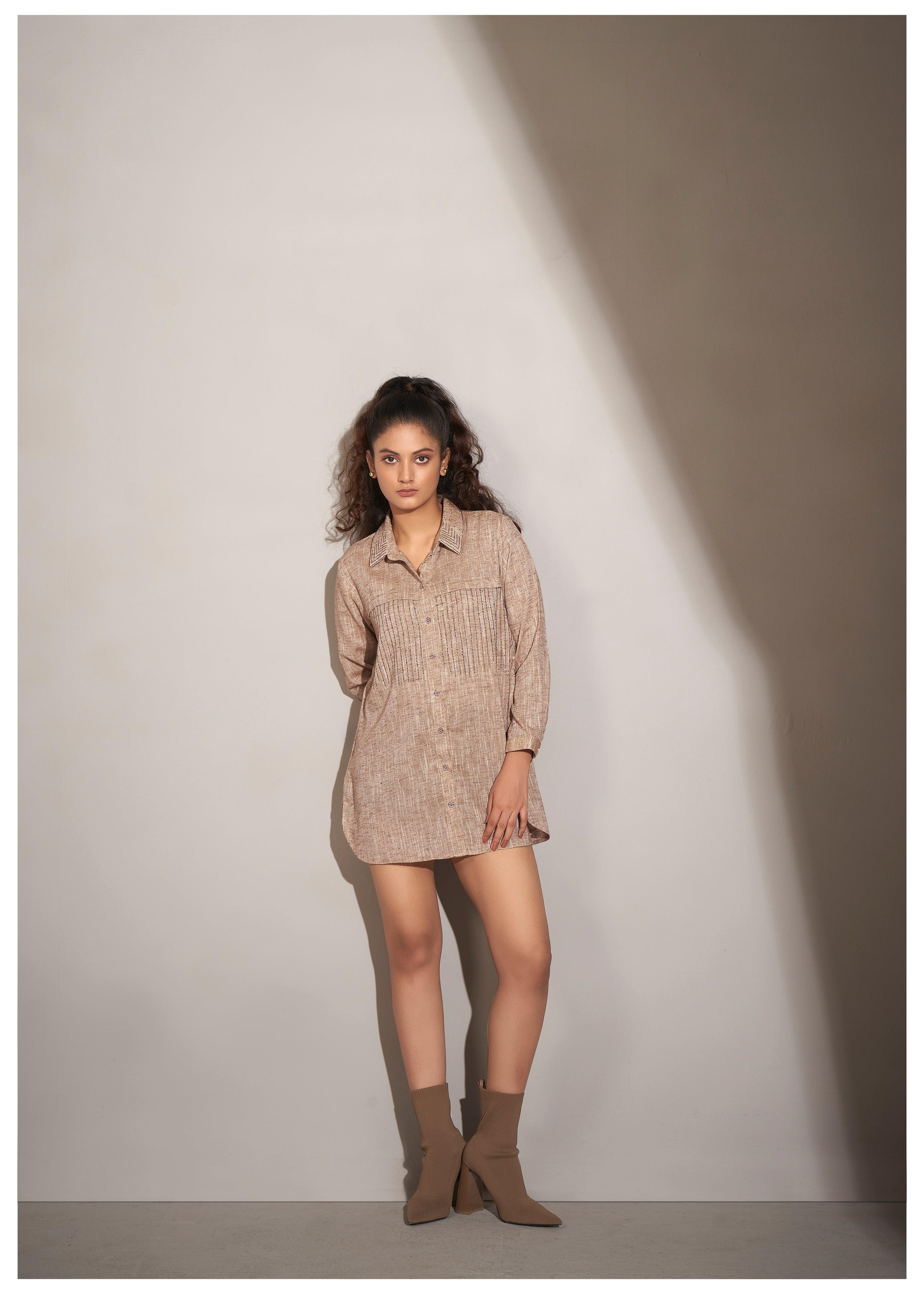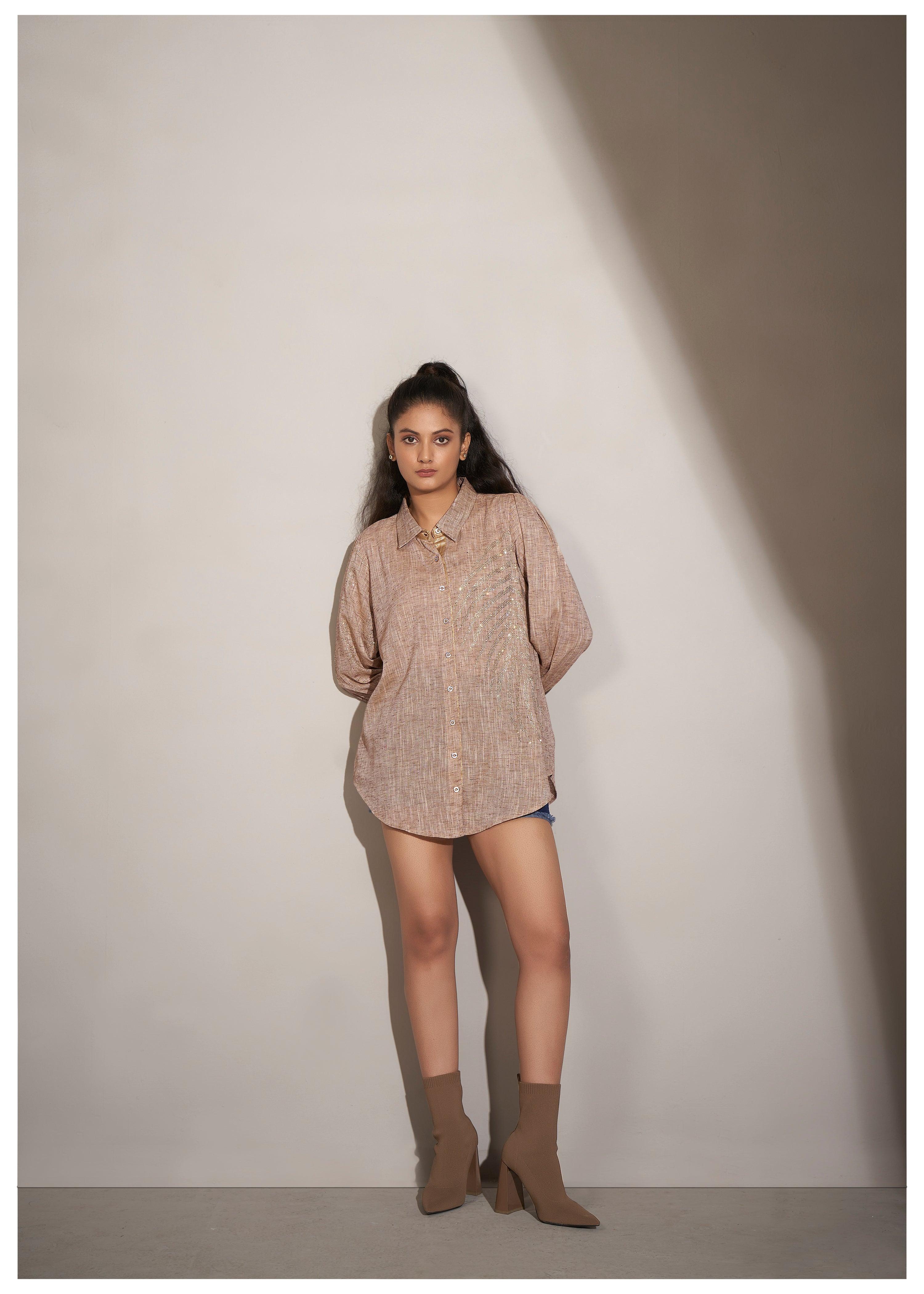 Beige Cotton-Khadi Shirt with Falling Geometric Rhinestone Work