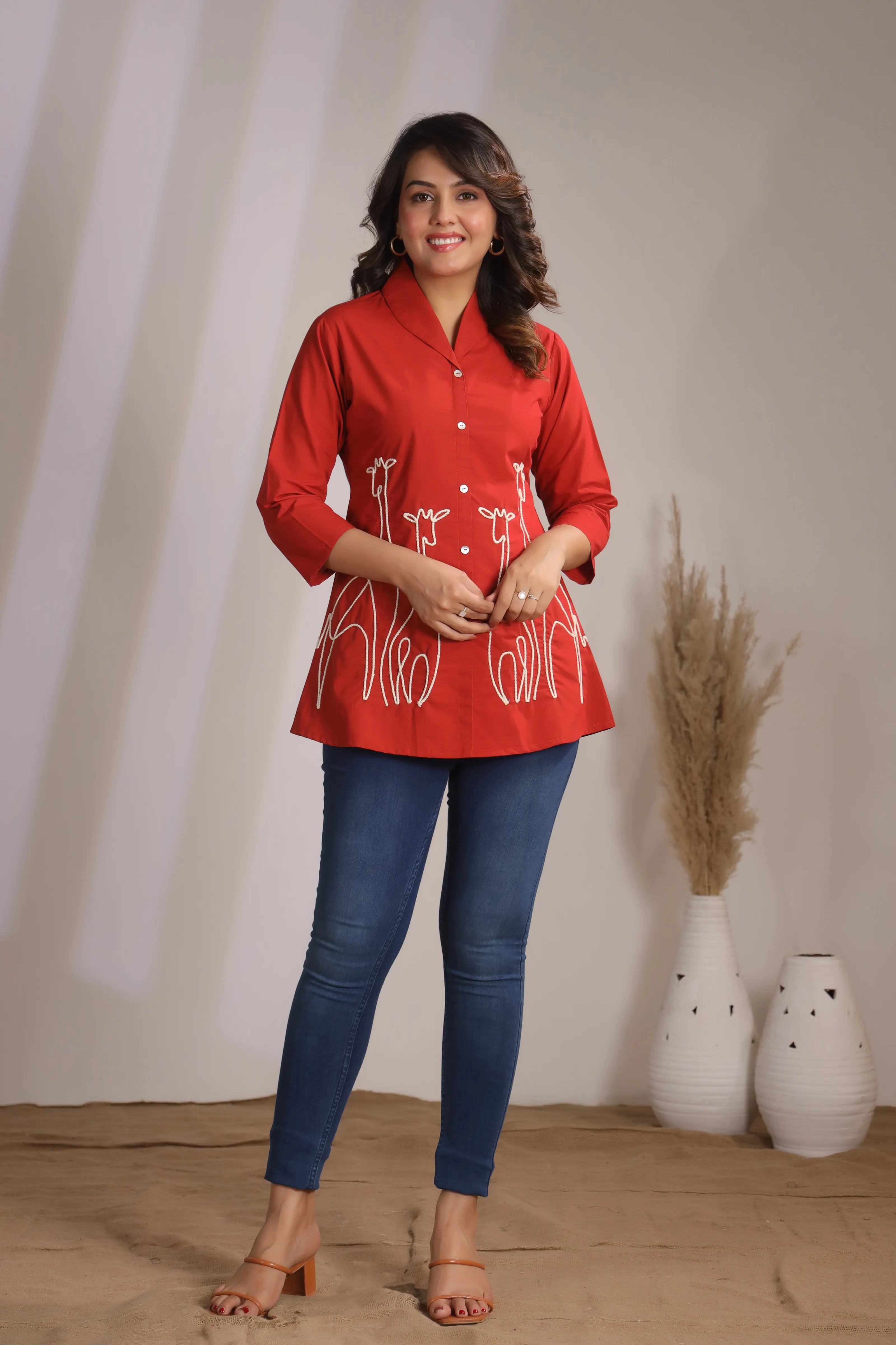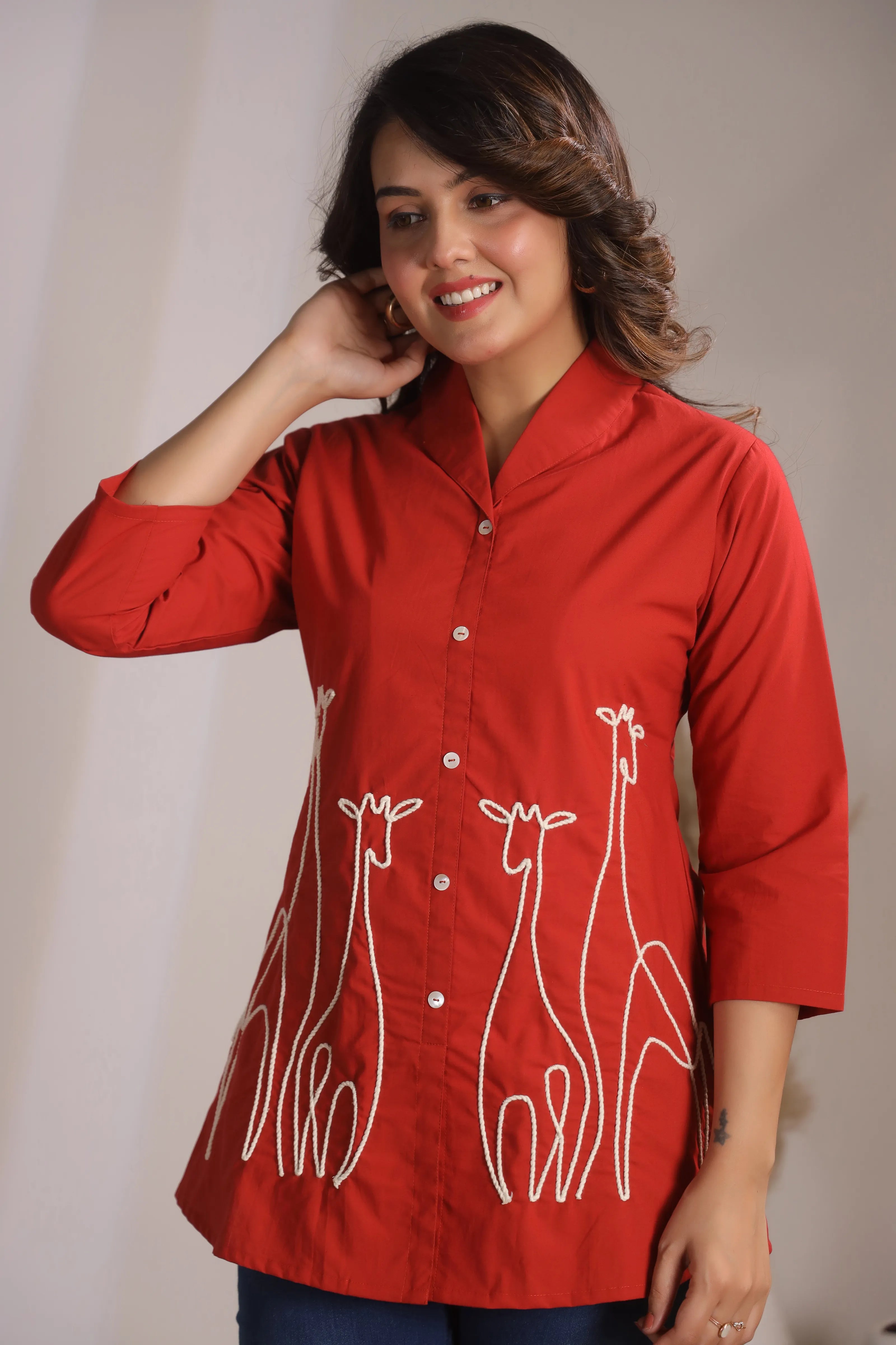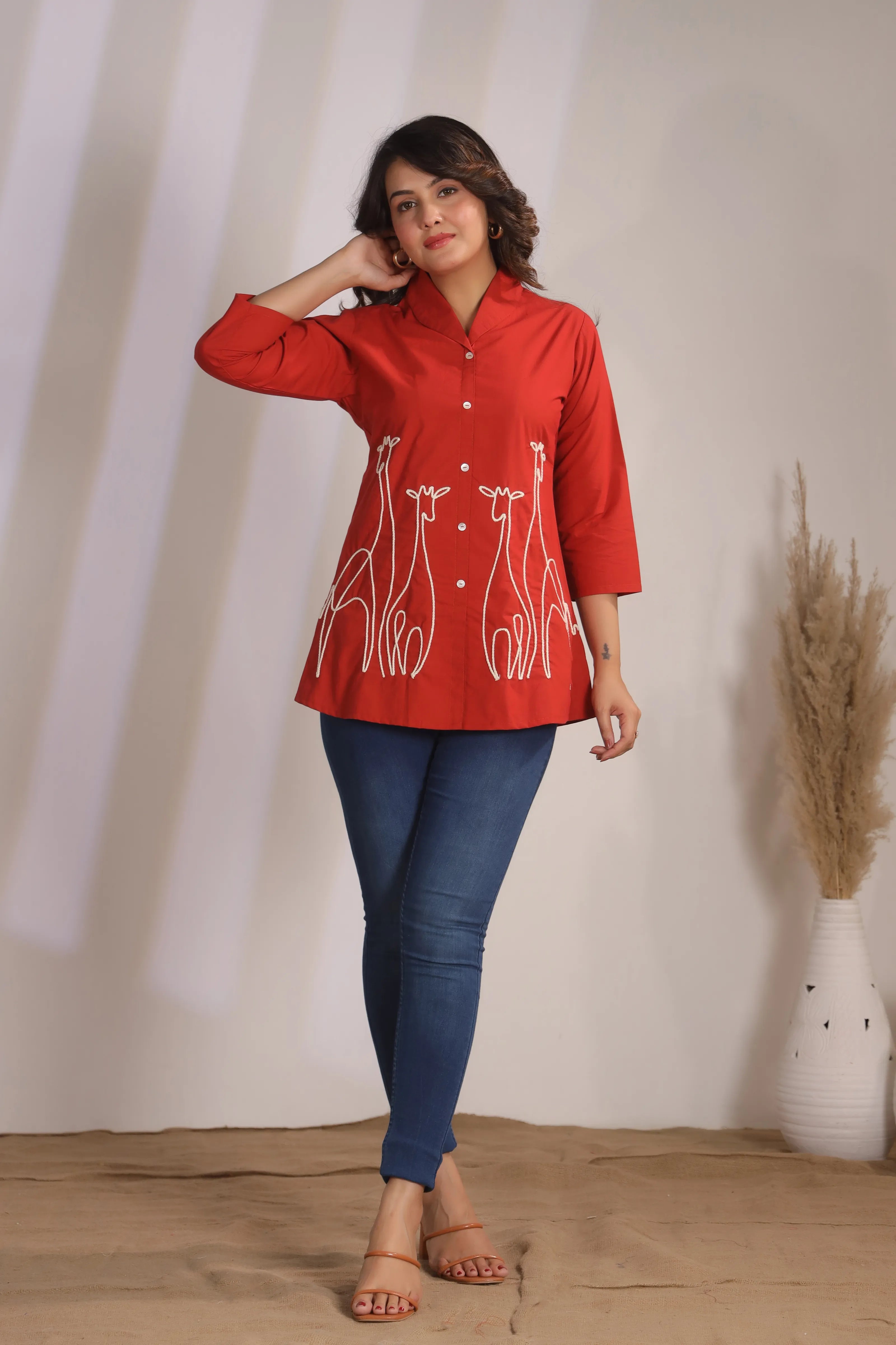 Key Features: • Fabric: Durable yet soft cotton flex • Motif: Bold ivory cord giraffe embroidery • Design Details: Lapel collar, front buttons, structured tailoring • Sleeves: 3/4th sleeves with a clean finish • Silhouette: Tunic-style A-line fit • Length: Mid-hip – easy to pair with denims or trousers