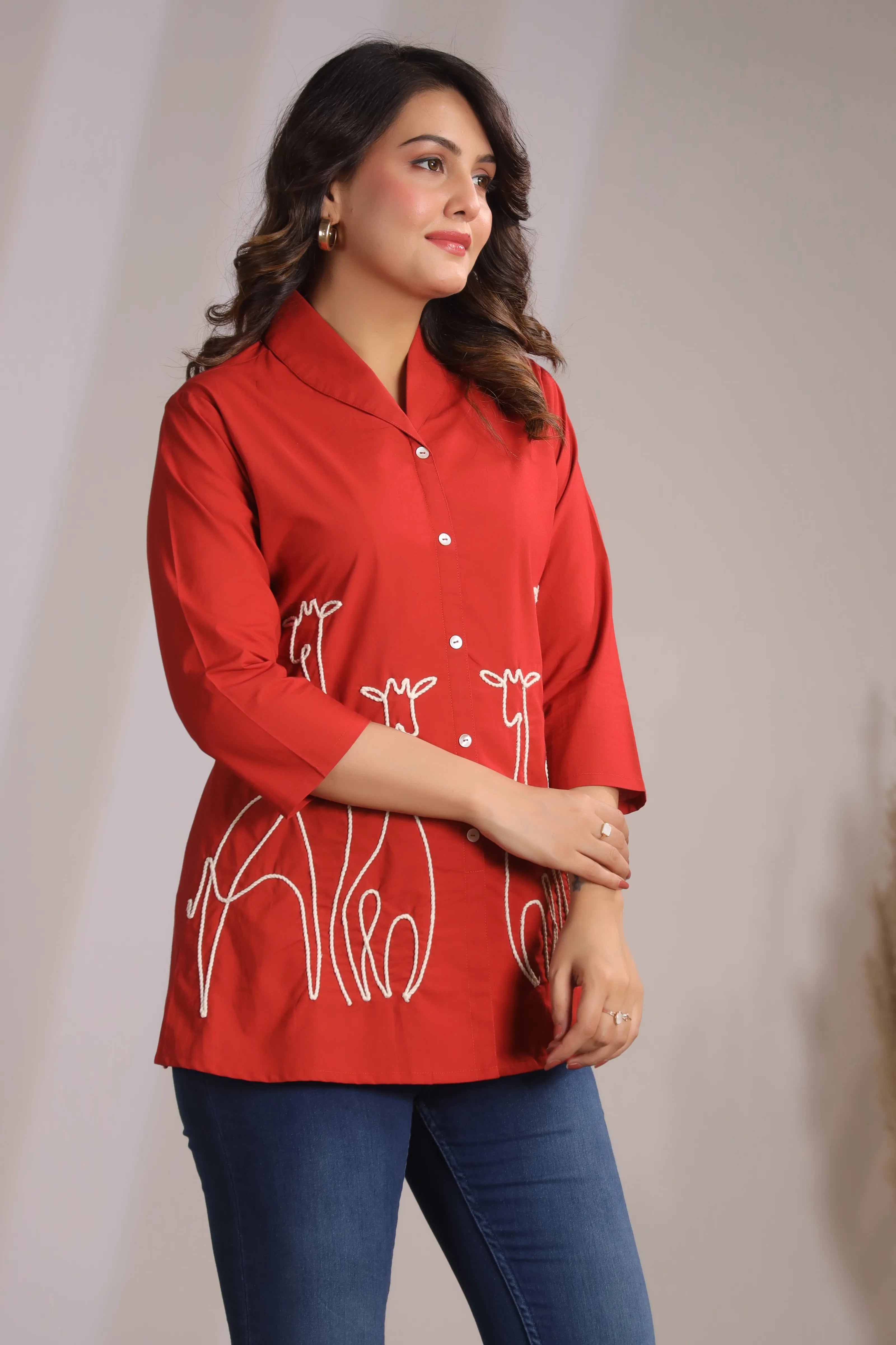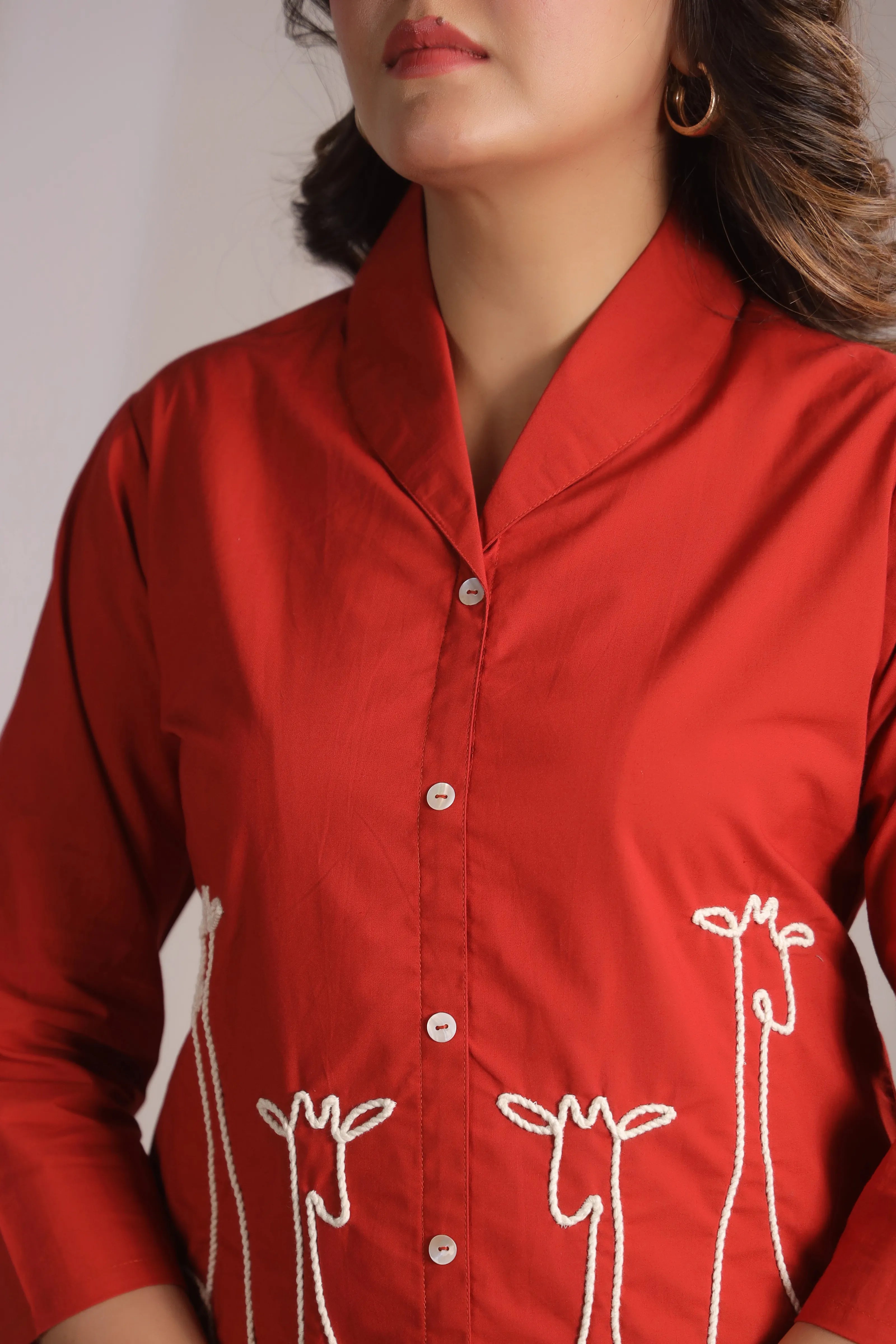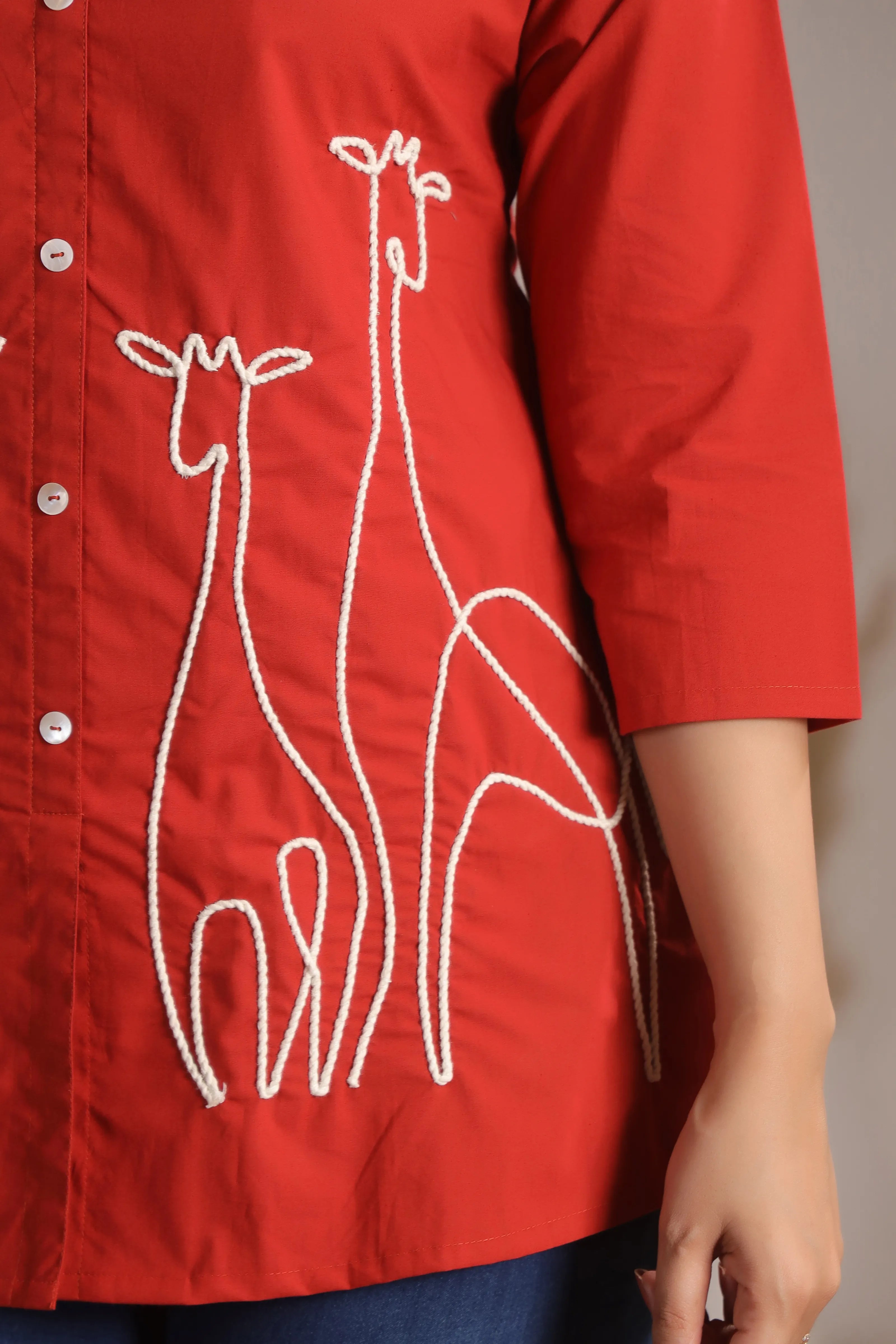 Key Features: • Fabric: Durable yet soft cotton flex • Motif: Bold ivory cord giraffe embroidery • Design Details: Lapel collar, front buttons, structured tailoring • Sleeves: 3/4th sleeves with a clean finish • Silhouette: Tunic-style A-line fit • Length: Mid-hip – easy to pair with denims or trousers