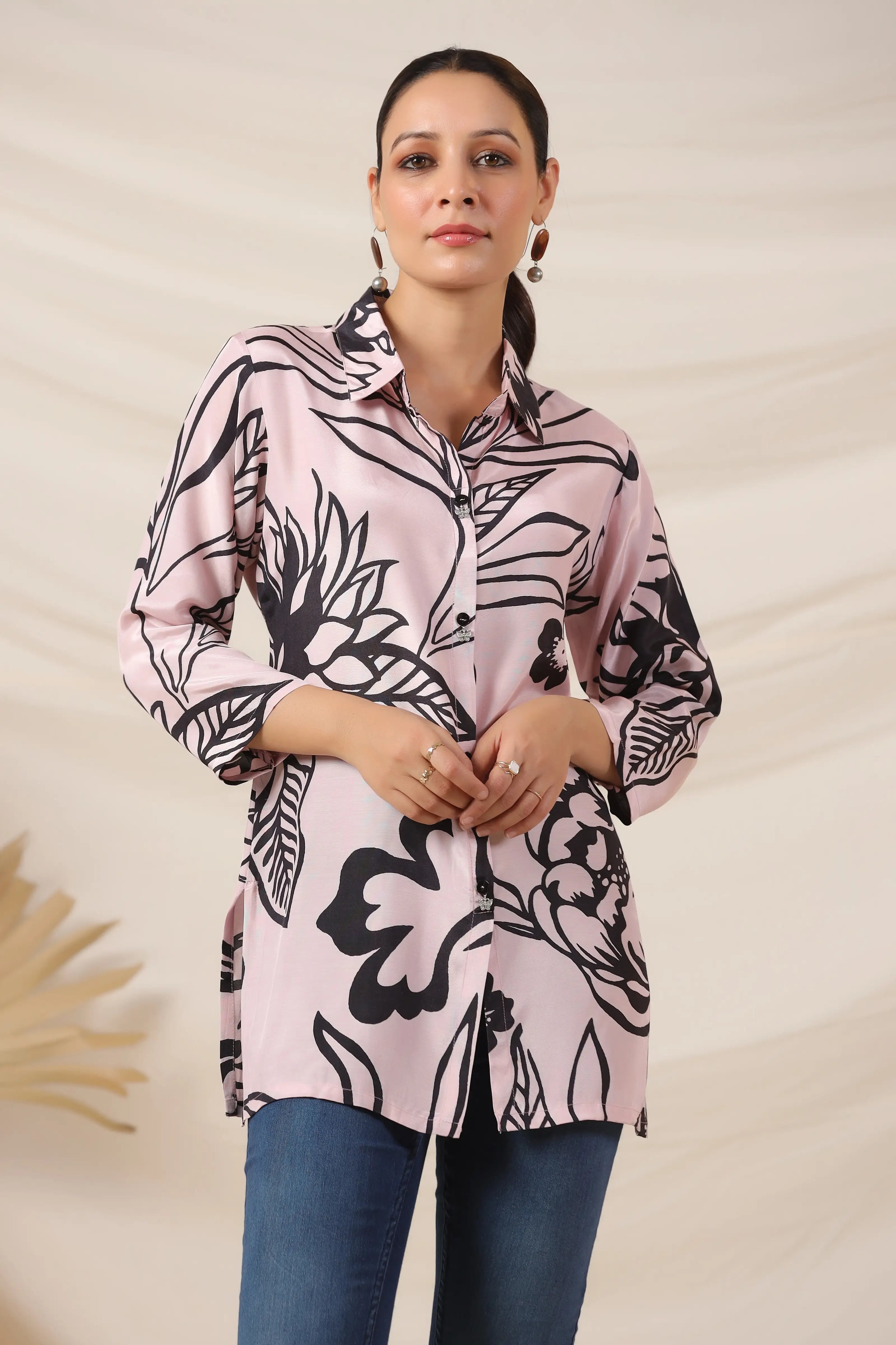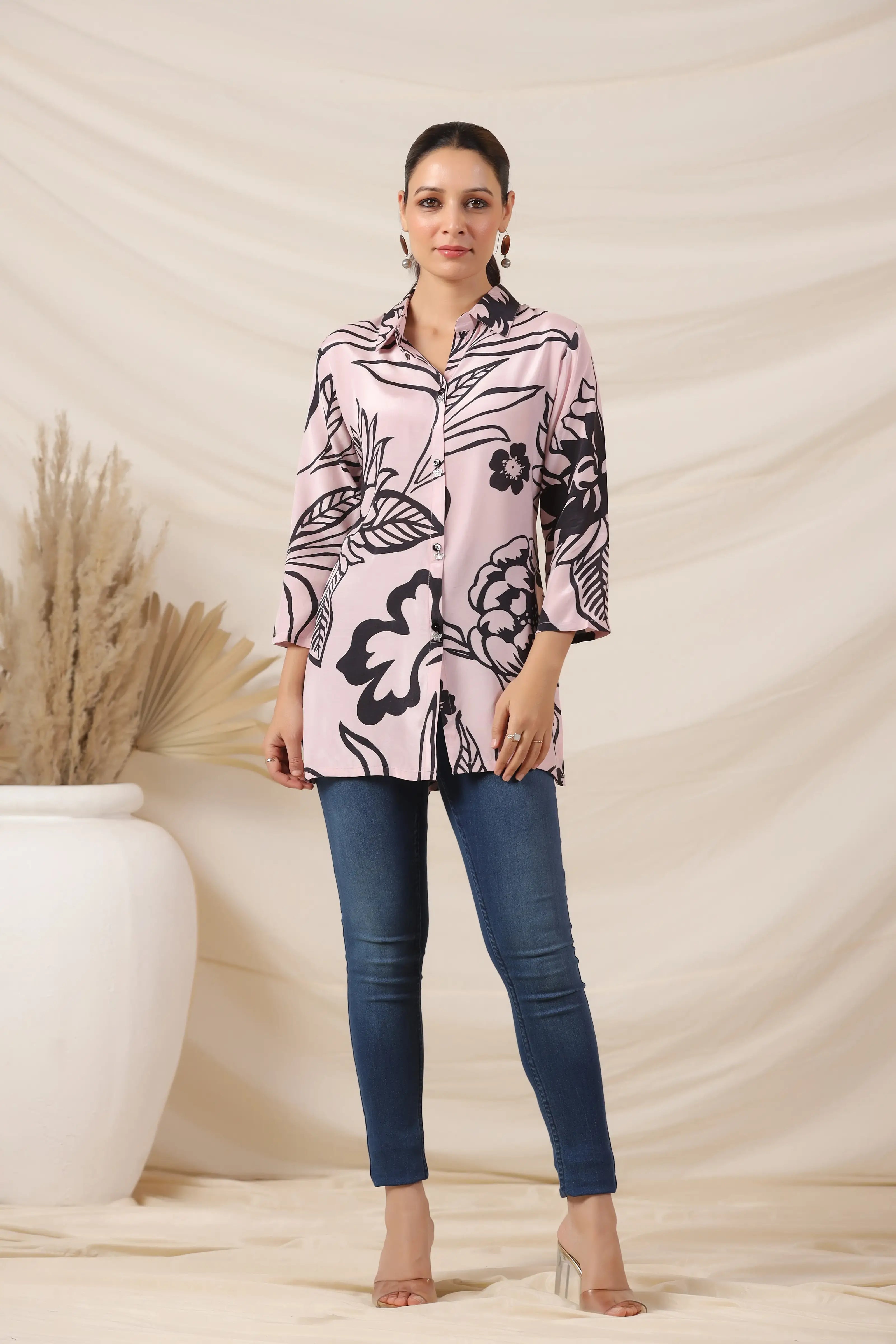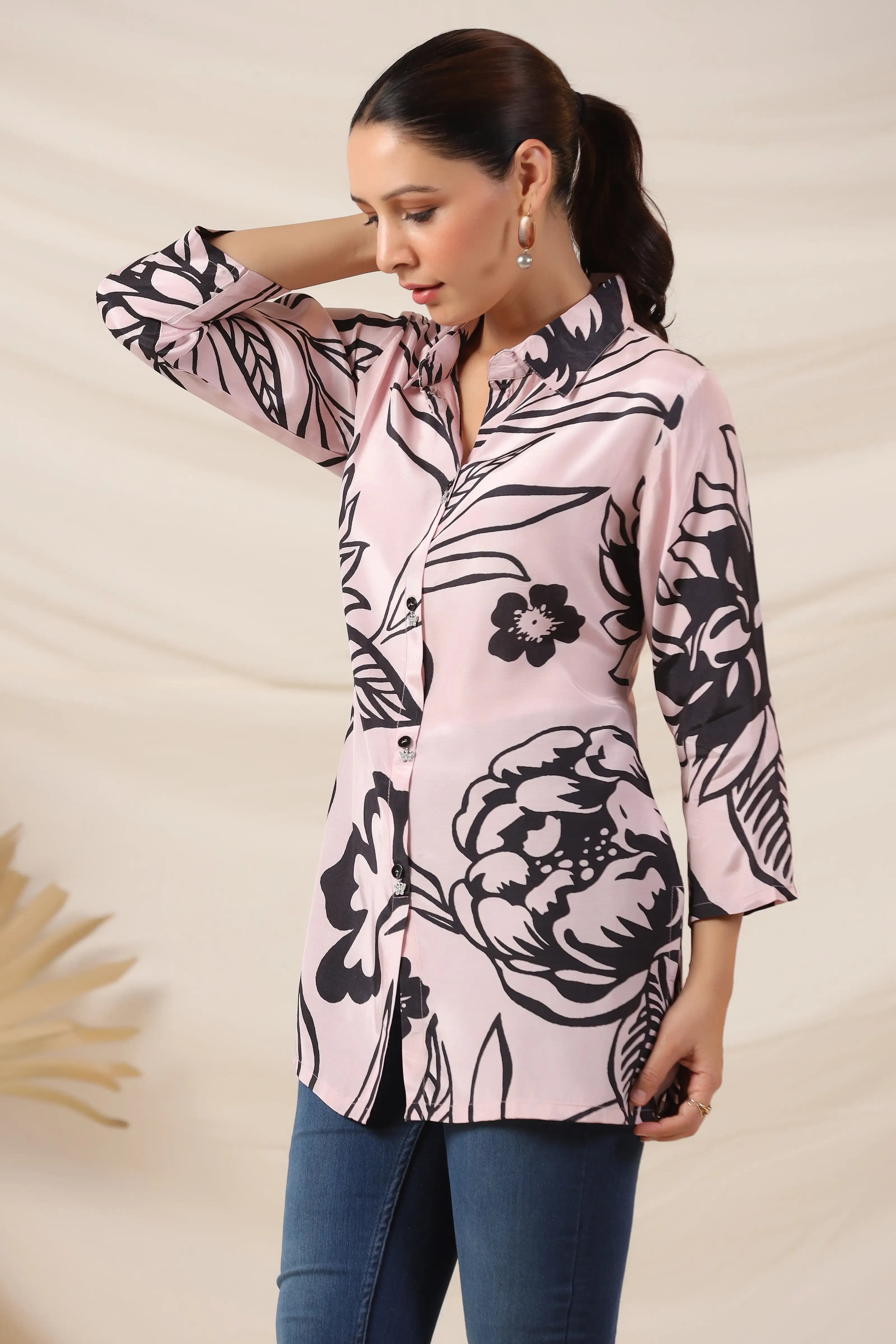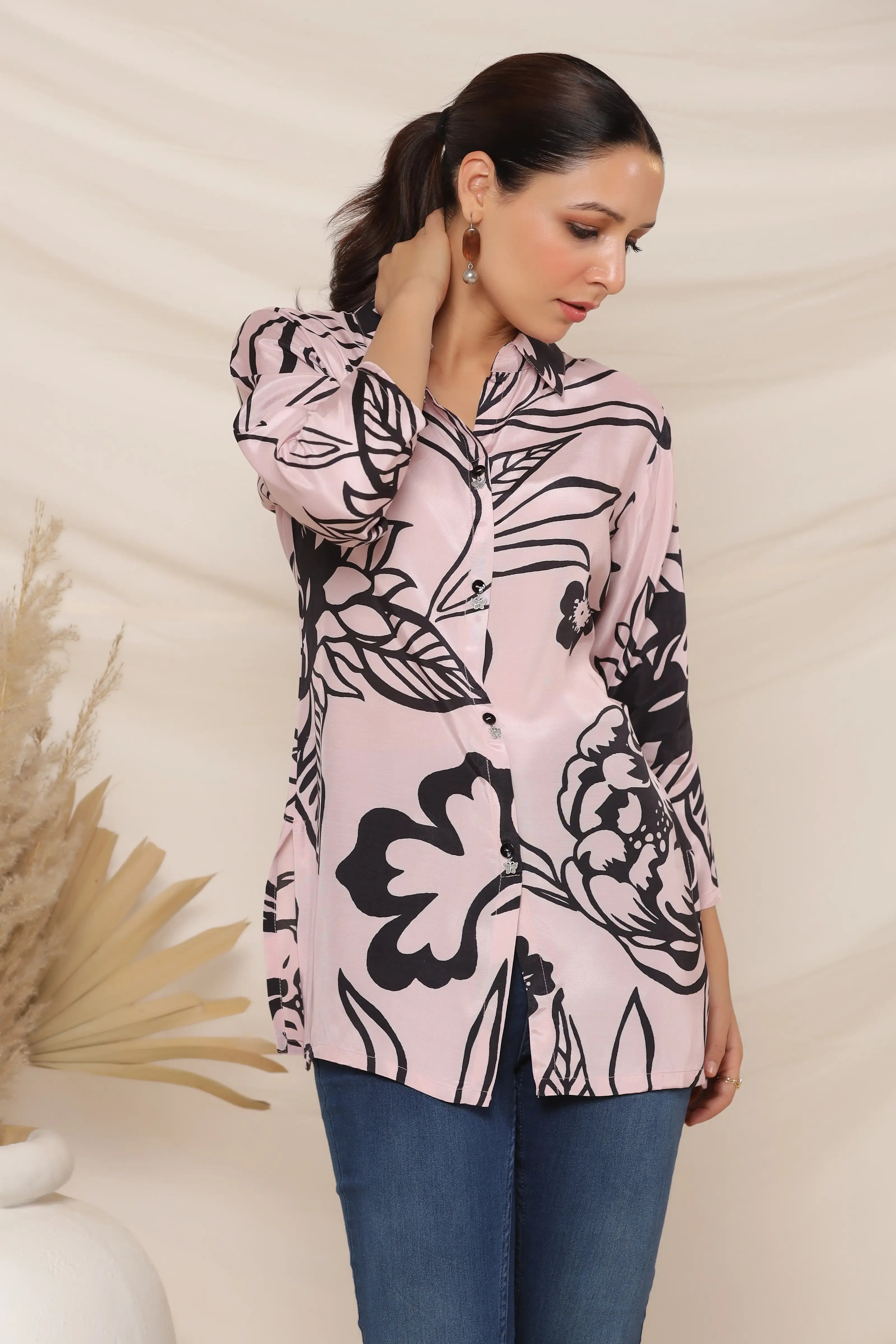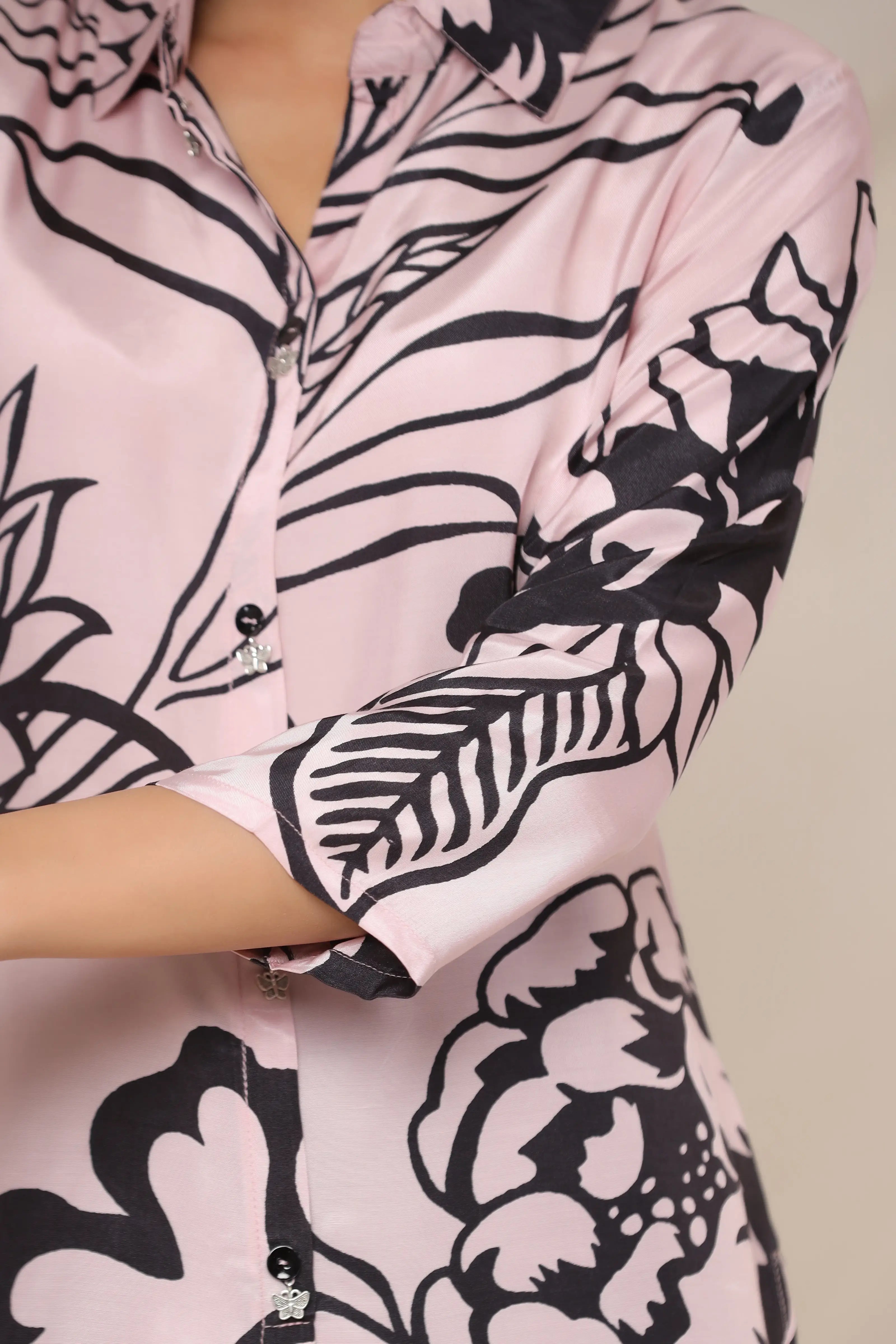 Add a touch of feminine sophistication to your wardrobe with the Baby Pink & Black Floral Printed Top, crafted from luxurious Russian silk for a soft, flowy drape. The classic shirt collar and 3/4th sleeves lend a polished look, while the delicate black floral print on a baby pink base creates a striking contrast, perfect for both casual and semi-formal occasions.