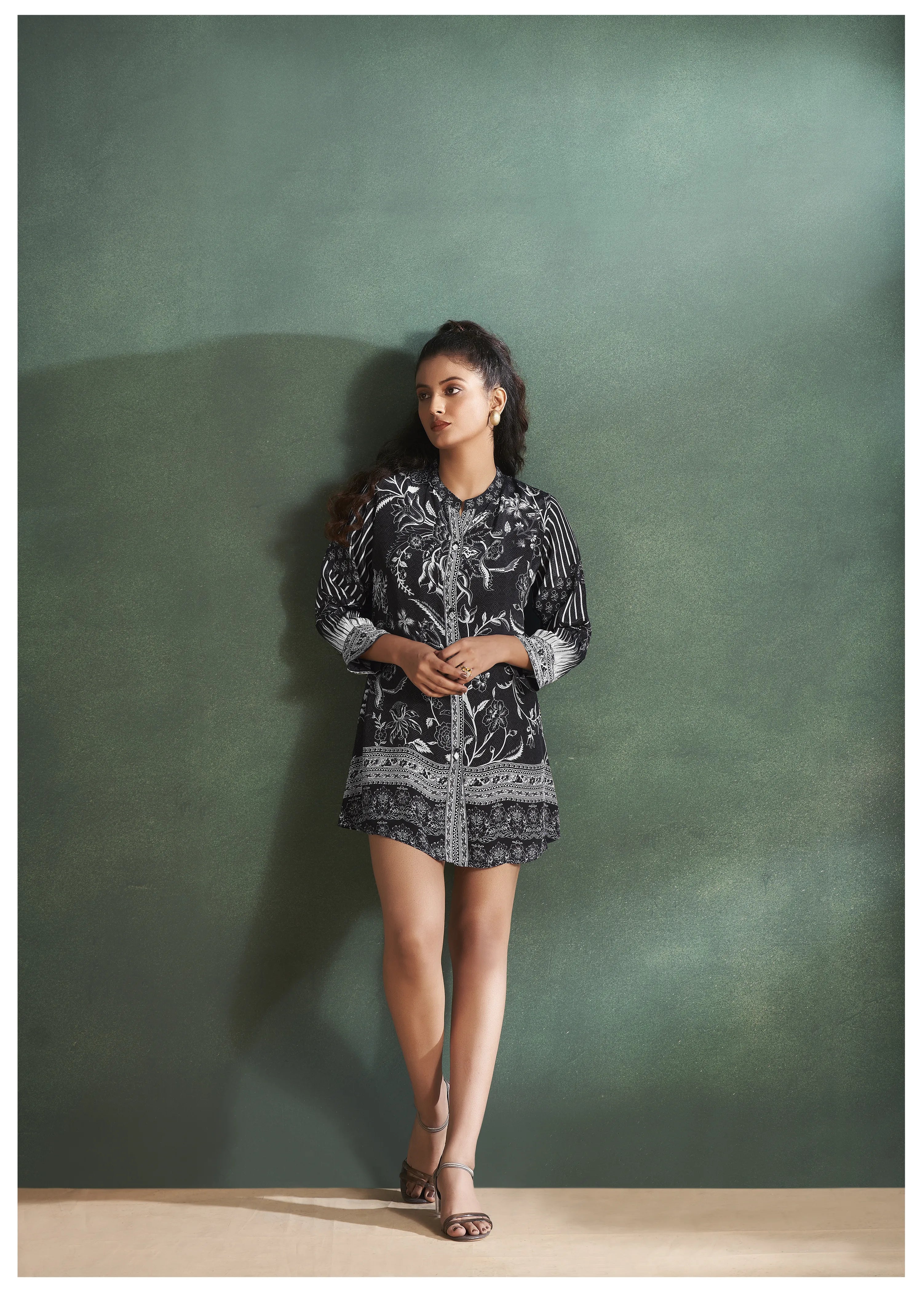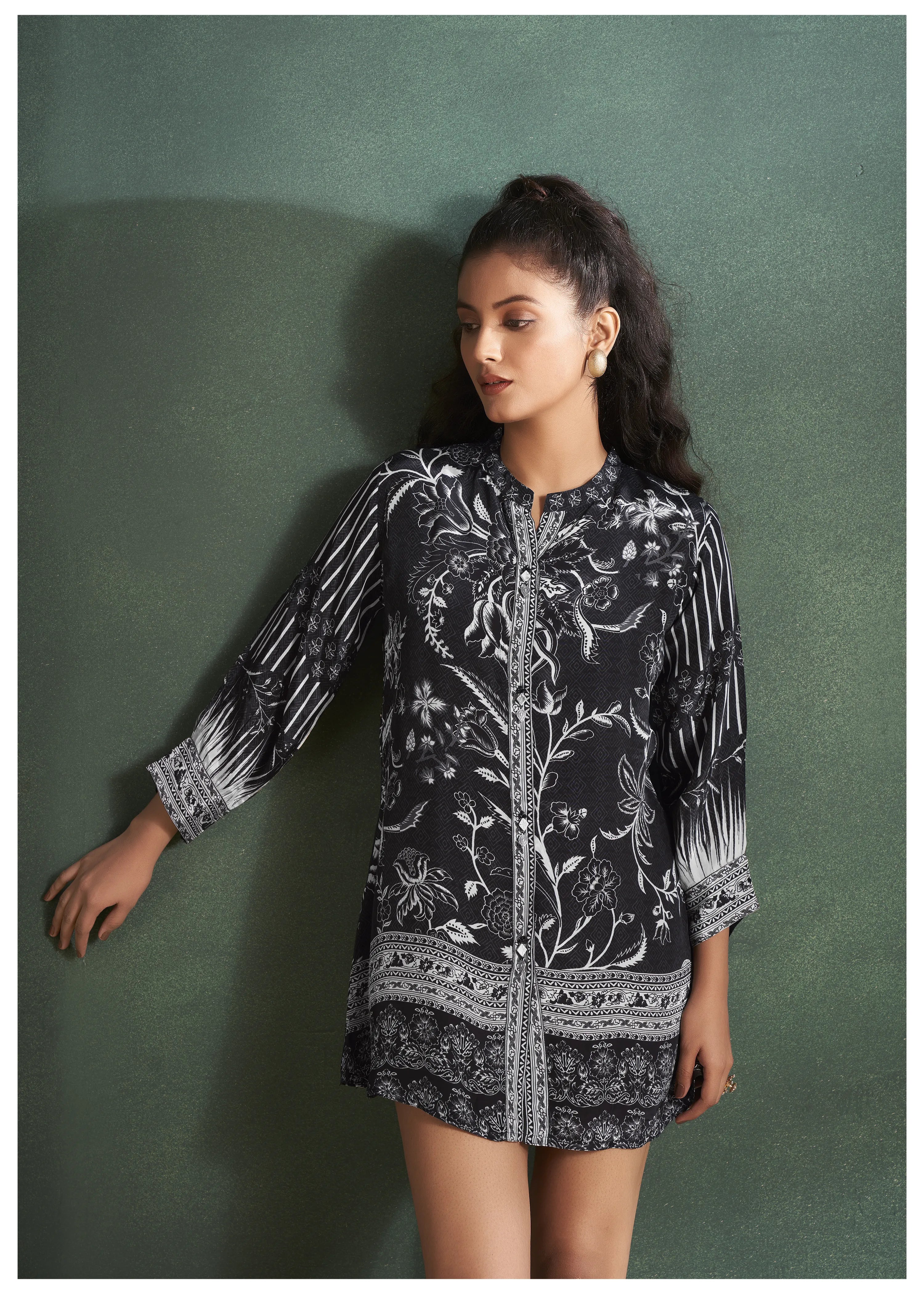 This Black Crepe Floral Printed 3/4 Sleeve Tunic is an effortlessly chic piece that combines bold floral patterns with a sophisticated silhouette. Crafted from crepe fabric, it offers a smooth, flowing fit that’s perfect for casual occasions. The mandarin collar and 3/4 sleeves with cuffs enhance the tunic’s contemporary charm, while the button closure adds a functional touch.