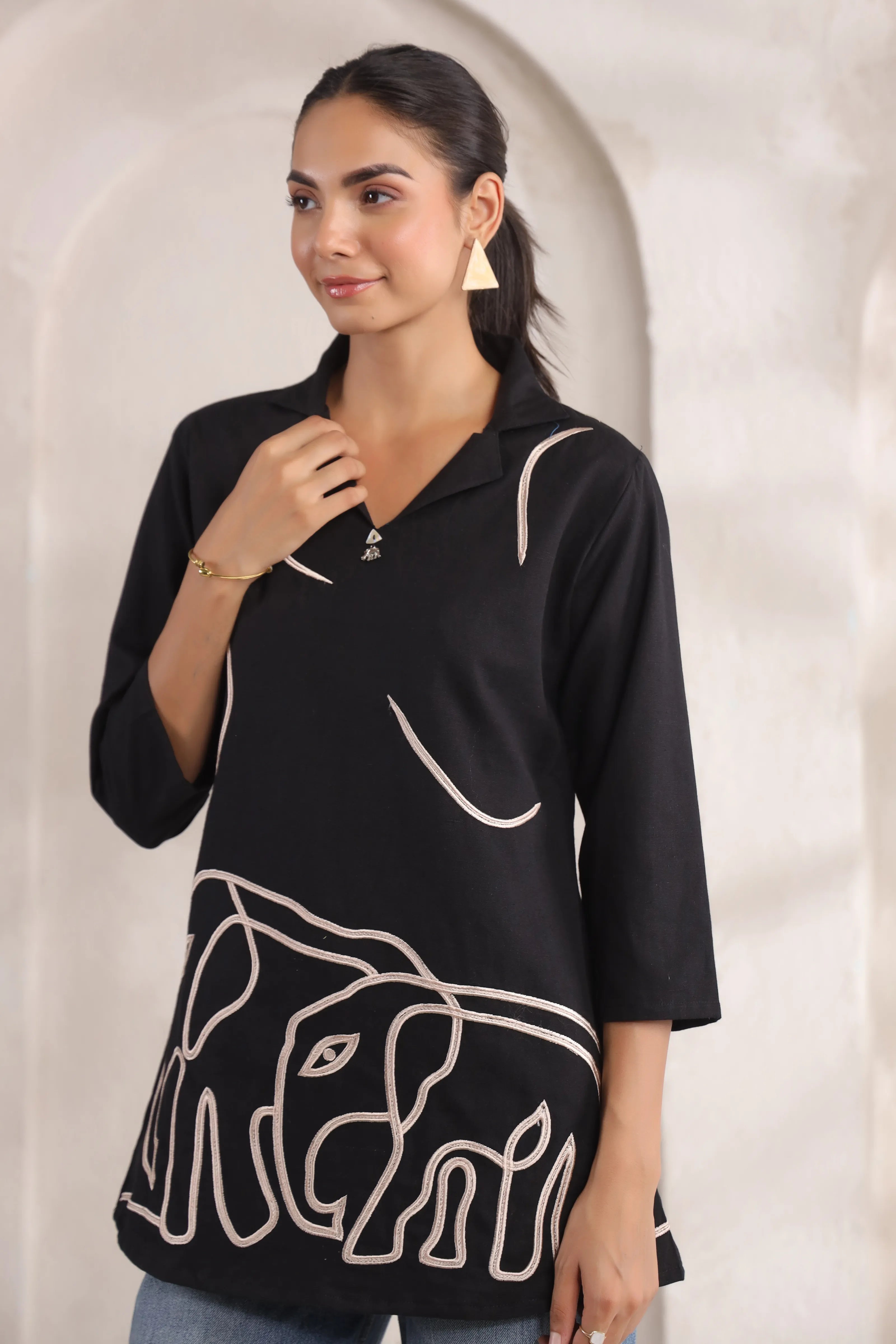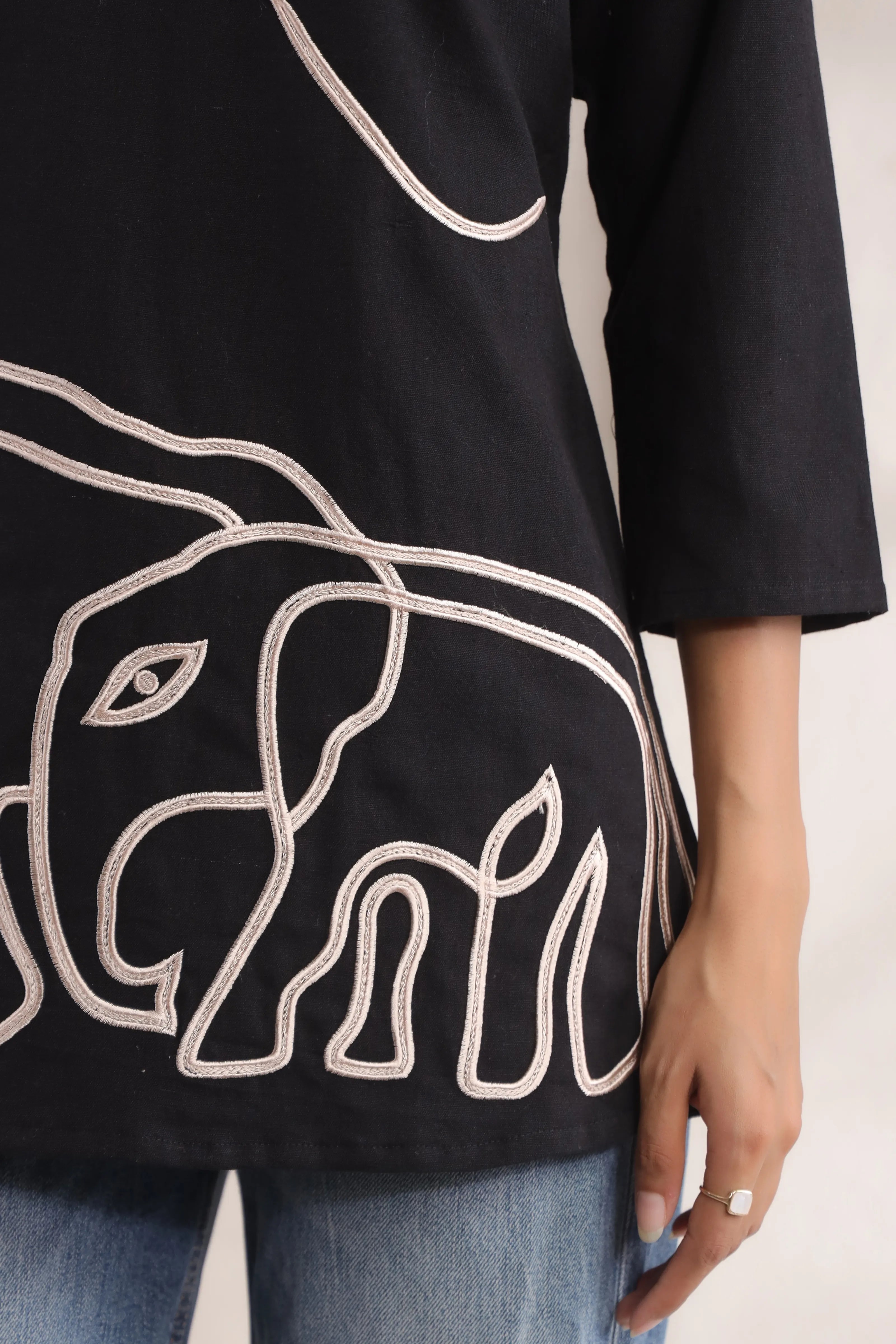 Key Features: • Fabric: Cotton flex – breathable and structured for daily wear • Color: Solid black with contrast cream embroidery • Motif: Elephant-themed cord embroidery with abstract detailing • Neckline: Shirt collar with a V-slit front • Sleeves: 3/4th length for ease and movement