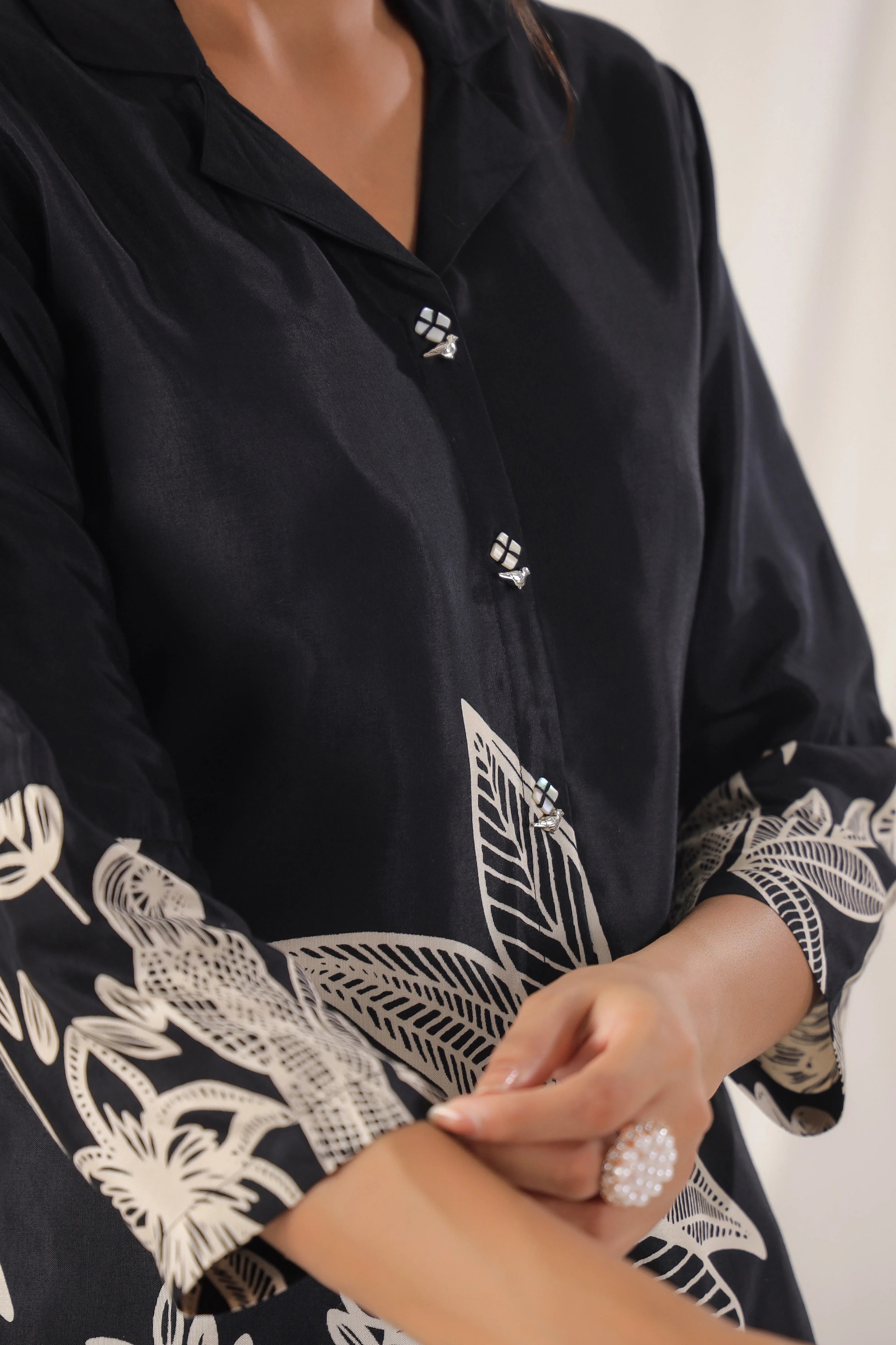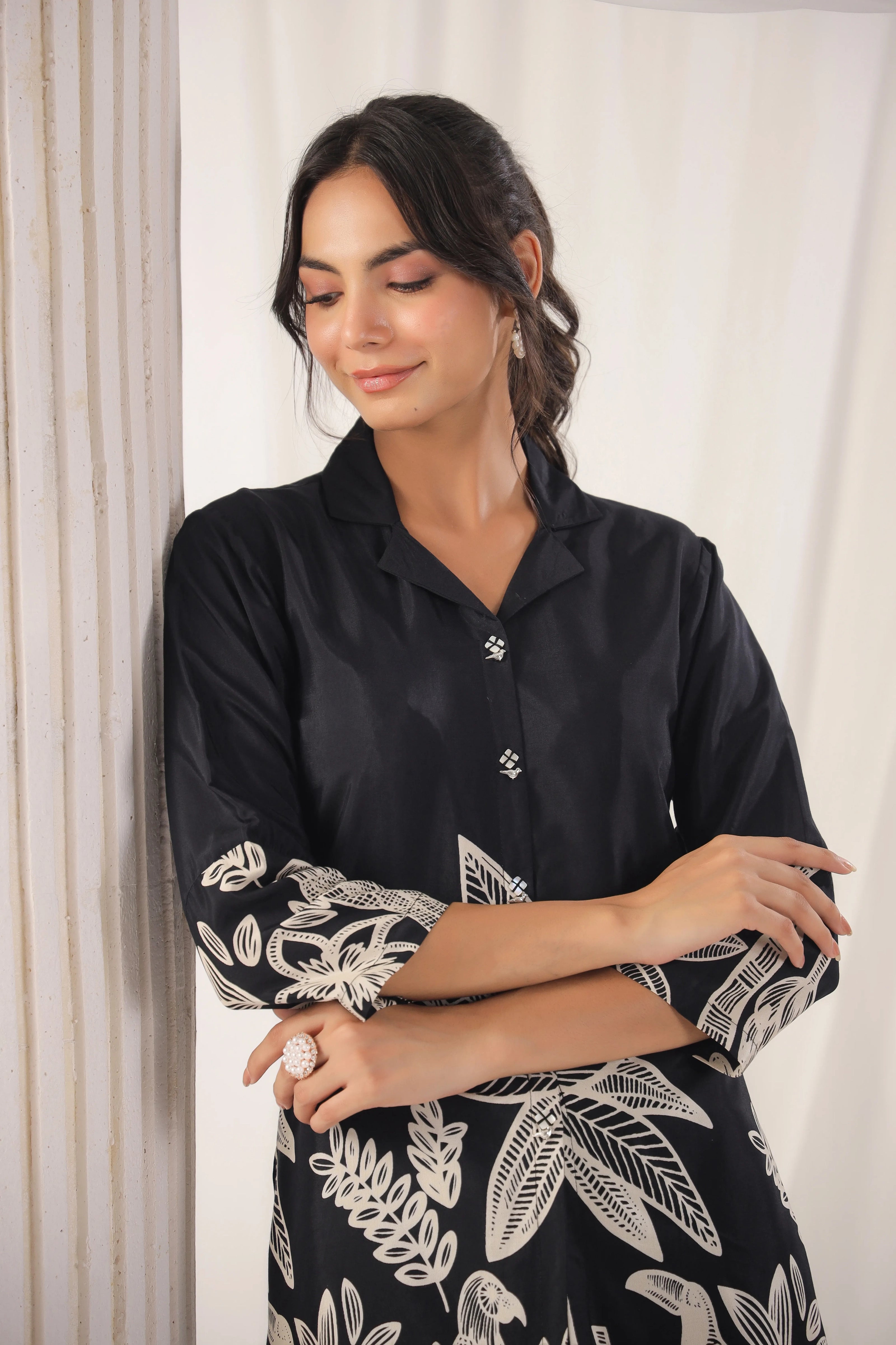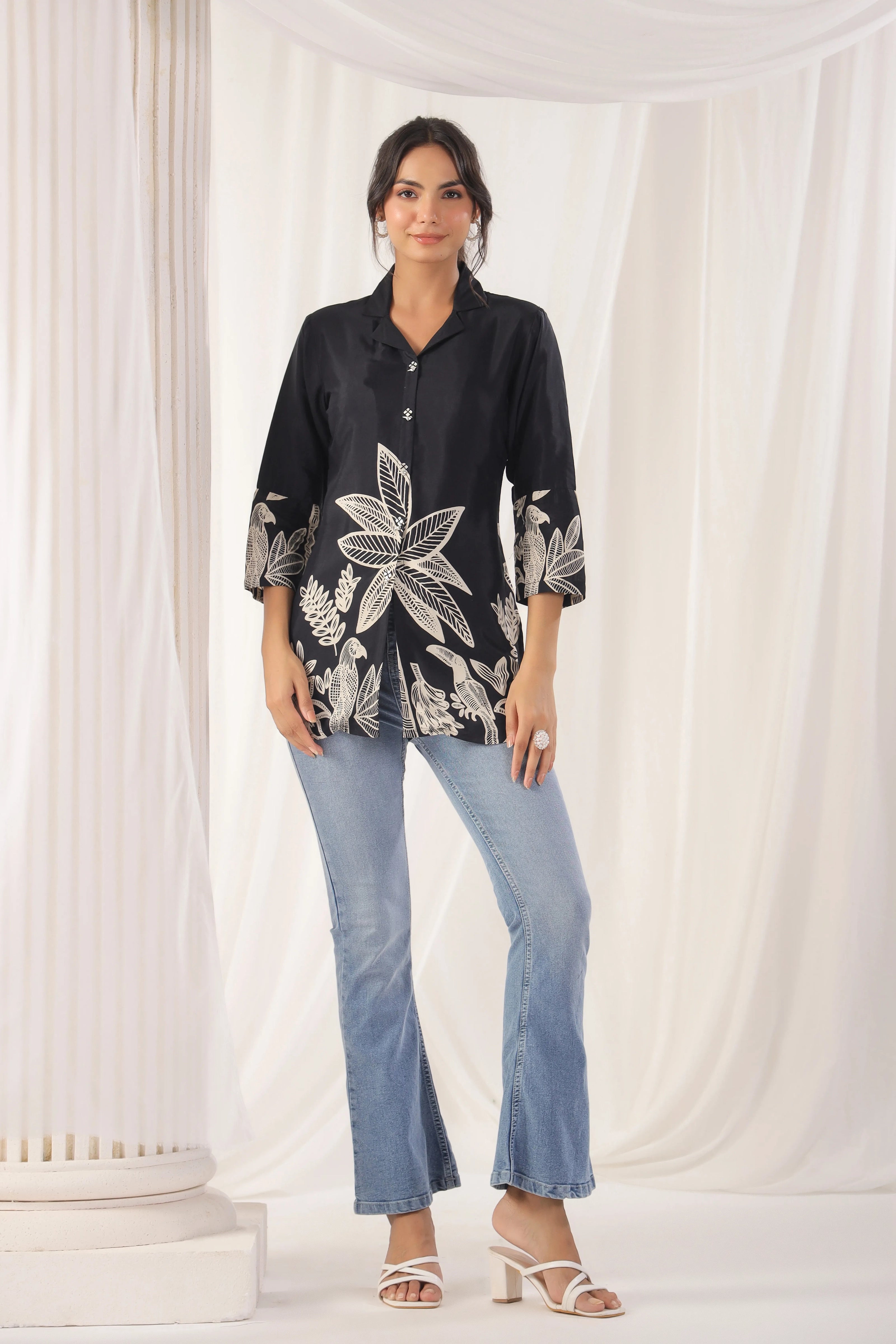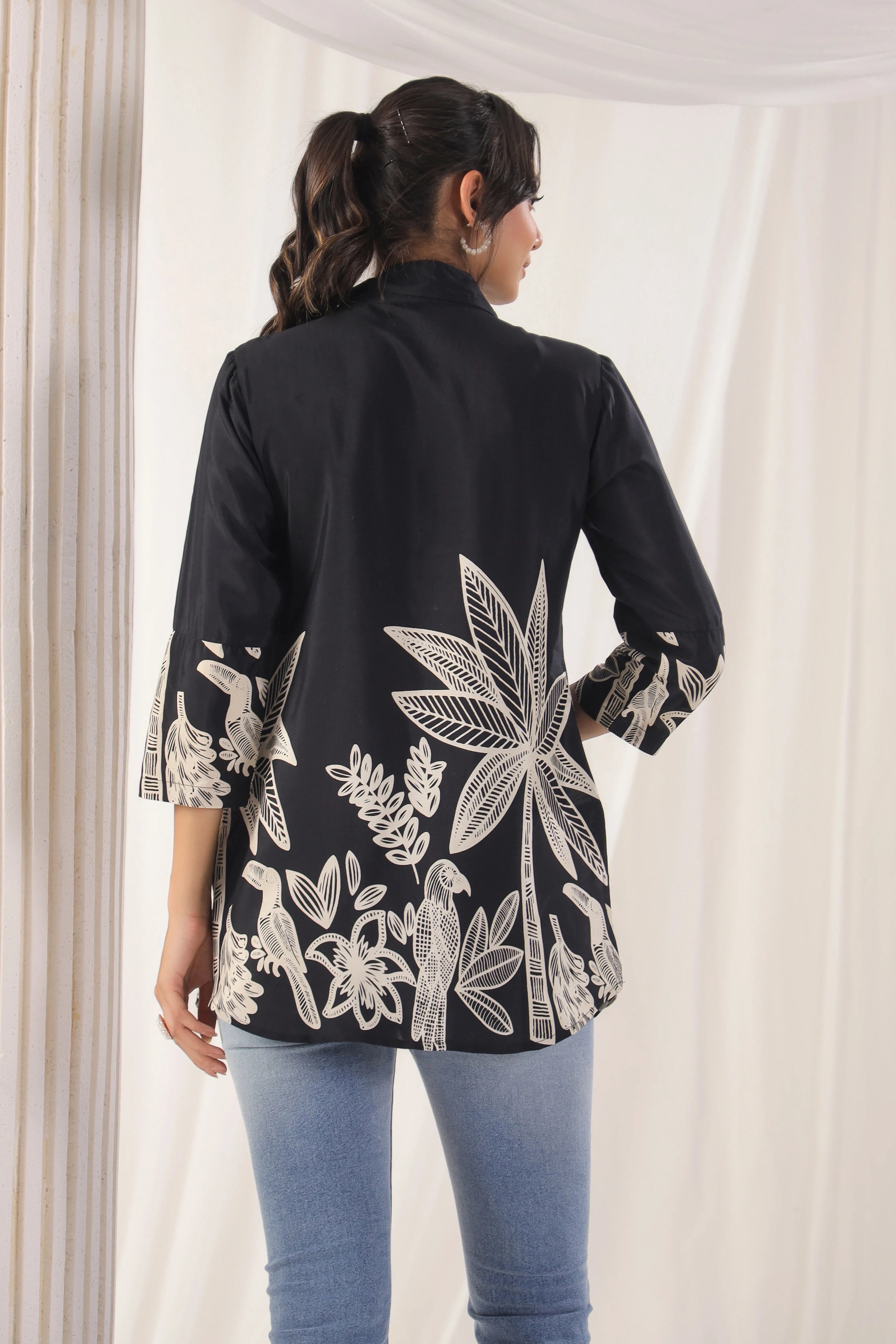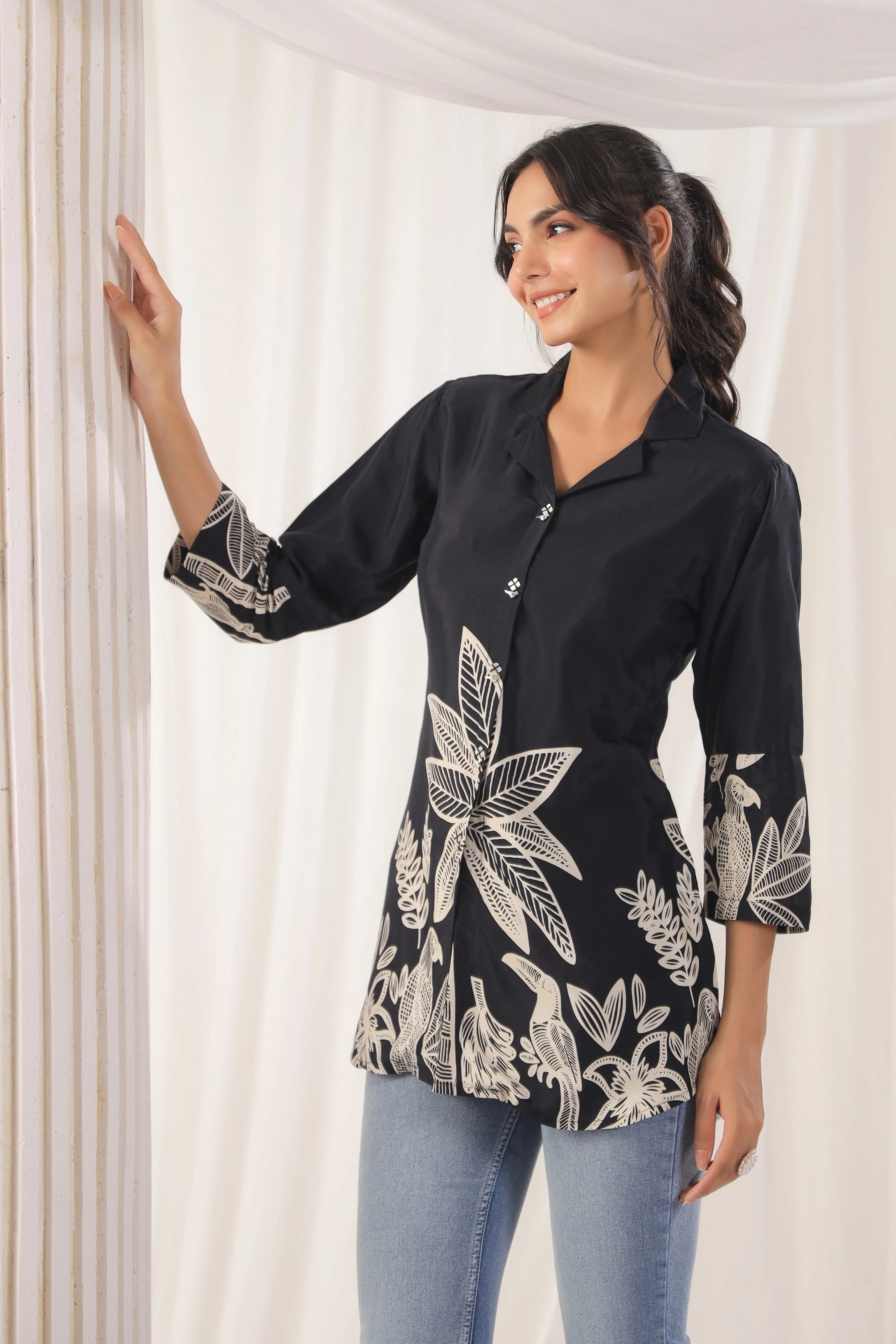 This Black Floral Print Russian Silk Tunic exudes effortless elegance, featuring a beautiful floral block print that adds a touch of timeless charm. The tunic is designed with a lapel collar and adorned with shell embellishments on the faux front placket, giving it a refined look. The ruched 3/4th sleeves and regular fit curved hem ensure a flattering silhouette, perfect for casual to semi-formal occasions.