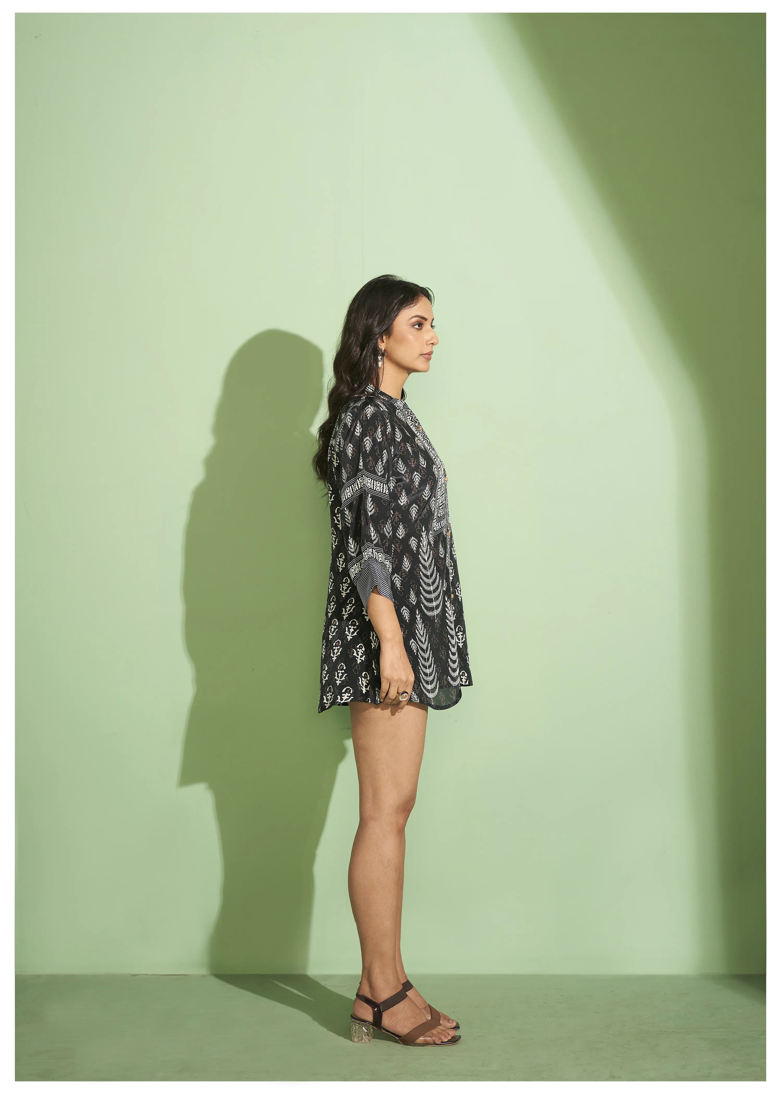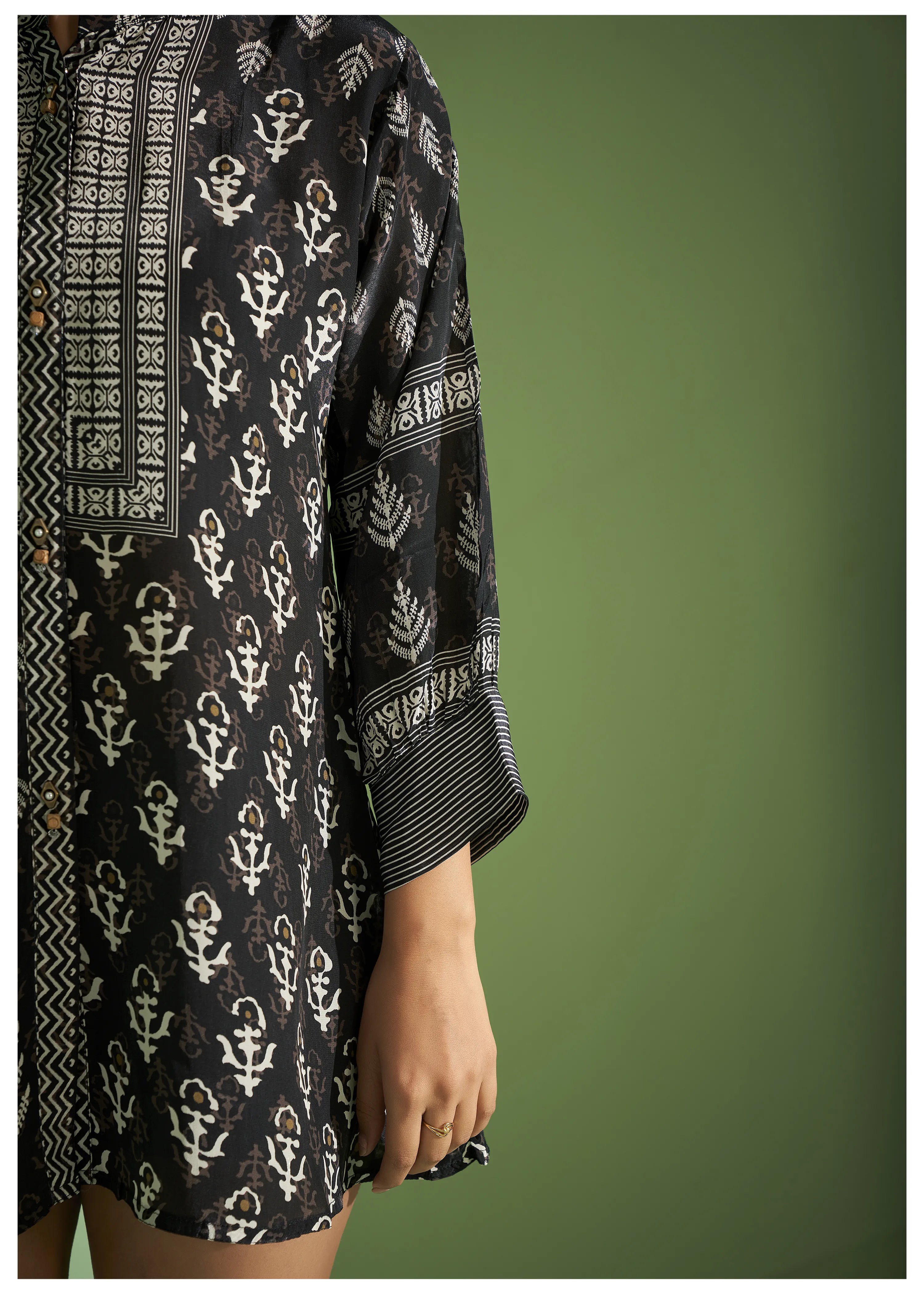 - Details: Mandarin Collar, Button Closure with Border Print, Three-Fourth Cuff Sleeves