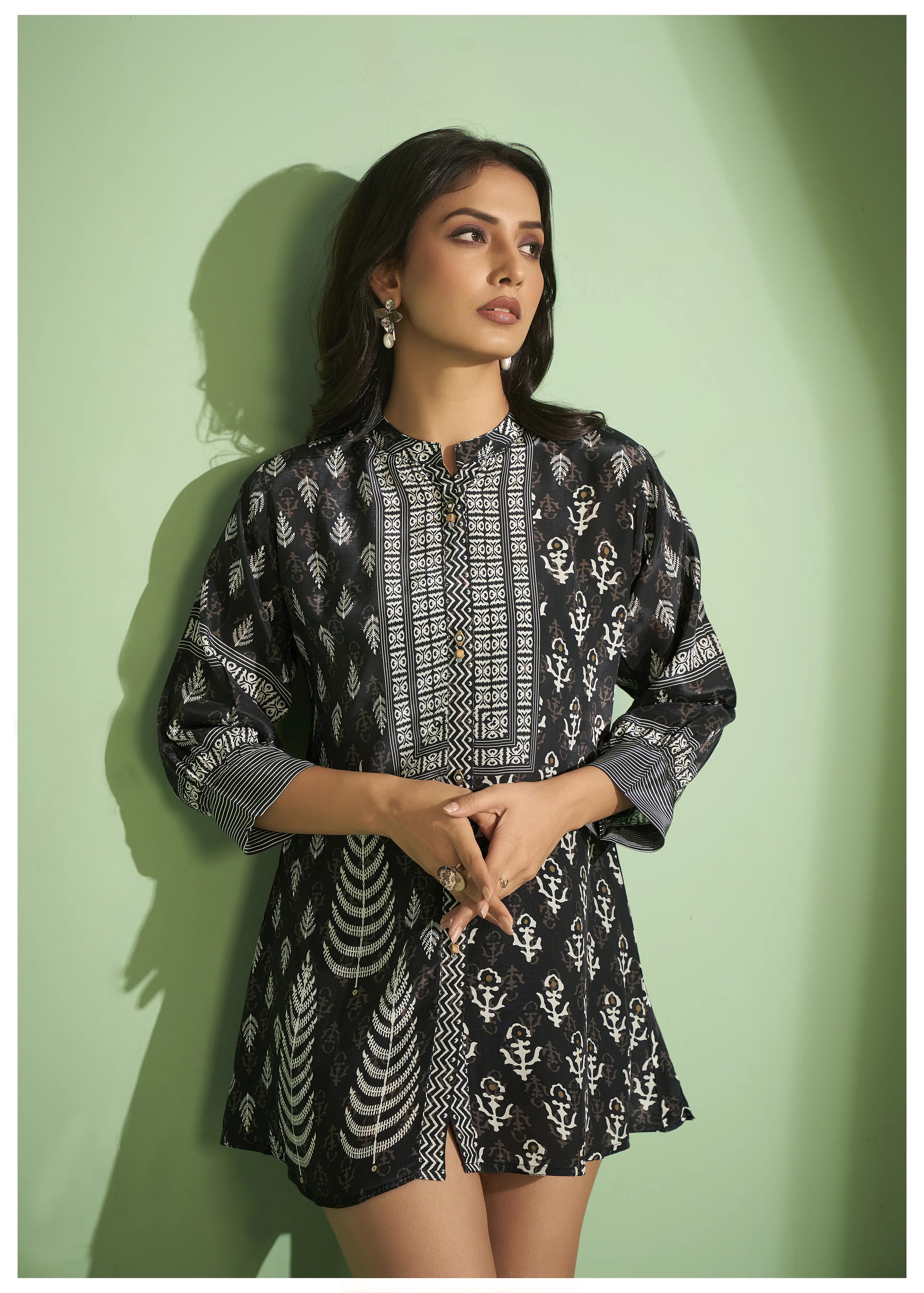 The tunic features a mandarin collar and three-fourth cuff sleeves for a bold yet feminine touch, while the button closure with a border print adds a refined detail. Perfect for workdays, brunches, or casual outings, this tunic seamlessly blends style and practicality.