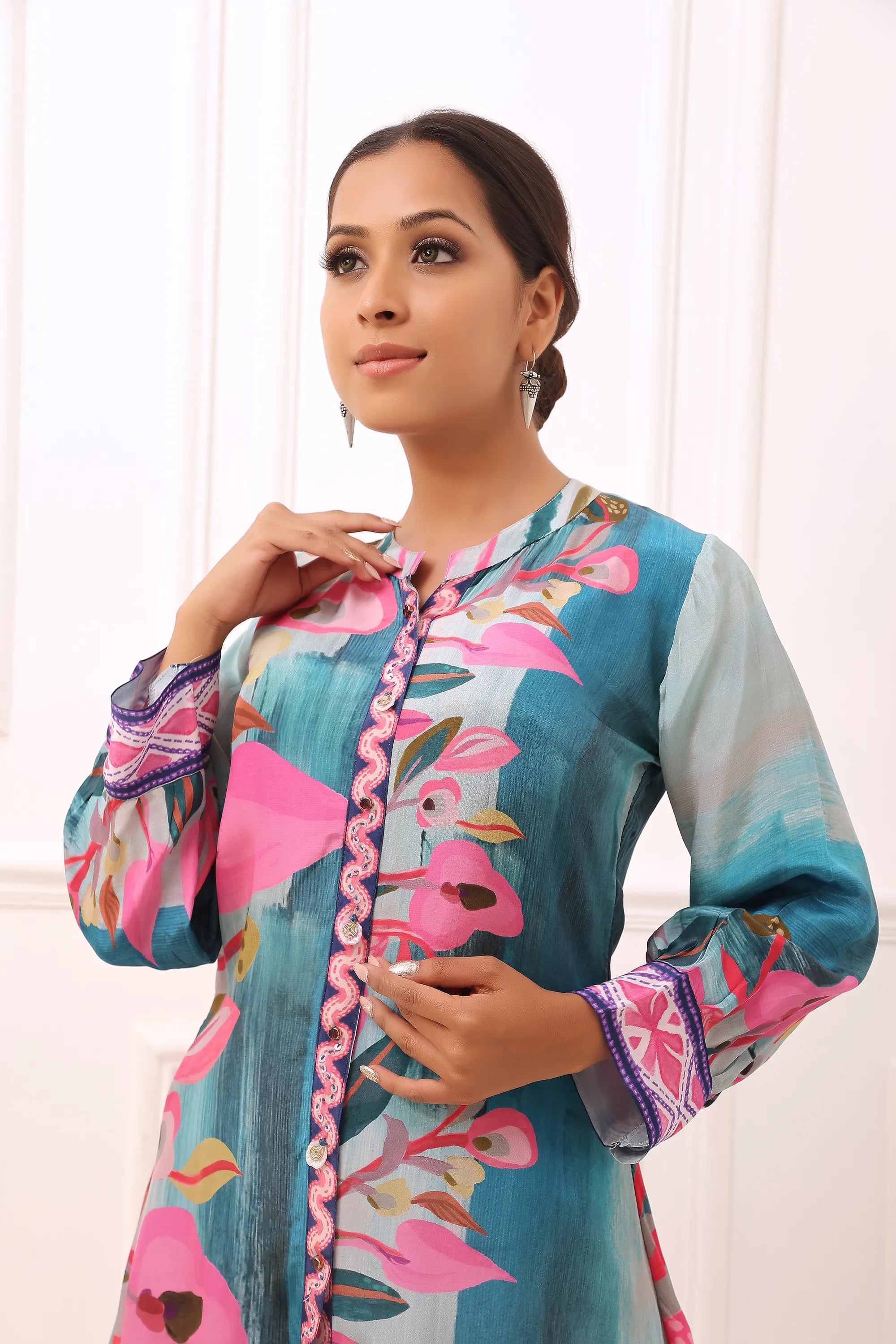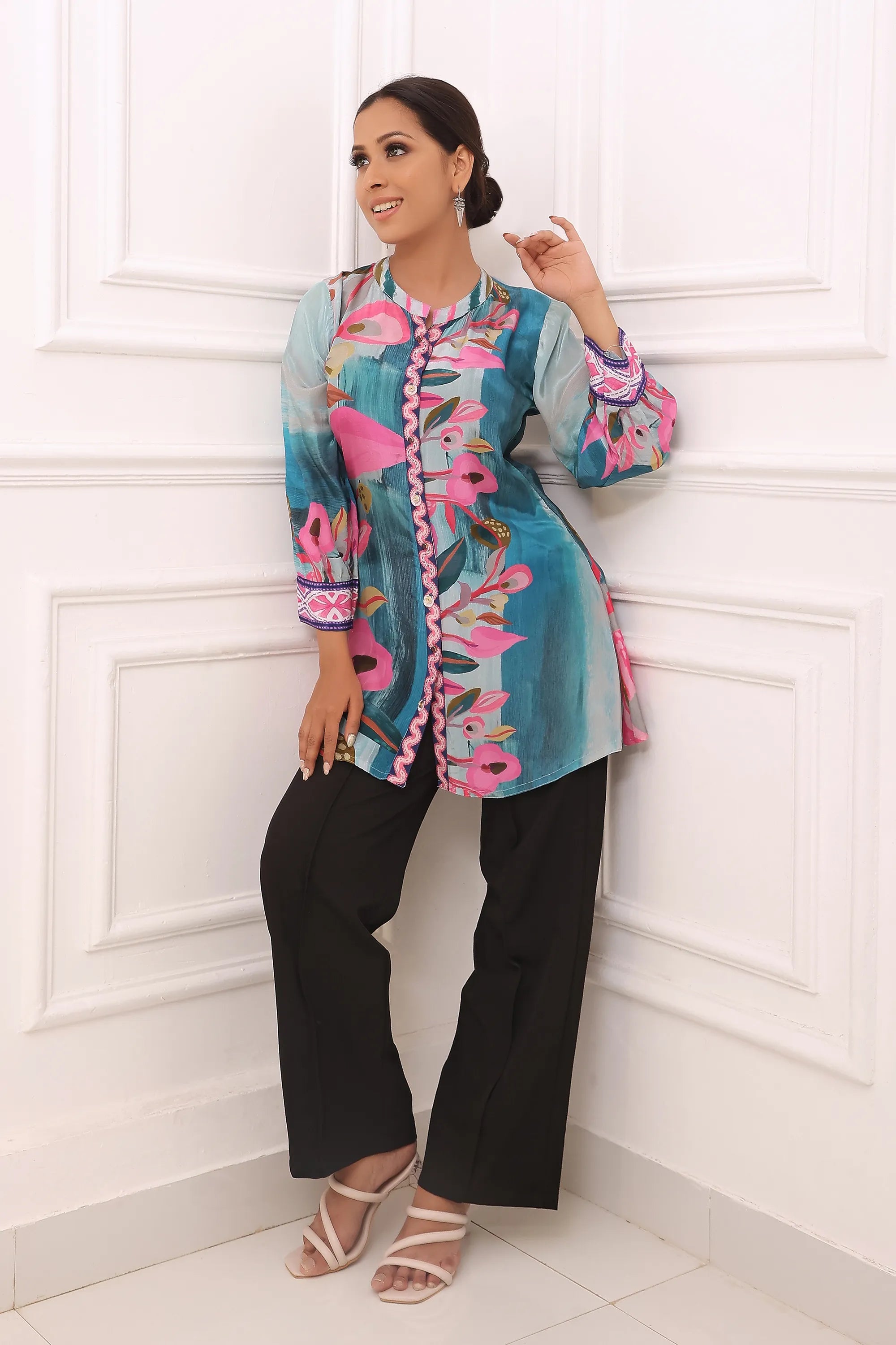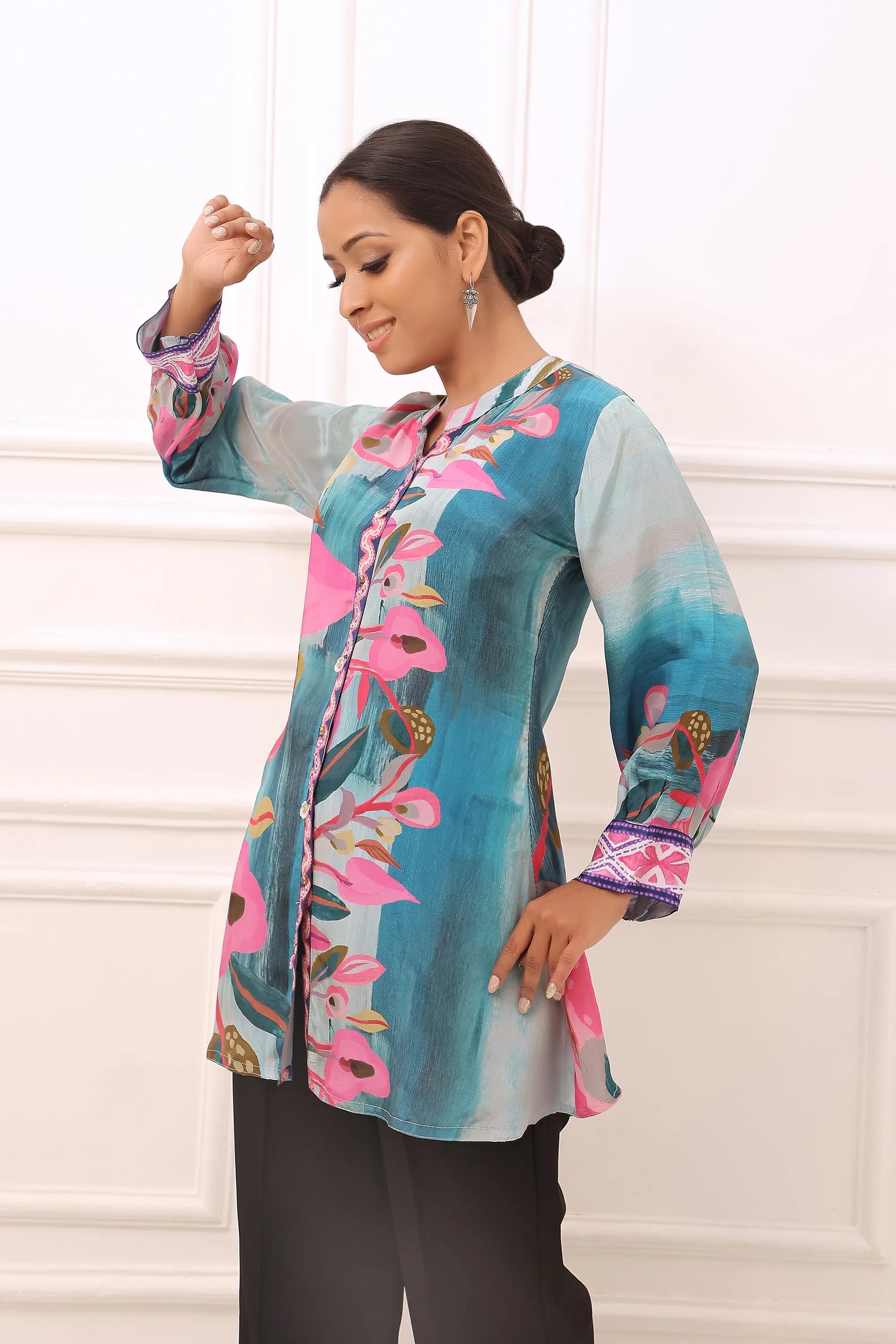 Elevate your everyday style with this Blue & Pink Tunic, adorned with a charming floral print. Designed with a mandarin collar and full sleeves with cuffs, this tunic offers a polished look while the flared hem adds a feminine touch. Crafted from soft muslin fabric, it ensures comfort and elegance, making it perfect for casual outings or relaxed gatherings.